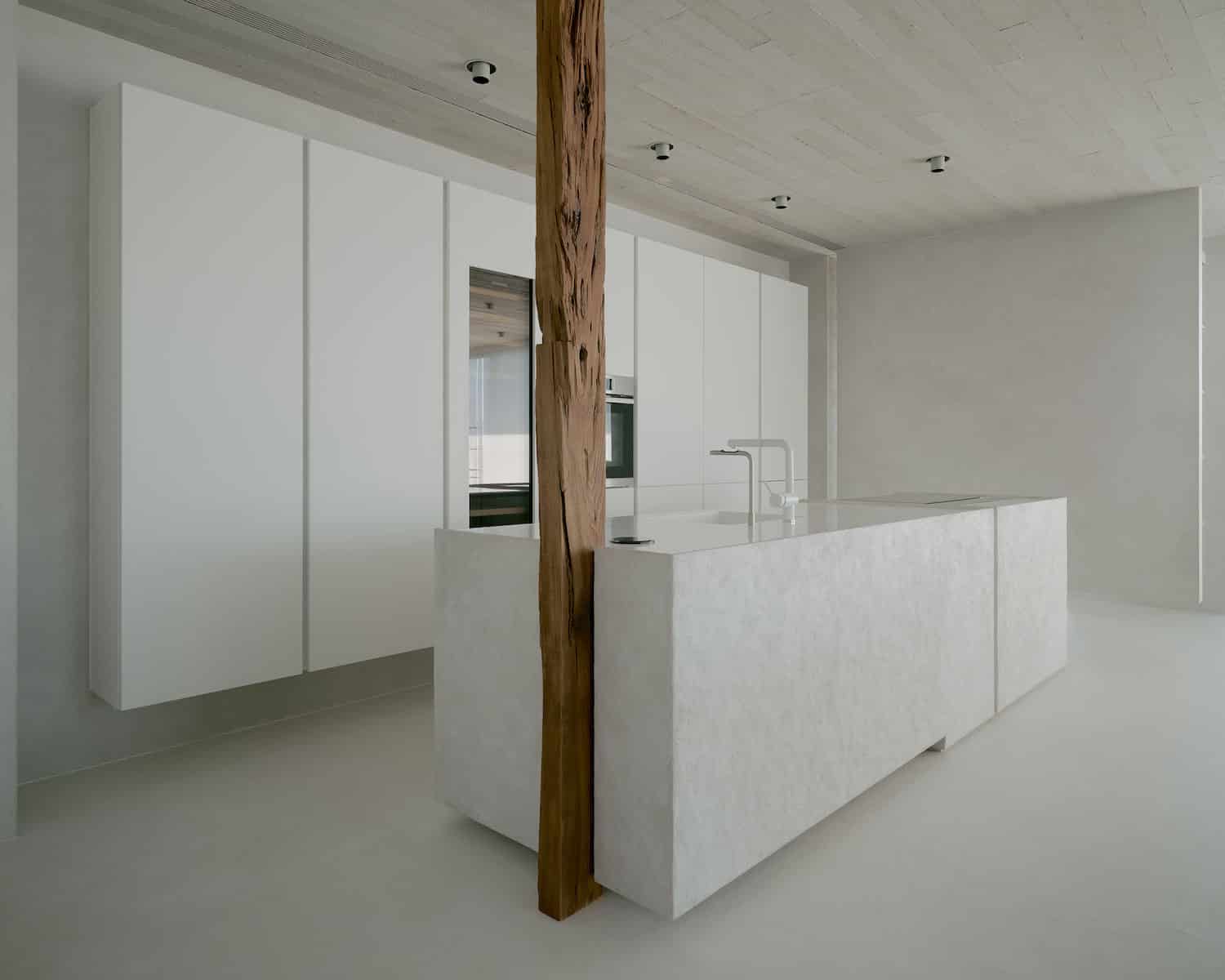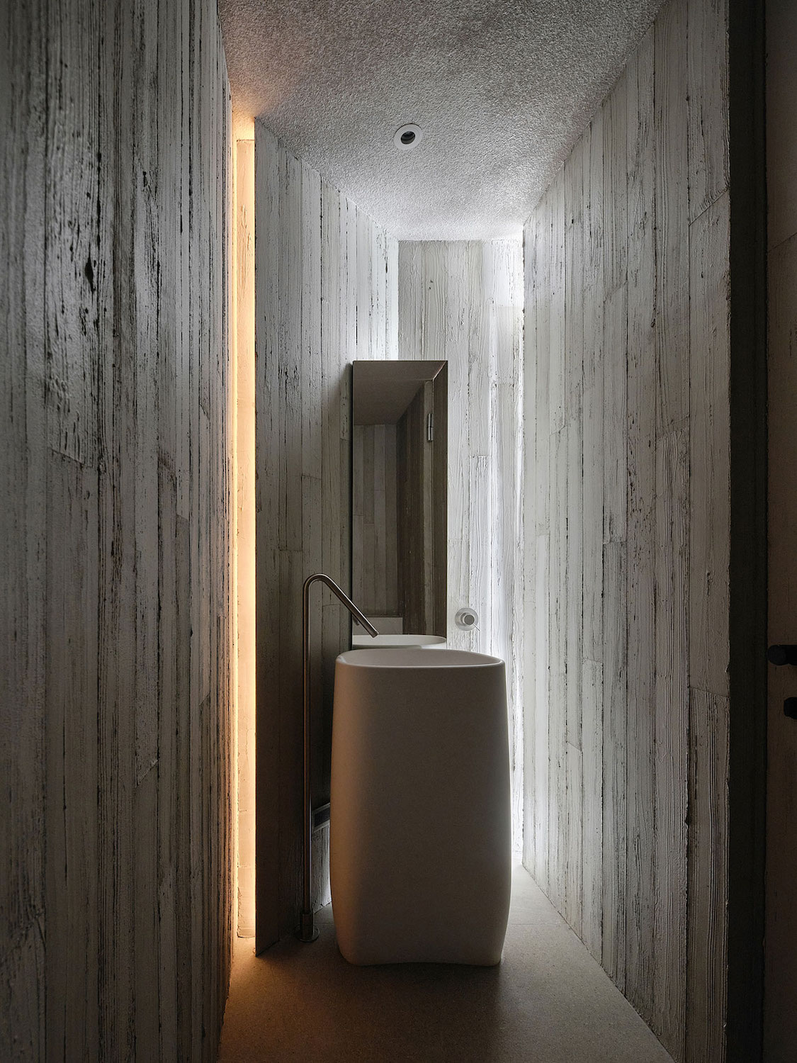 La tonalidad monocroma del cemento —solo alterada por algunos de los muebles, pero siempre en una paleta suave— transmite ese sosiego tan buscado por el inquilino. Sin embargo, lejos de resultar monolítico o de expresar frialdad, el tratamiento del material contempla distintas texturas en suelos, techos y paredes que aportan un elemento escultórico. Todo se evoca, pero no se termina de mostrar en un interior honesto y misterioso al mismo tiempo. Como decíamos al comienzo: un lugar más para el alma que para los sentidos.