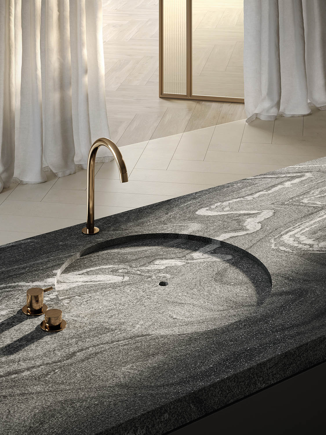 Integrada en Iris Ceramica Group, Sapienstone es una de esas marcas que ha entendido la materia cerámica como un campo de investigación continuo. Siguiendo esa premisa, la firma ha erigido su identidad reivindicando superficies capaces de asumir exigencias técnicas, culturales y estéticas que reflejan los avances del diseño actual. Es por eso que la inclusión de la nueva tecnología 4D ha supuesto una transformación profunda del porcelánico full body: las vetas, los matices y la estructura visual atraviesan toda la masa del material. Un cambio de visión que modifica la forma en que entendemos los componentes empleados en la arquitectura y el diseño.