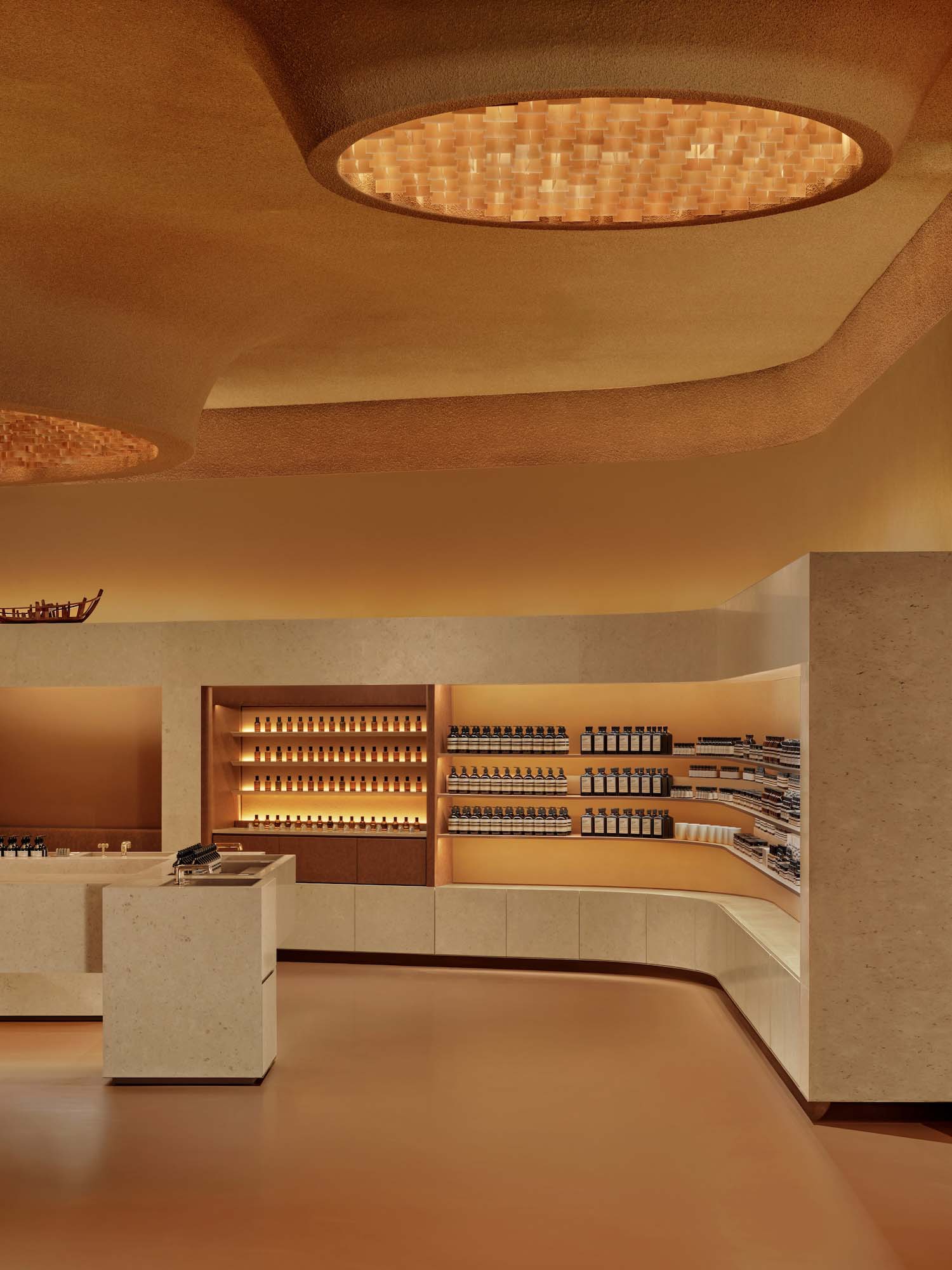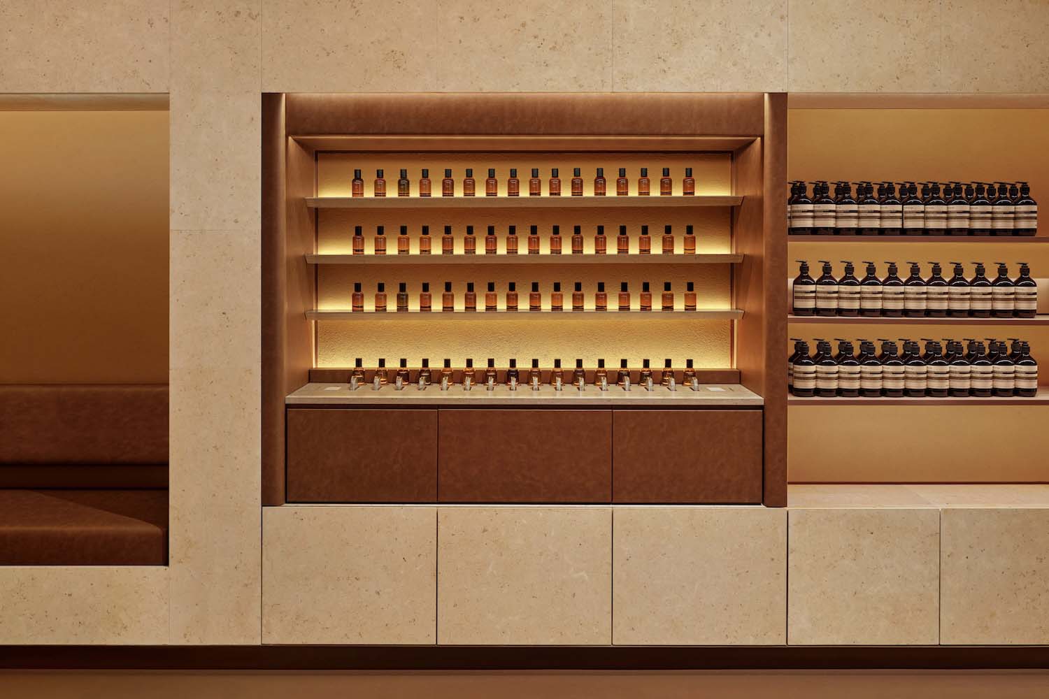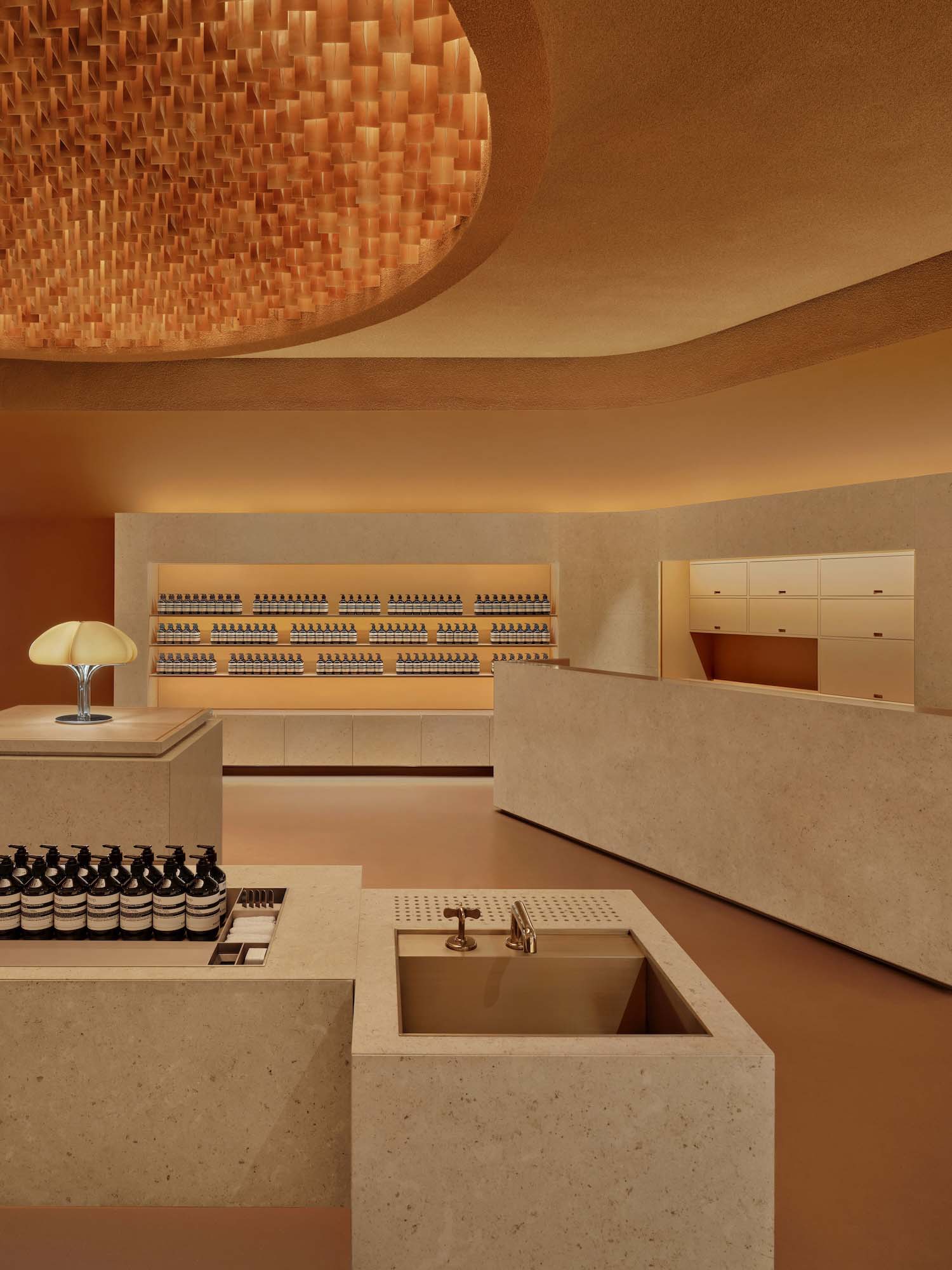 Sin embargo, la superficie de algas es el verdadero corazón del proyecto. Su tacto y su aspecto encuadran la atmósfera del conjunto: un tono translúcido que cambia con la iluminación; un poro visible cuya rugosidad ligera introduce imperfecciones controladas. Es un material experimental, sostenible y biodegradable que, en este caso, se usa con una naturalidad sorprendente. Sus pequeñas manchas se subliman con el matiz lumínico, que provoca reflejos sutiles y origina sombras suaves que suavizan la geometría del lugar. Algo que influye en el modo en que los productos de Aesop se presentan, con una sobriedad casi científica: alineados, espaciados y apoyados sobre soportes redondeados.