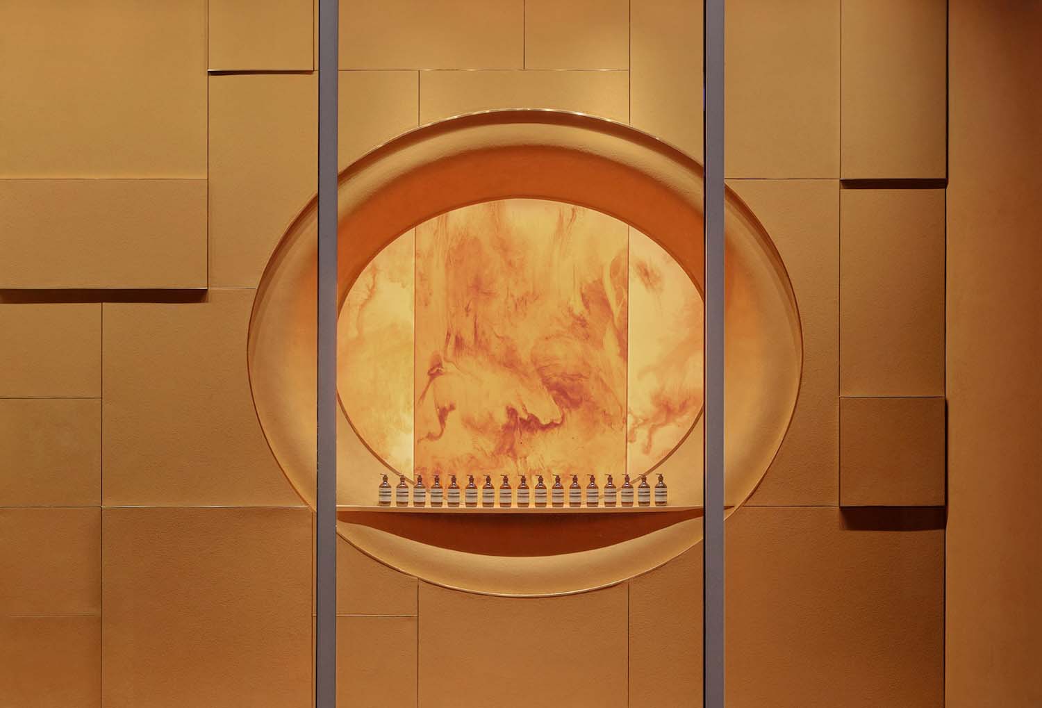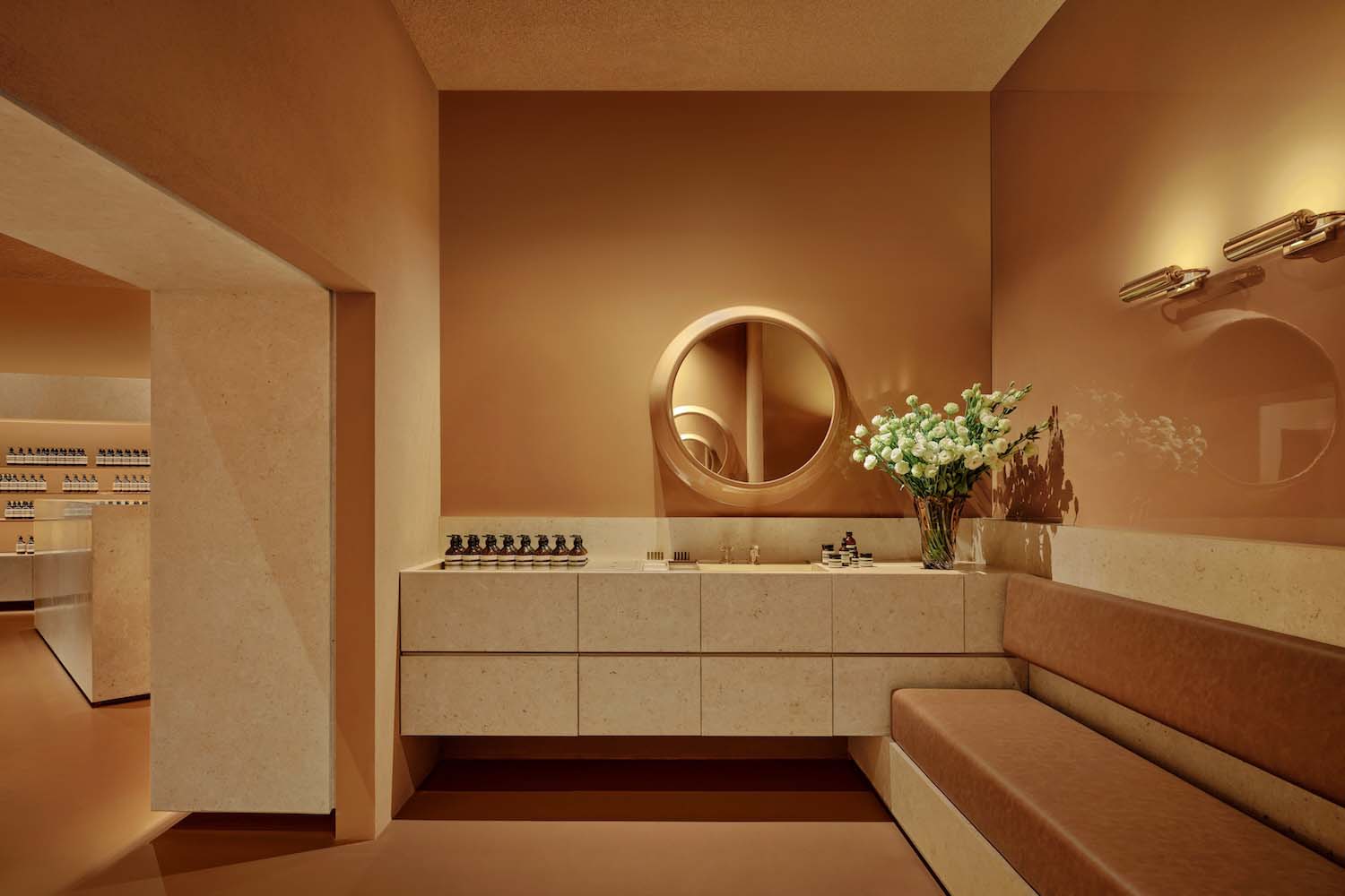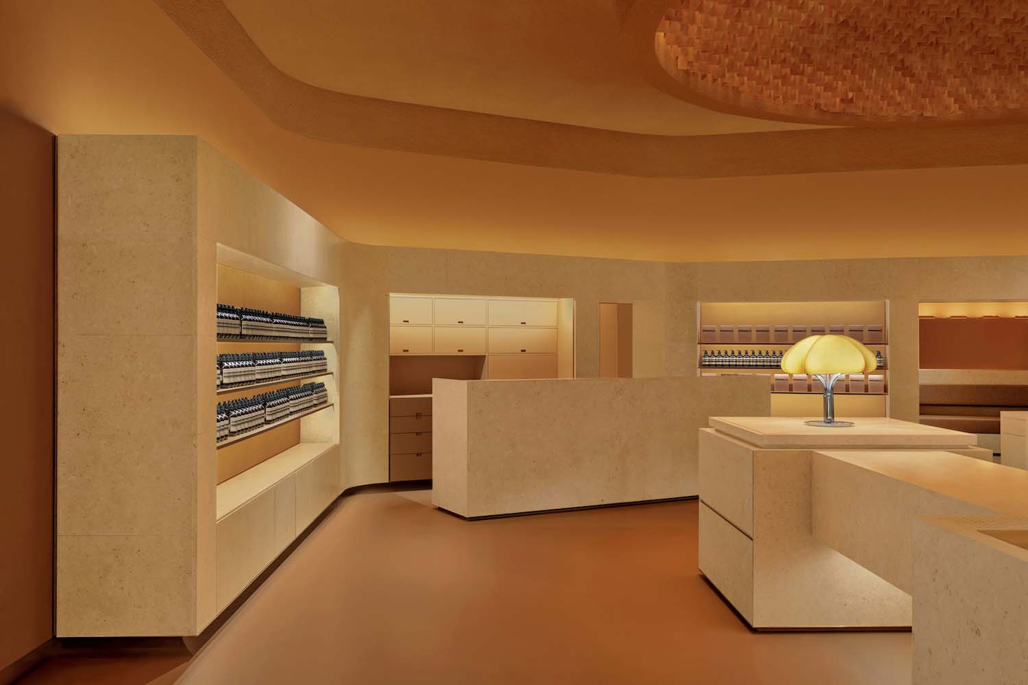 Sin embargo, la superficie de algas es el verdadero corazón del proyecto. Su tacto y su aspecto encuadran la atmósfera del conjunto: un tono translúcido que cambia con la iluminación; un poro visible cuya rugosidad ligera introduce imperfecciones controladas. Es un material experimental, sostenible y biodegradable que, en este caso, se usa con una naturalidad sorprendente. Sus pequeñas manchas se subliman con el matiz lumínico, que provoca reflejos sutiles y origina sombras suaves que suavizan la geometría del lugar. Algo que influye en el modo en que los productos de Aesop se presentan, con una sobriedad casi científica: alineados, espaciados y apoyados sobre soportes redondeados.