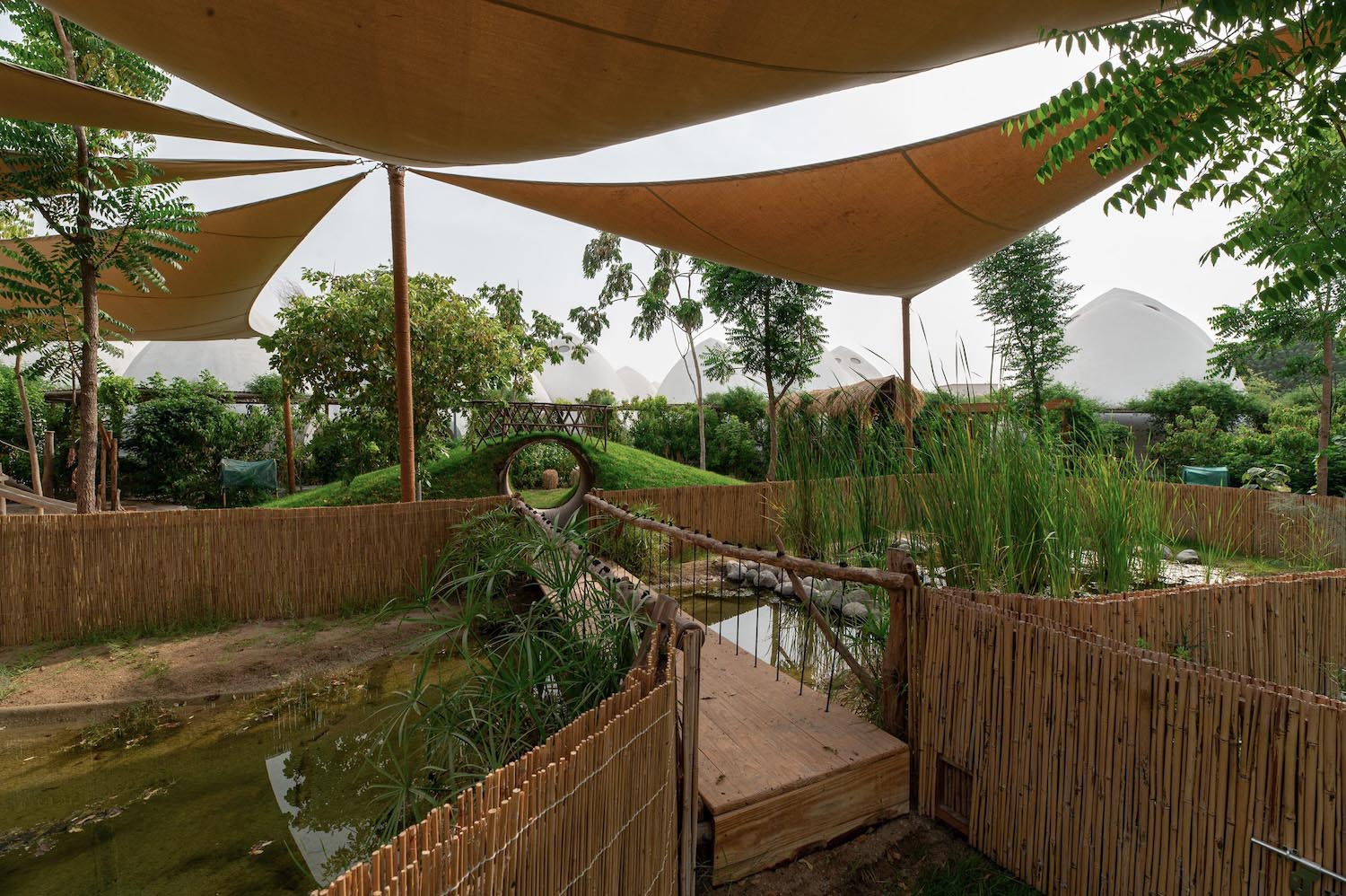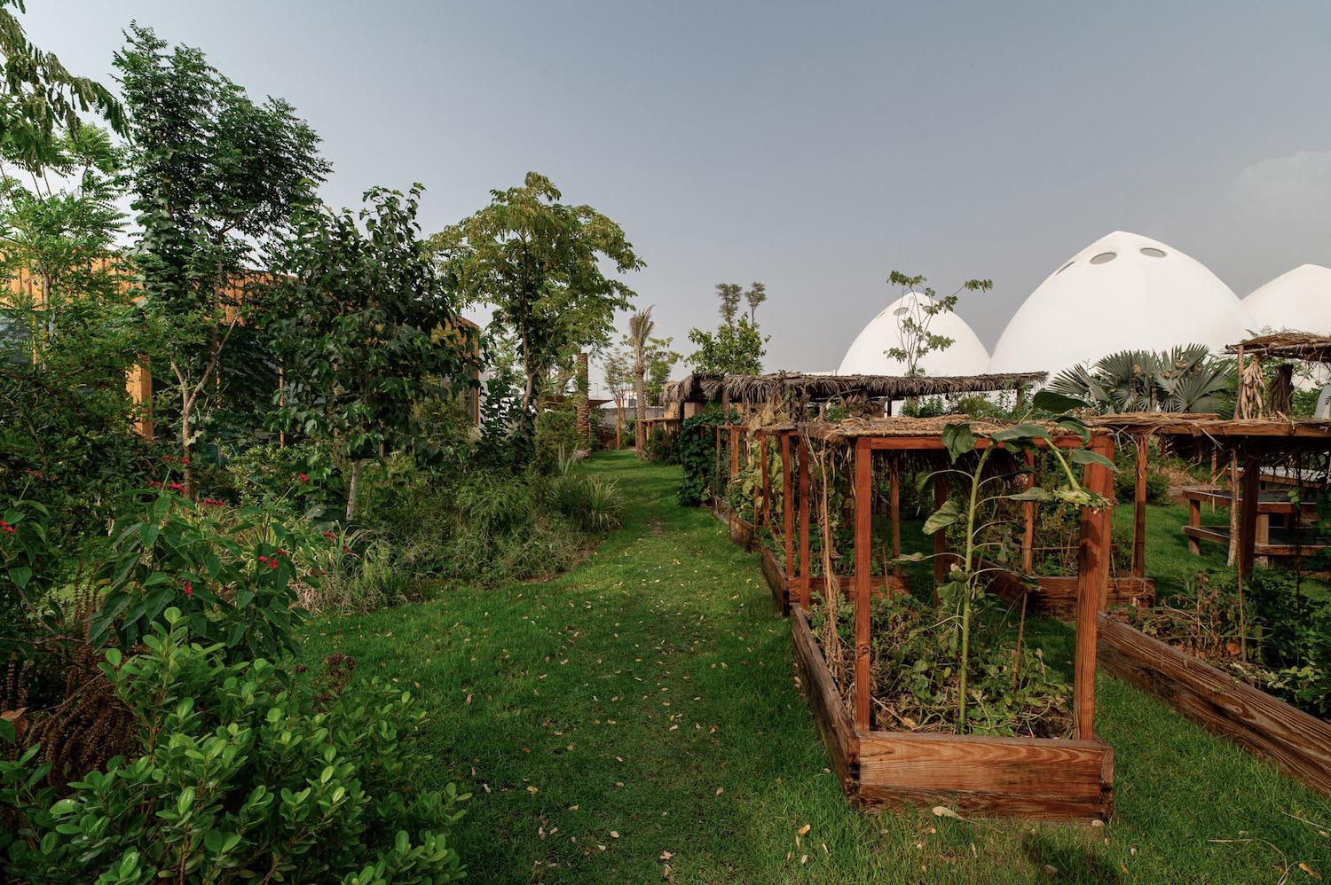 Una exploración que continúa en el vergel exterior, donde el paisaje se interconecta en senderos sinuosos que han sido trazados alrededor de los jardines y zonas de juego. Studio EMKAAN trabajó con el grupo local de actividades naturales Natura Tribe para crear y cultivar esta zona verde, además de una granja educativa que contiene huertos y lugares para gallinas y tortugas. A medida que la exuberante vegetación madura y los pequeños animales crezcan, se reforzará la colaboración y la expansión comunitaria; una serie de destrezas humanas que suelen florecer en ese rumbo cálido y curvilíneo de la creatividad escolar.