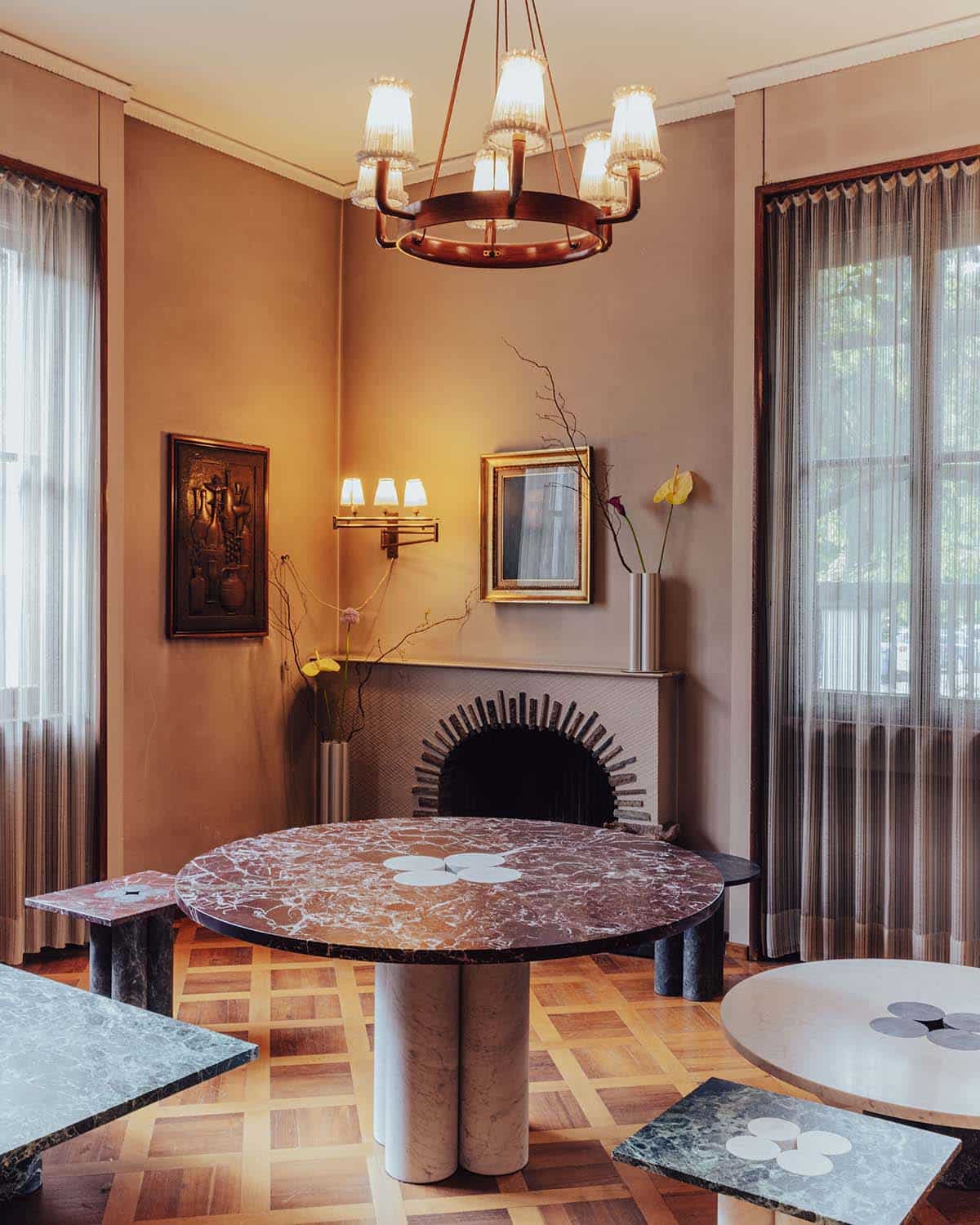 Subiendo las representativas escaleras de mármol, nogal y cristal, Kiki Goti sorprendía con Selene: un espacio liminal de contemplación que llevaba la firma de Vetralia y en el que era fácil perderse mirando su orgánico Nuphar Mirror. En esa misma planta, llamaba la atención el ejército de luminarias con forma de cascarón roto de Ryuichi Kozeki, con las que mostraba un enigma similar al de la gallina con el huevo: ¿Qué fue antes, la creación o la destrucción de la obra? Y ya en el sótano, Object of Common Interest jugaba a las muñecas rusas junto a la empresa de puertas textiles Dooor, llevándonos por una instalación donde el color va tergiversando los escenarios en los que se presentaban sus piezas sedentes.