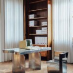 El contexto del interior resultaba idóneo para establecer sinergias con la vanguardia creativa de hoy, como hacían las mesas Sekka de Tino Seubert en colaboración con el estudio londinense Agglomerati. Piezas geométricamente contundentes que conversaban con la atmósfera racionalista de toda la vivienda. Ocurría igual en uno de los pasillos con la lámpara Flamingo de Giopato & Coombes. Gravedad poliédrica como oda al prisma. Y en el mismo nivel, el legado de Castilla y La Mancha quedaba bien representado por la maestría de Worn Studio, quien introducía en una de las estancias su Bows collection: lazos y artesanía hablando un mismo idioma matérico. ¿Quién dijo que el mueble no pudiese ser coquette?