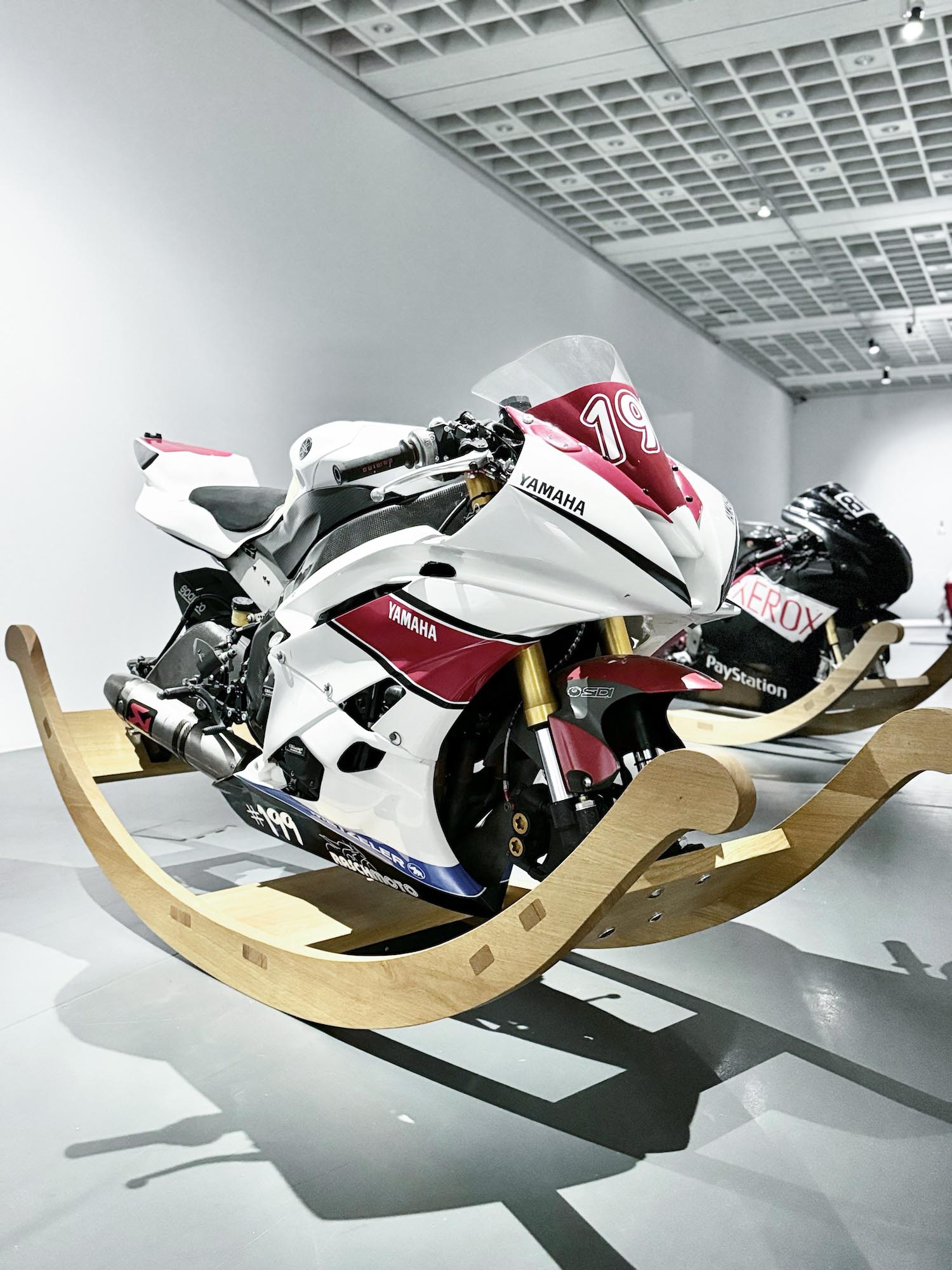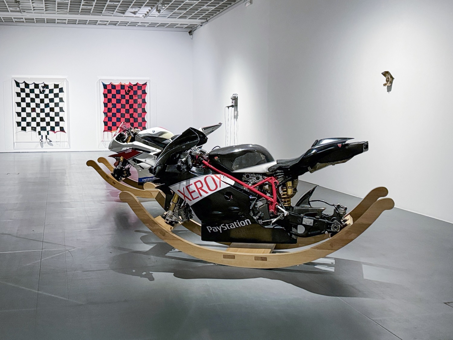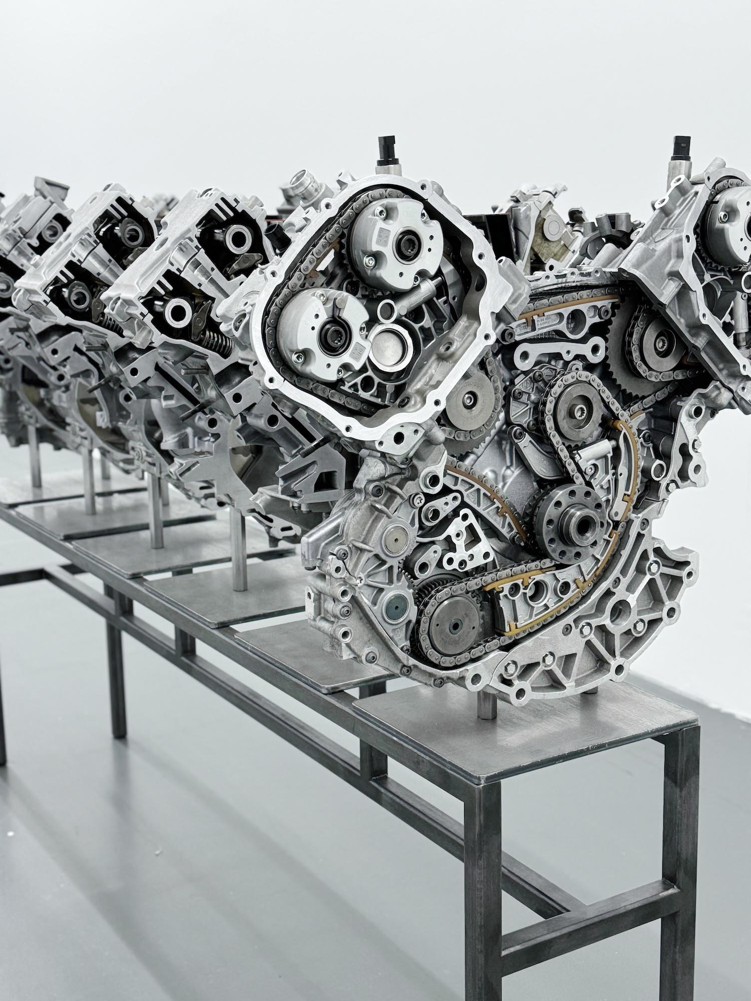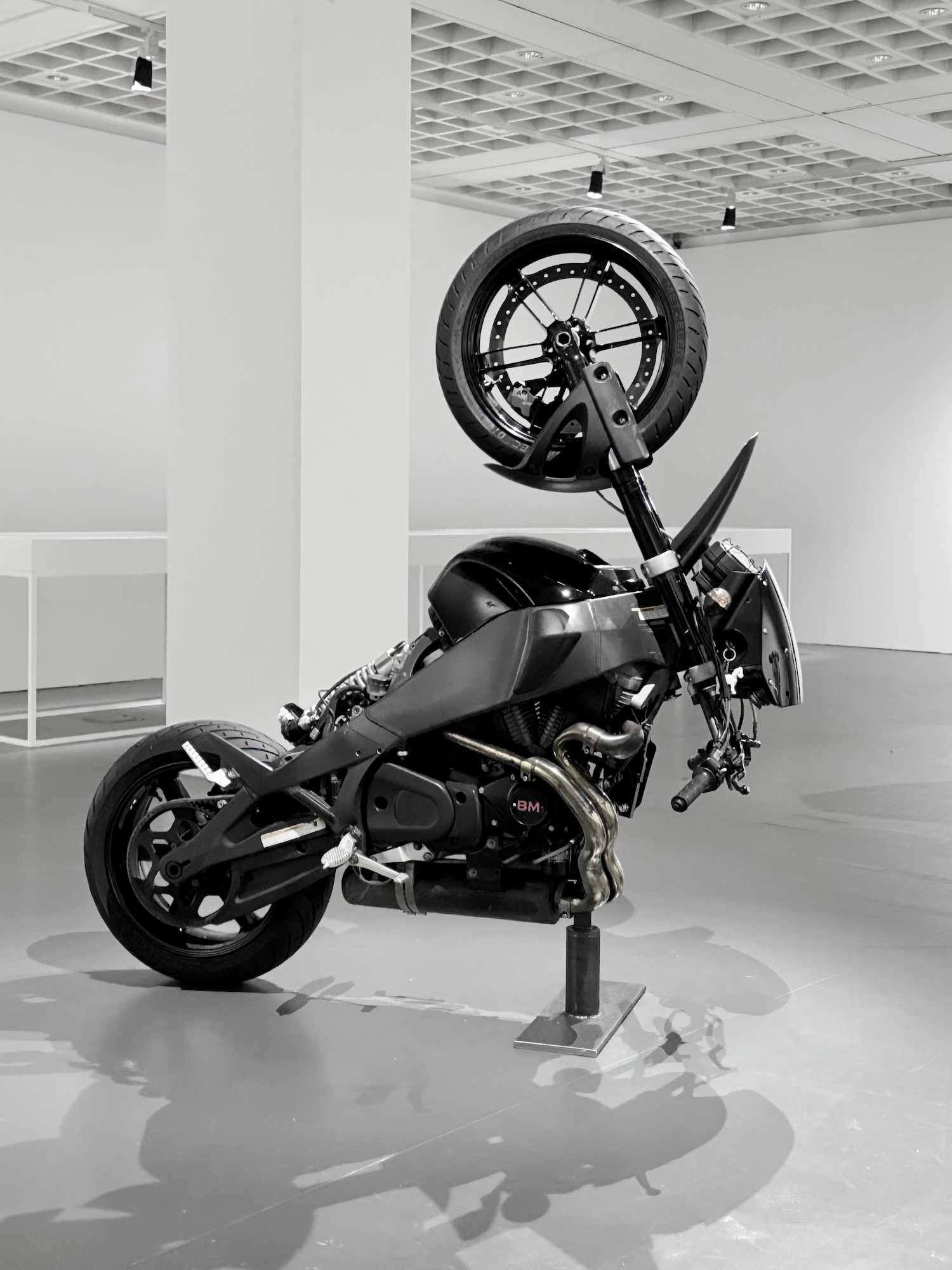 Con mano experta, Bircken doma la potencia desbocada de la moto Paystation y la transmuta en un balancín estático y onírico. Su melliza, Lop Lop, completa este díptico sobre subversión y modificación. Estos fantasmas de máquina infantilizados rompen la narrativa de velocidad para tornarse objetos de contemplación y perplejidad. Parte de la rebeldía de Bircken radica en deshacer el discurso histórico del héroe, del poder o del progreso. En Gebrochenes Pferd (Caballo roto) —un motor clonado en varias versiones idénticas o cortado en lonchas— fractura la tradición escultórica del caballo ecuestre, símbolo clásico de dominio y conquista.