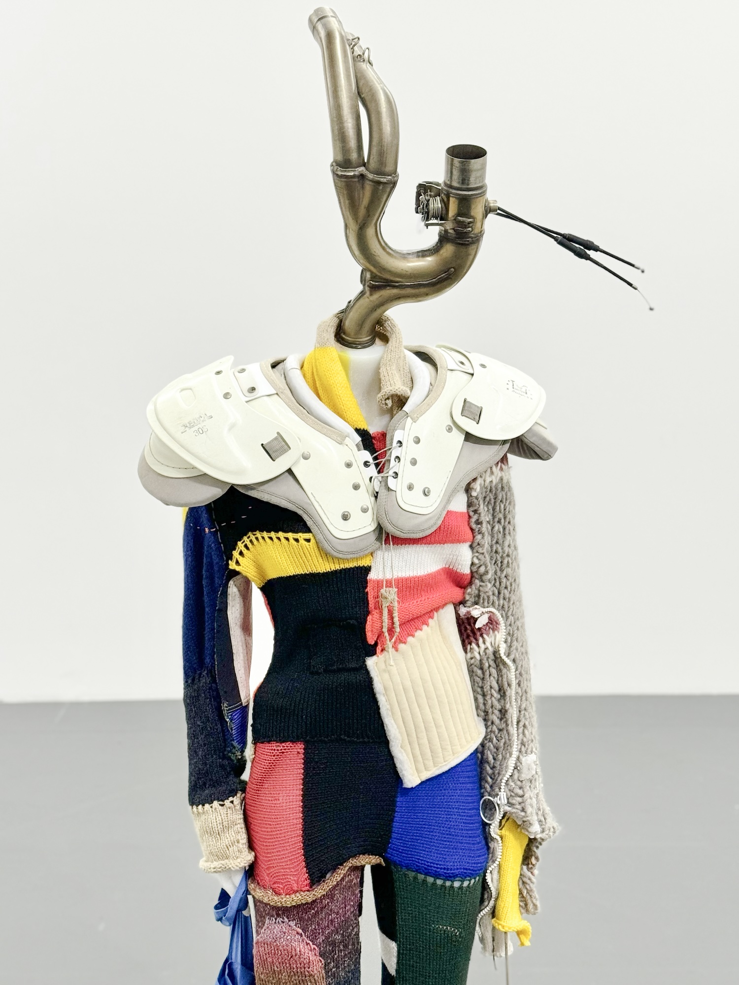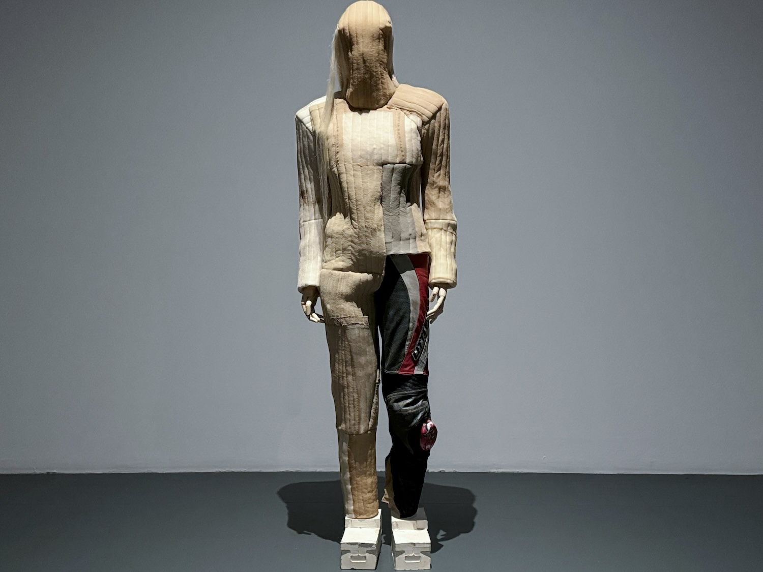 De esta fusión surge la tensión entre la ropa que protege o seduce y la que resurge distorsionada, monstruosa, como piel artificial. En obras como Deflated Figures —maniquíes de látex desinflados con bordados de músculos, genitales y huesos— la distopía se corporeiza: la moda se convierte en cadáver y en reverso del sueño biónico. A Bircken le interesa el cuerpo como campo de batalla de identidades, géneros y poderes, y nos muestra que seguimos siendo humanos incluso cuando nuestro cuerpo puede reemplazarse, desmontarse y rearticularse como escombros mecánicos.