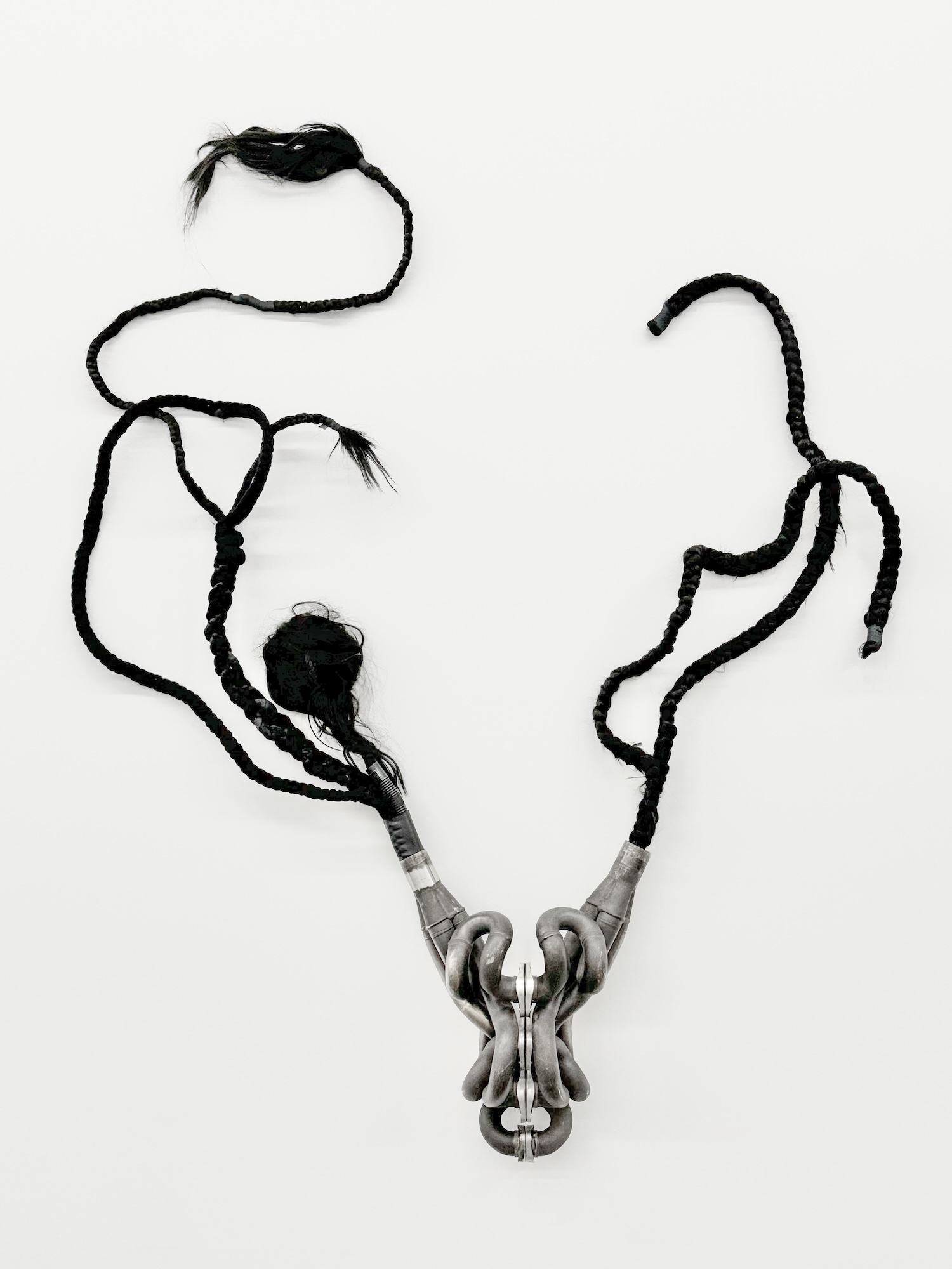 En ese terreno ambiguo donde lo humano se descompone y se reensambla, Bircken construye su poética del monstruo cotidiano mediante esculturas que respiran ecos de carne, motor, piel, resina, tuberías y ropa usada. Y aunque su trabajo remite a lo vulnerable, también deslumbra por su audacia: en sus híbridos late un humor crítico salvaje y una ironía sutil. En el bestiario posindustrial de la artista conviven piezas como Many Folds —tubos de escape entrelazados con pelo sintético, erigiendo en la pared un singular aparato reproductor femenino enorme—, que parece celebrar y denunciar a la vez la sexualidad como maquinaria y el deseo transfigurado en circuito.