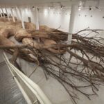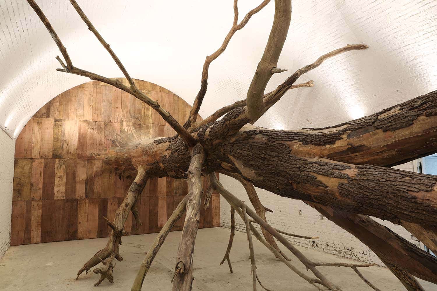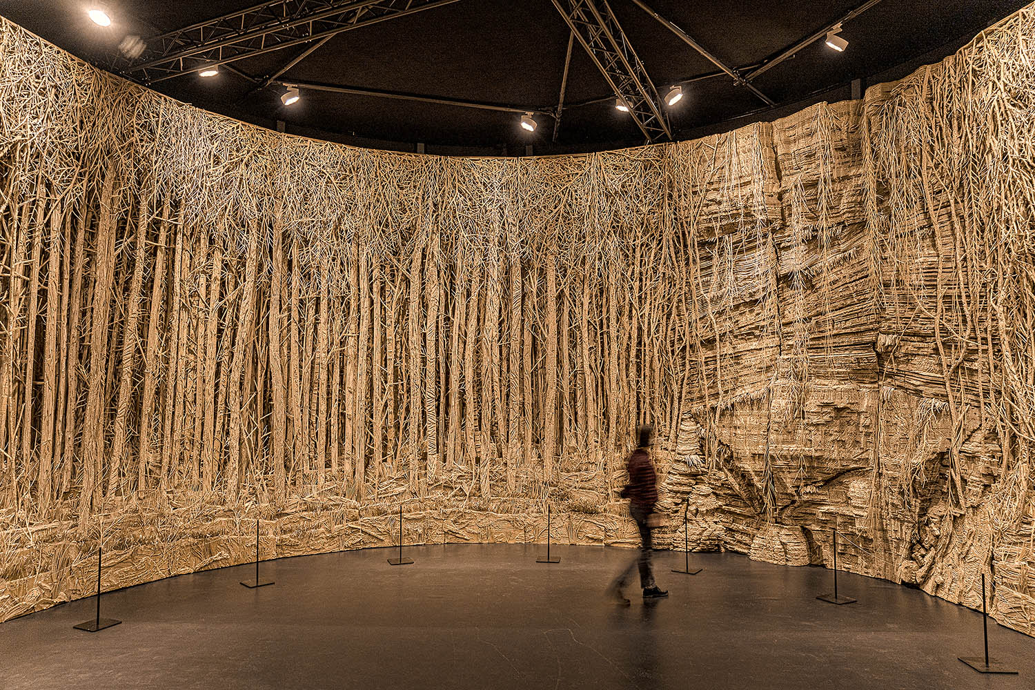 Eva Jospin o el propio Giuseppe Penone también realizan una aproximación a los árboles desde una perspectiva diferente. En Panorama, Jospin elabora una técnica para reproducir la textura de un bosque sobre una superficie de cartón. La impresión panorámica del mural absorbe al visitante y consigue hacernos olvidar que se trata de planchas para embalar y montar cajas. El efecto producido es similar al de las esculturas que Penone moldea en metal con aspecto de árboles desnudos. El artista italiano experimenta con la forma de los troncos —y con frutos de piedra que desafían visualmente la gravedad— para jugar a confundirnos —igual que Eva Jospin— sobre lo que estamos percibiendo.