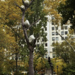 Javier Riera, en cambio, prefiere optar por un modelo a medio camino entre lo real y lo ilusorio. Su trabajo se centra en usar los árboles como soporte para proyectar volúmenes y geometrías abstractas. Los polígonos y poliedros contrastan enormemente con los orgánicos contornos de las copas, que pasan a ser objetos ficticios. Demasiado presentes para parecer falsos, demasiado volátiles para ser posibles.