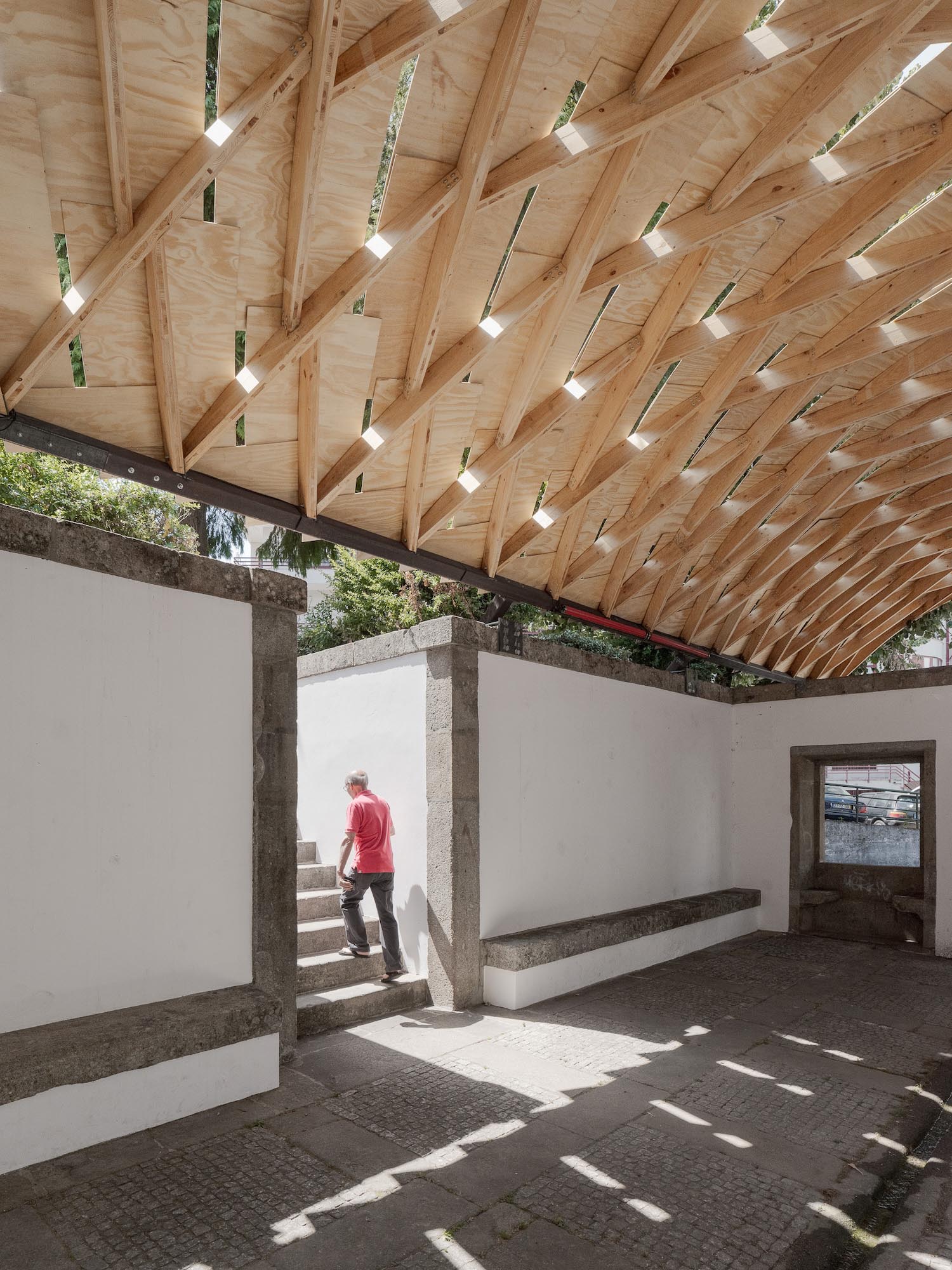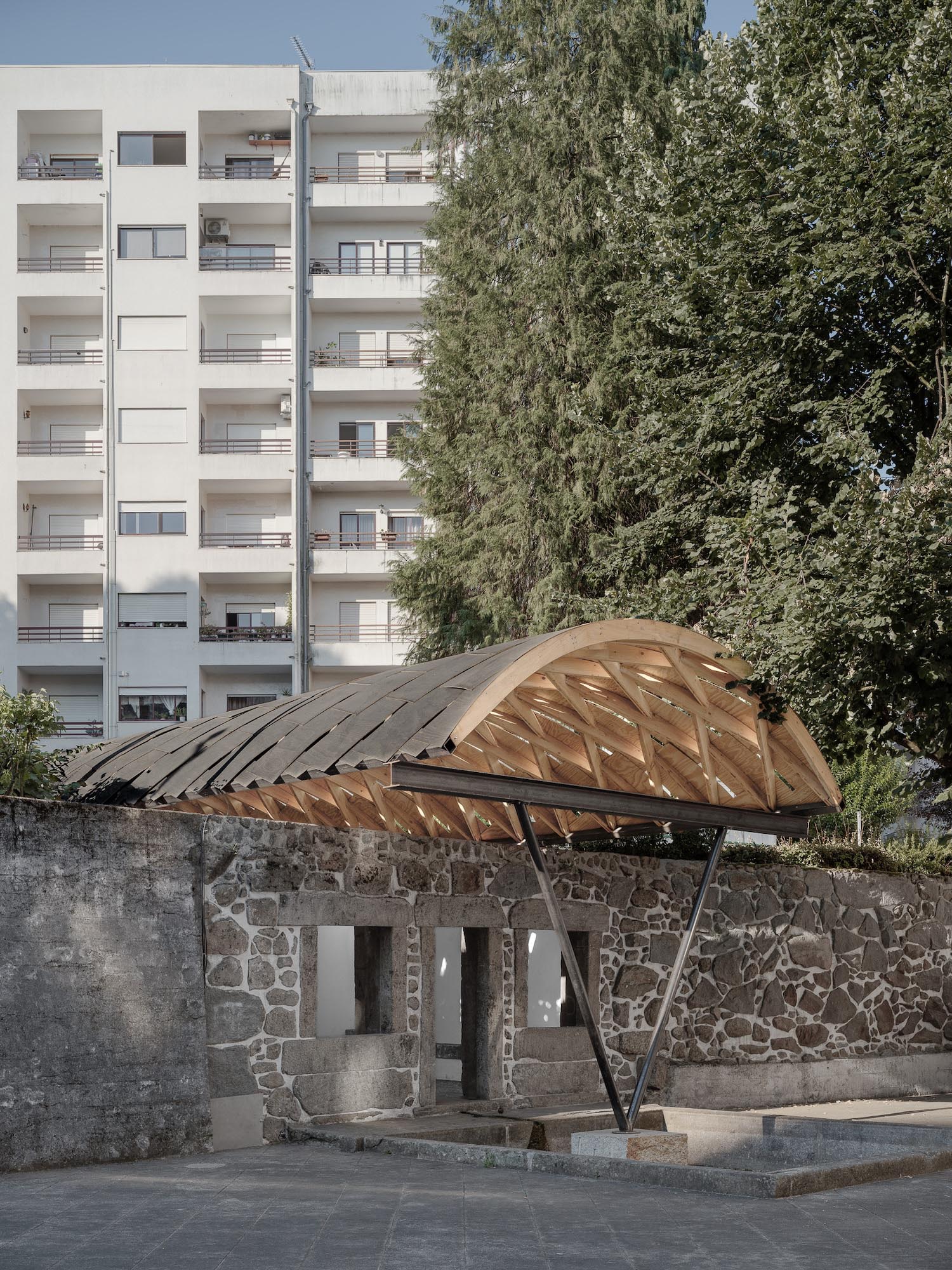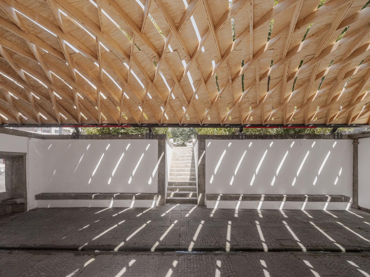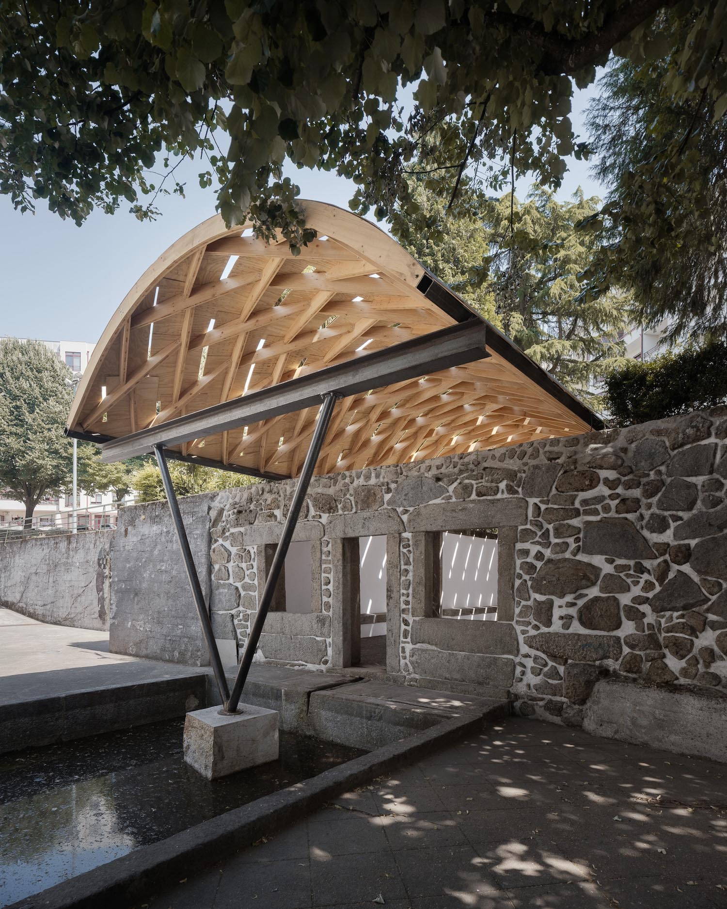 La solución que el arquitecto gallego ha hallado para resguardar la fuente de Braga parece bastante clásica en esencia: una bóveda de medio cañón que recuerda a las galerías renacentistas. El planteamiento parece que busca manipular esta idea, proponiendo una cúpula que se percibe más ligera por estar enteramente ensamblada en madera. Una acción que permite la entrada de luz hacia dentro o que vuela más allá de la huella del volumen sobre el que se apoya.