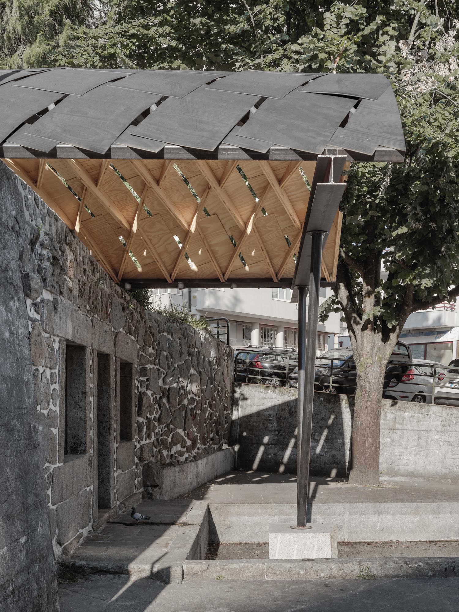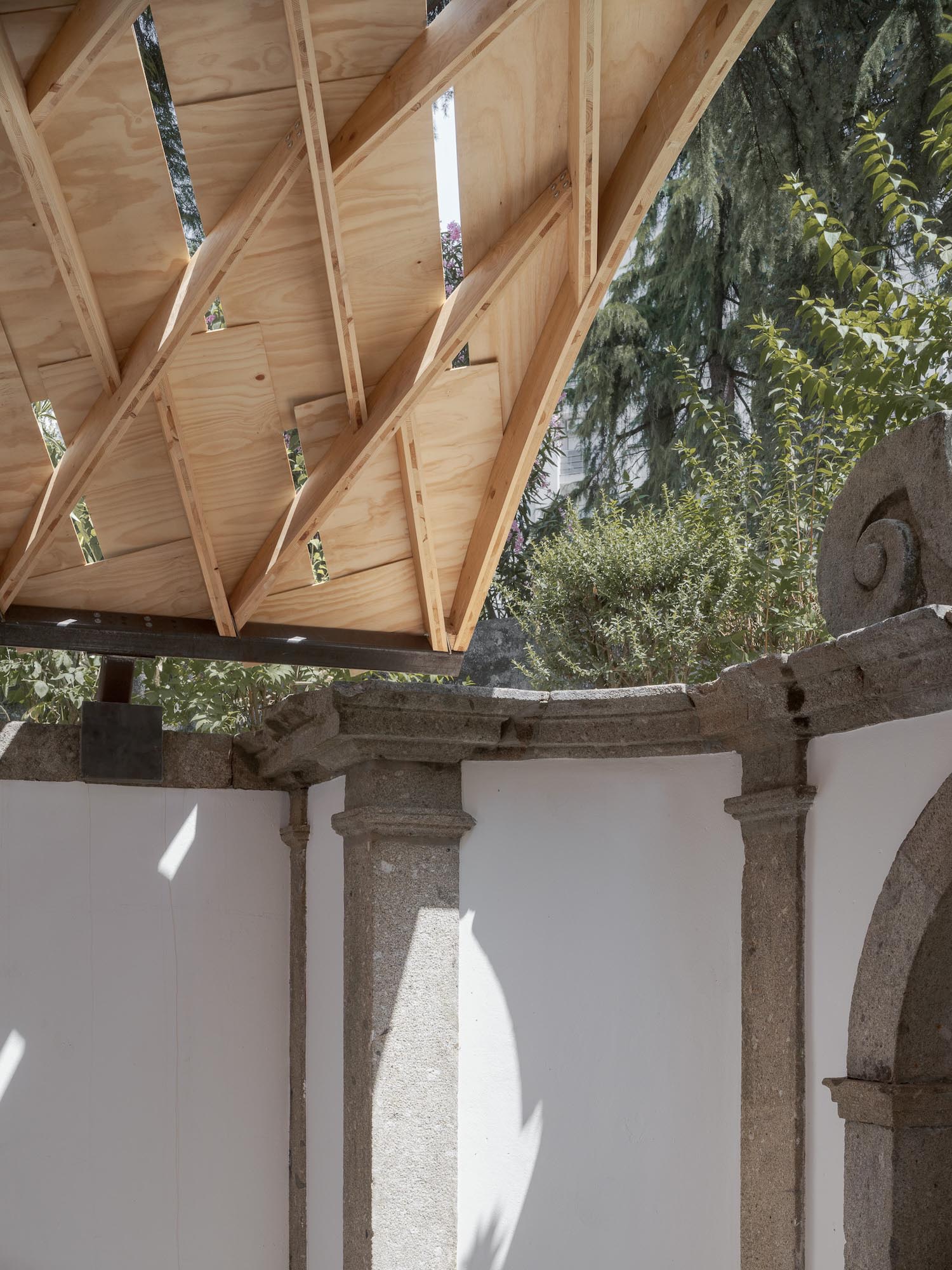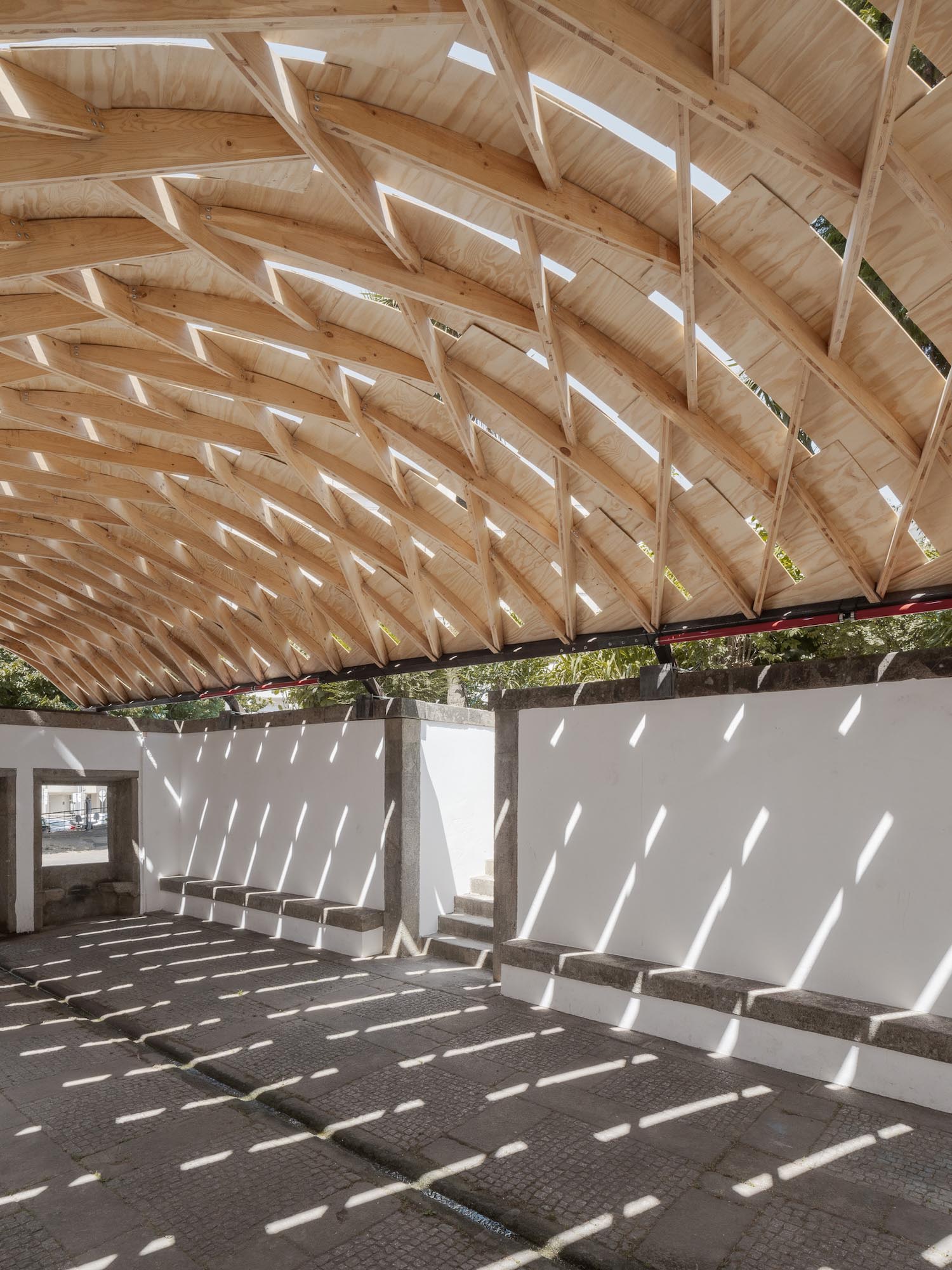 La solución que el arquitecto gallego ha hallado para resguardar la fuente de Braga parece bastante clásica en esencia: una bóveda de medio cañón que recuerda a las galerías renacentistas. El planteamiento parece que busca manipular esta idea, proponiendo una cúpula que se percibe más ligera por estar enteramente ensamblada en madera. Una acción que permite la entrada de luz hacia dentro o que vuela más allá de la huella del volumen sobre el que se apoya.