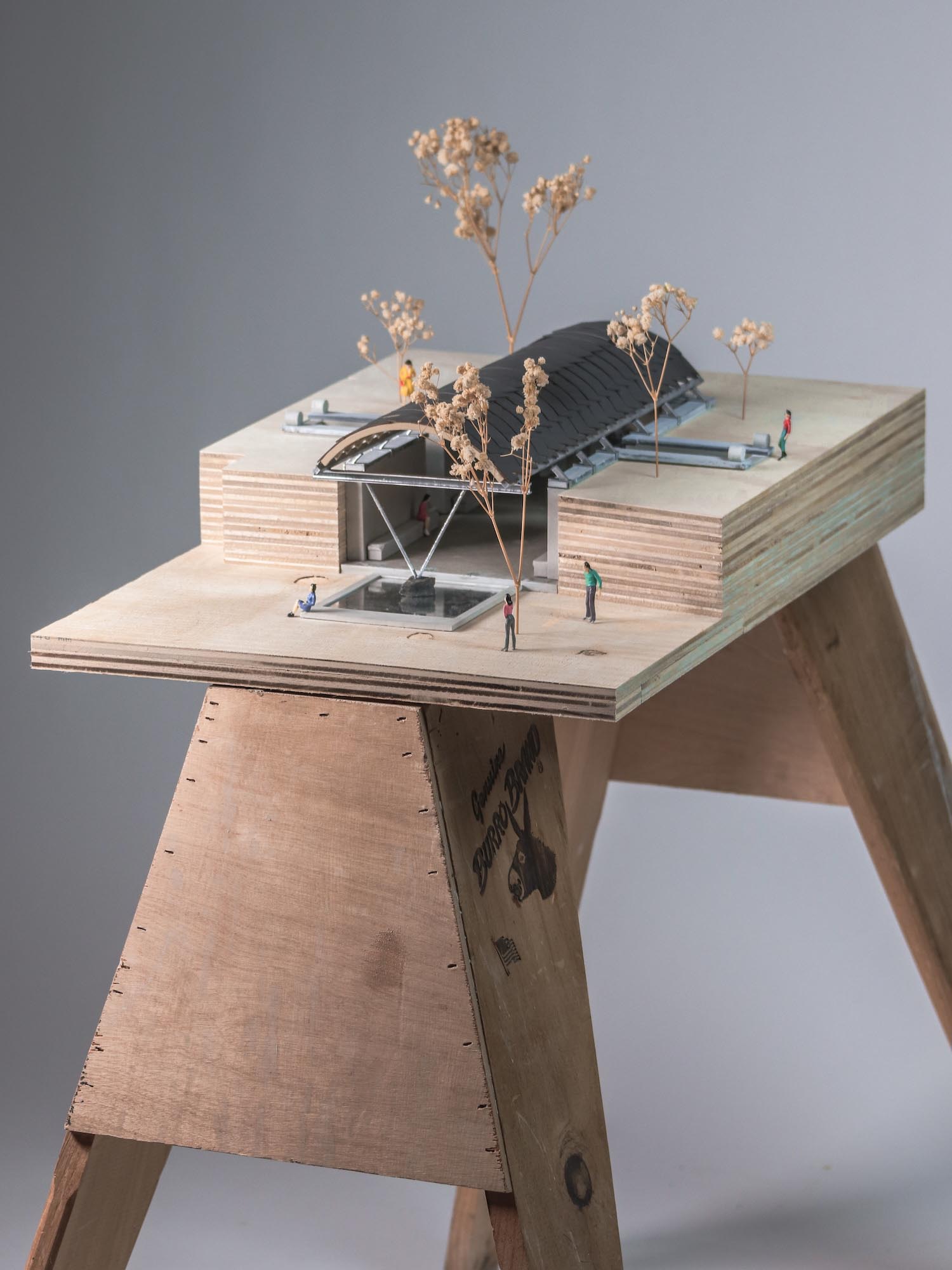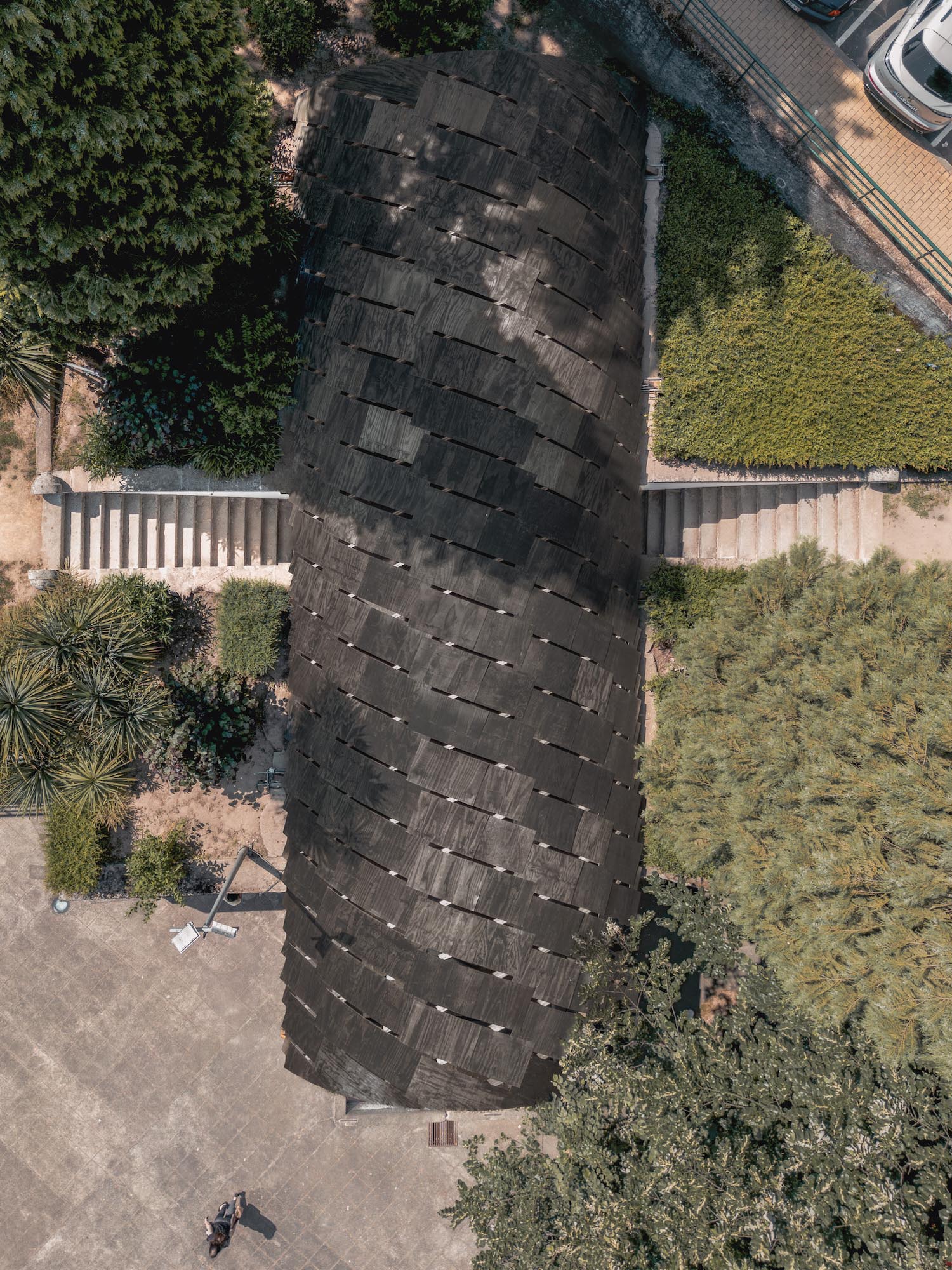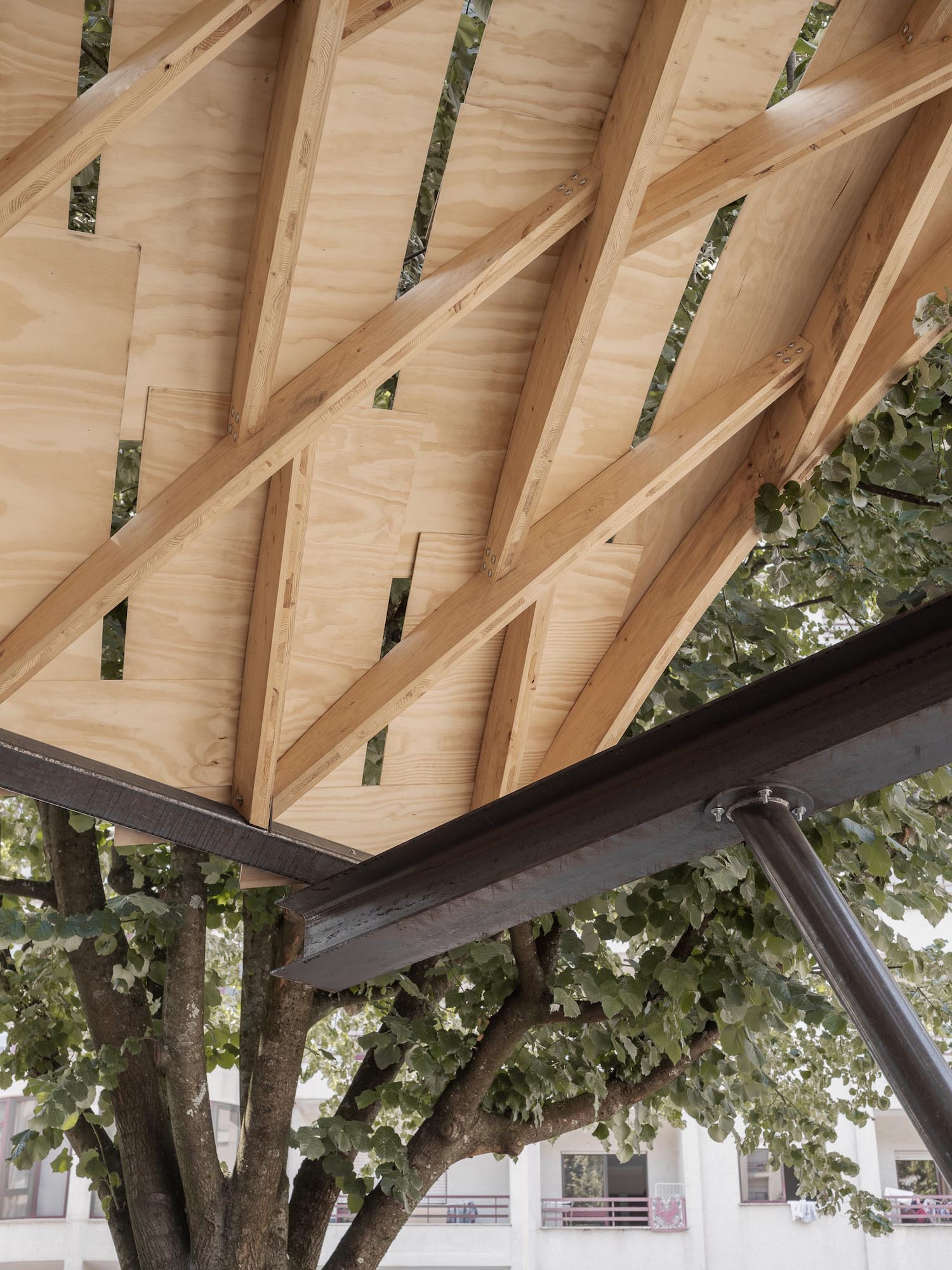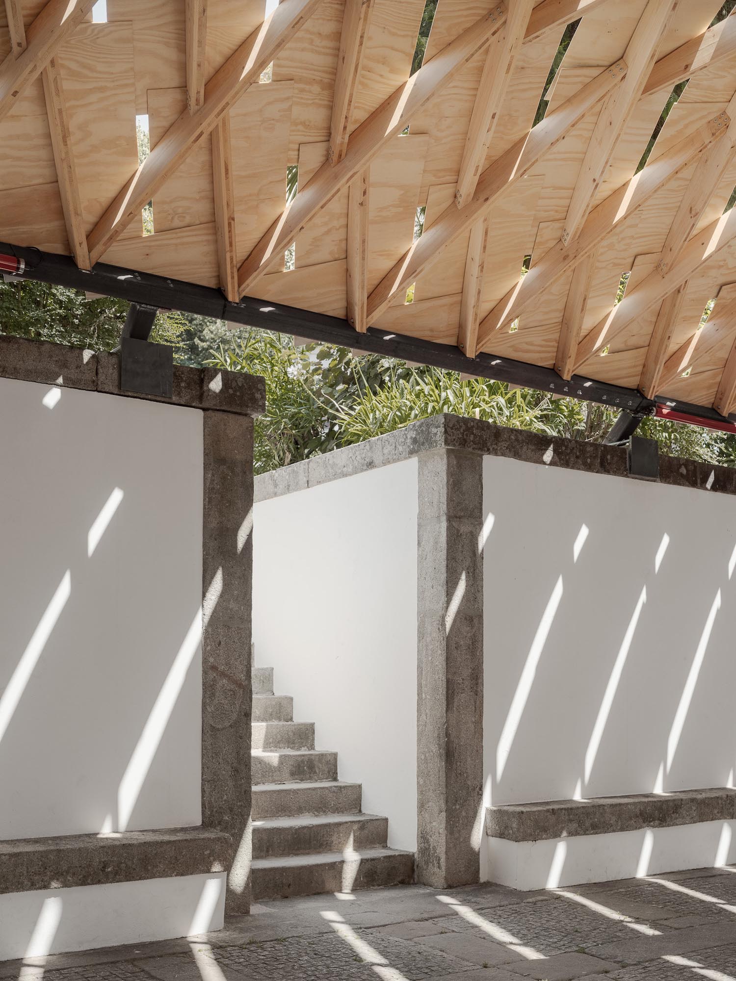 La solución que el arquitecto gallego ha hallado para resguardar la fuente de Braga parece bastante clásica en esencia: una bóveda de medio cañón que recuerda a las galerías renacentistas. El planteamiento parece que busca manipular esta idea, proponiendo una cúpula que se percibe más ligera por estar enteramente ensamblada en madera. Una acción que permite la entrada de luz hacia dentro o que vuela más allá de la huella del volumen sobre el que se apoya.