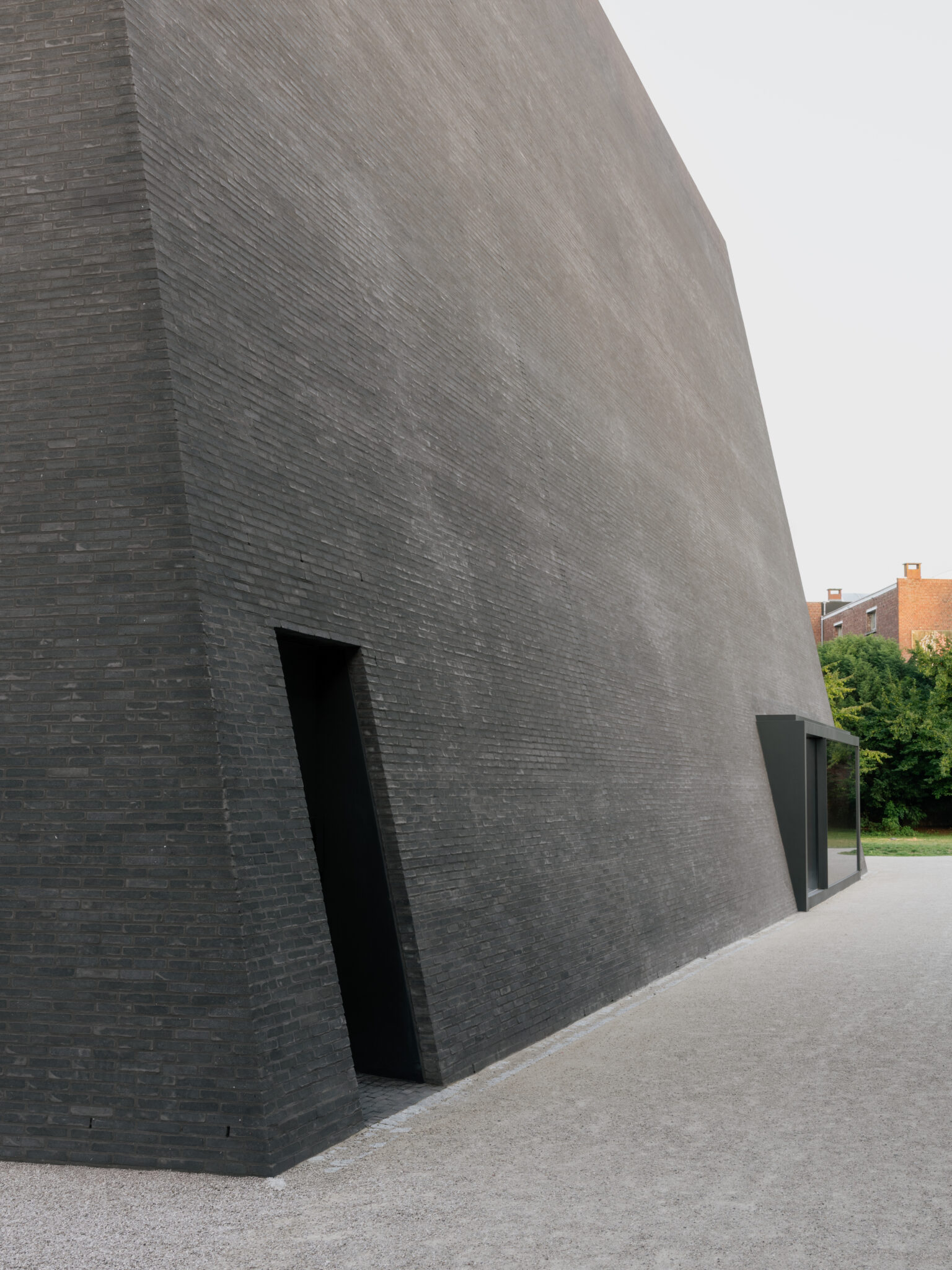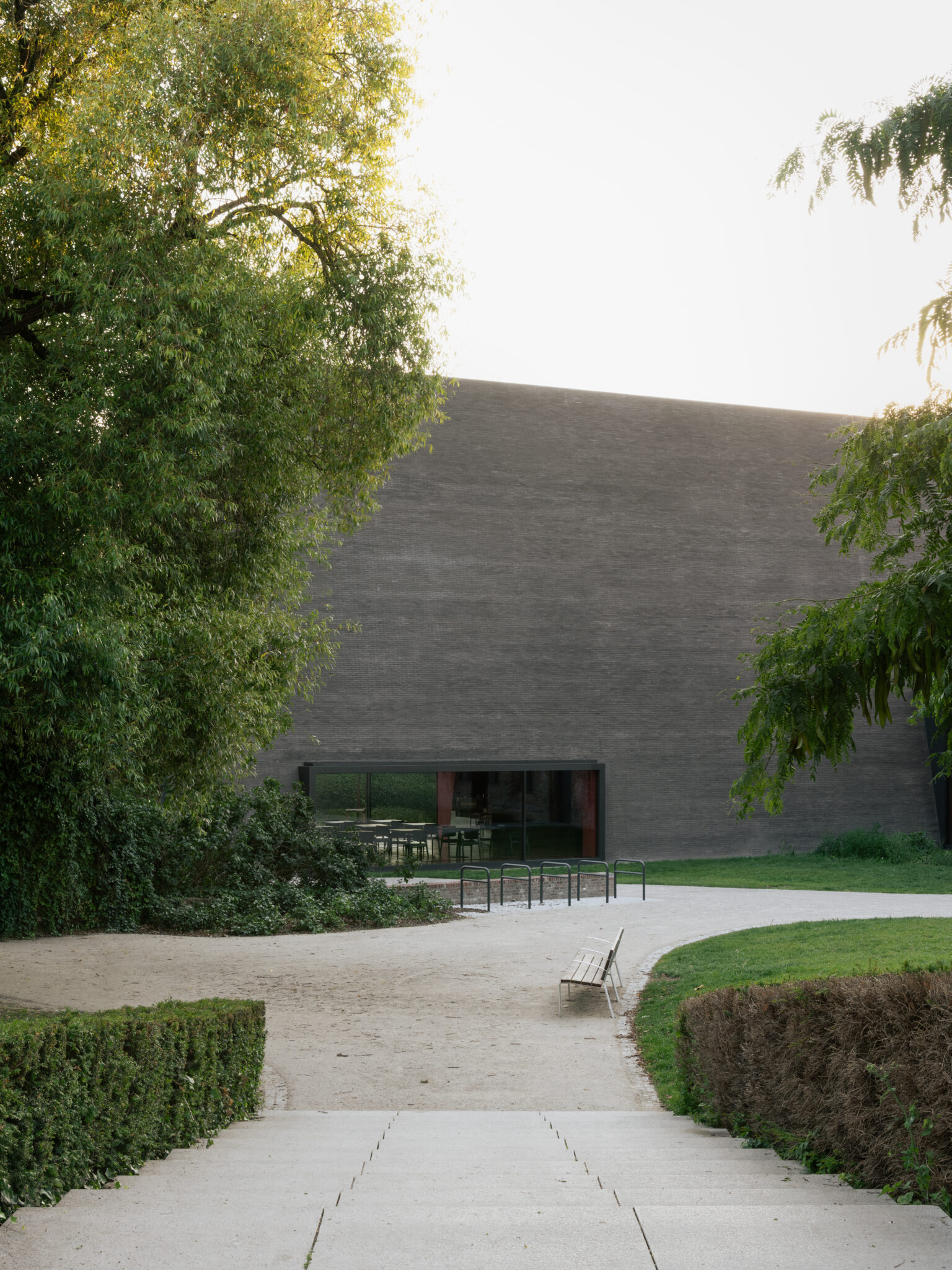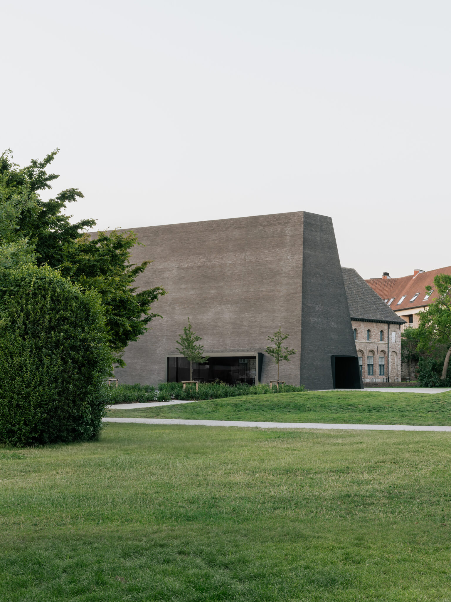 Y en superficie junto al parque, los arquitectos han logrado erigir un nuevo pabellón que actúa como bisagra entre pasado y presente; su silueta, definida por dos planos inclinados, rememora las cubiertas históricas de Flandes. Su implantación ortogonal refuerza el diálogo con el conjunto sin recurrir a la imitación, revestido con ladrillos de tonalidad oscura que han sido fabricados a partir de elementos reciclados. La construcción se afirma como una pieza contemporánea autónoma, aunque con una especificidad exacta que la integra en el contexto de la ciudad. Además, su utilidad como restaurante y bar refuerza la vocación pública y cívica del nuevo museo, convirtiéndolo en una zona de encuentro más allá de la experiencia expositiva.