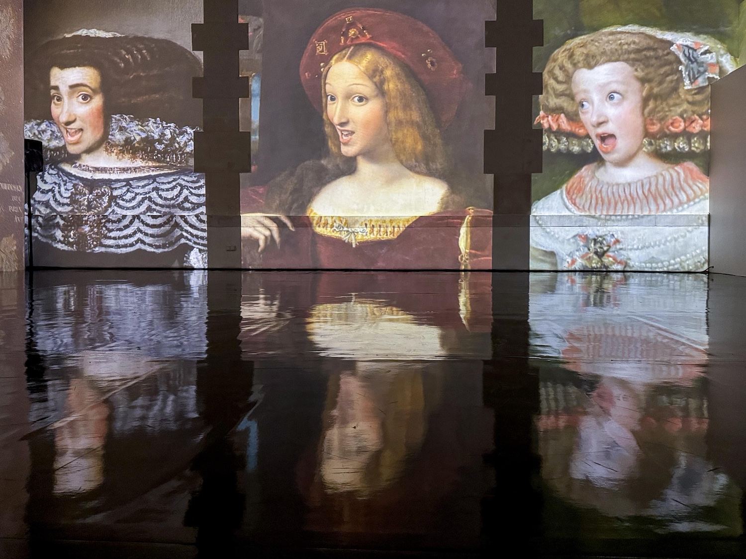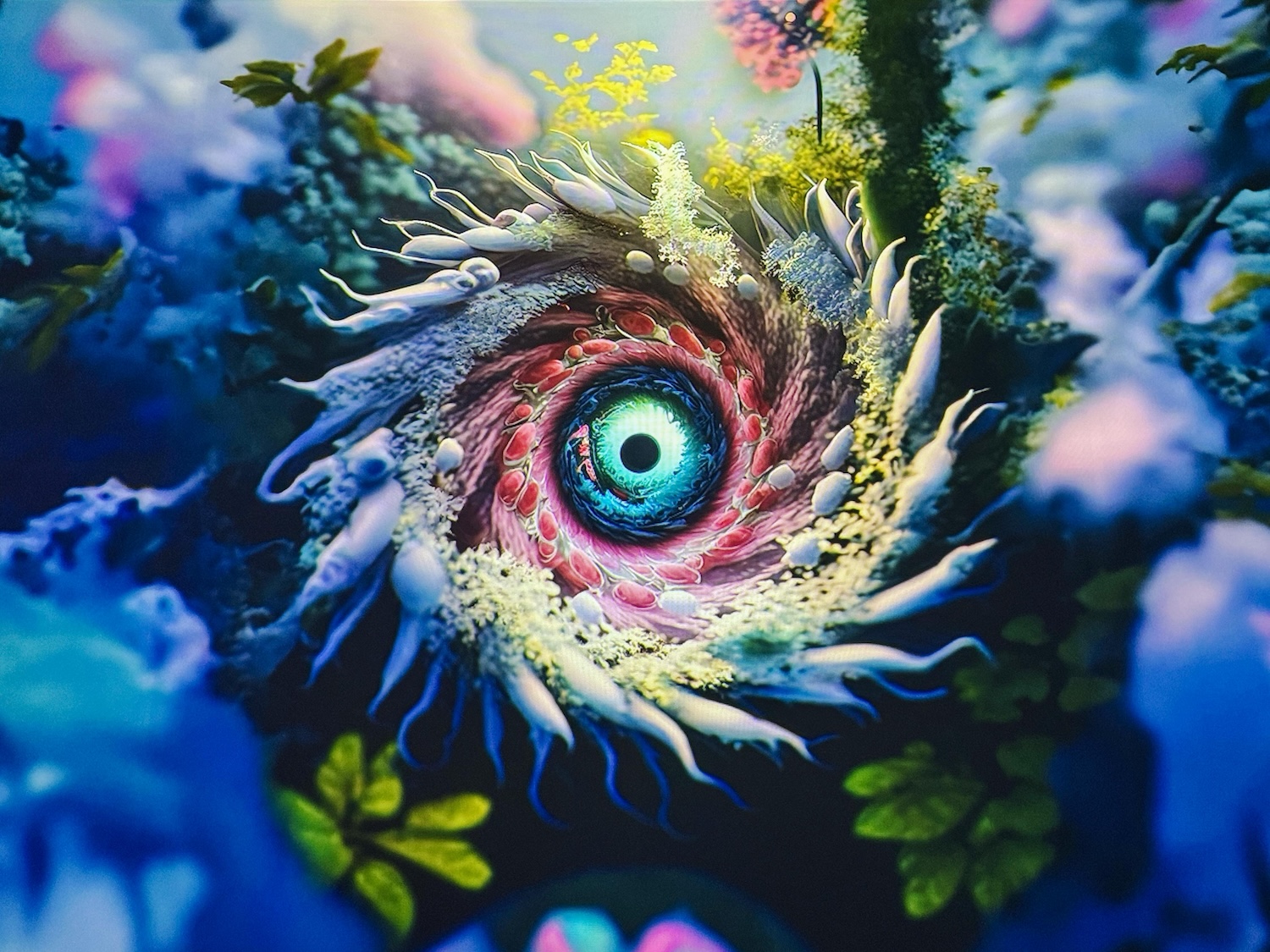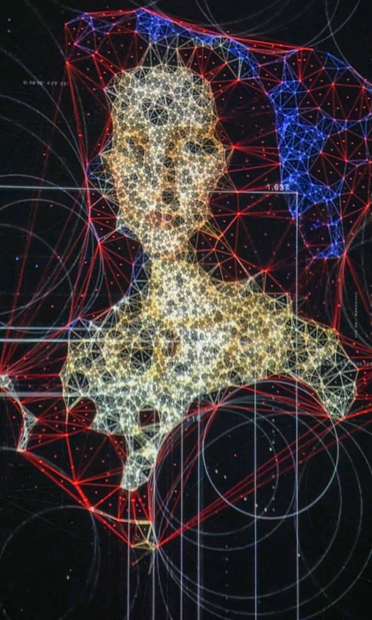 Así como unas obras abordan la fusión de naturaleza y máquina, otras expanden los límites de la ironía y la contemplación. Eric Vernhes, con Meeting Philip (D A T A S K Y), convoca el espíritu de Philip K. Dick en una instalación hipnótica donde el escritor se convierte en oráculo digital, recordándonos que la paranoia puede ser una forma de lucidez. Inook, por su parte, desarma solemnidades con Le Mégamix du Louvre-Lens (Le Cantique des quantiques), un karaoke museográfico en el que creaciones clásicas cantan y bailan al ritmo de ACDC o Britney Spears. Es el algoritmo como DJ de la historia del arte. En FEMINA | IRIS (Renaissances), Riccardo Giovinetto somete el lienzo renacentista La virgen del lirio de Cagnacci a un proceso de deconstrucción digital. A través de síntesis audiovisual y una banda sonora hipnótica, genera un ejercicio de belleza matemática que, en última instancia, cuestiona la mirada masculina sobre lo sagrado y lo femenino. Las piezas reunidas en Un Monde nouveau —de Tatsuru Arai, Boris Vaitovič, Markos Kay y otros— evocan ambientes donde naturaleza, humanos y máquinas coexisten sin jerarquía, componiendo un paisaje sensorial que parece salido de un sueño ecológico poshumano.