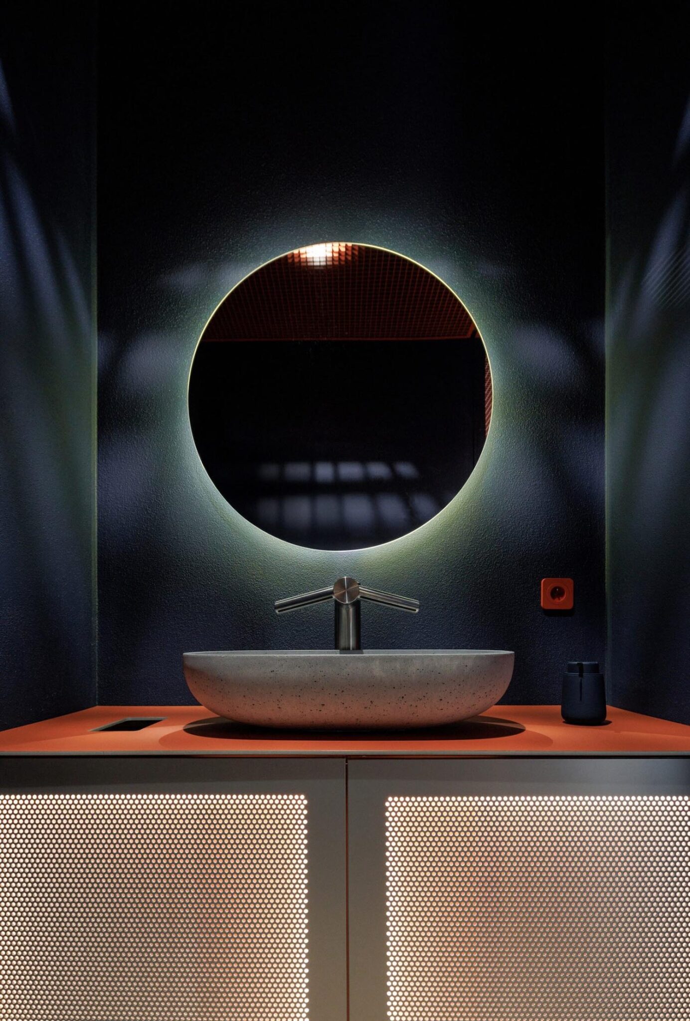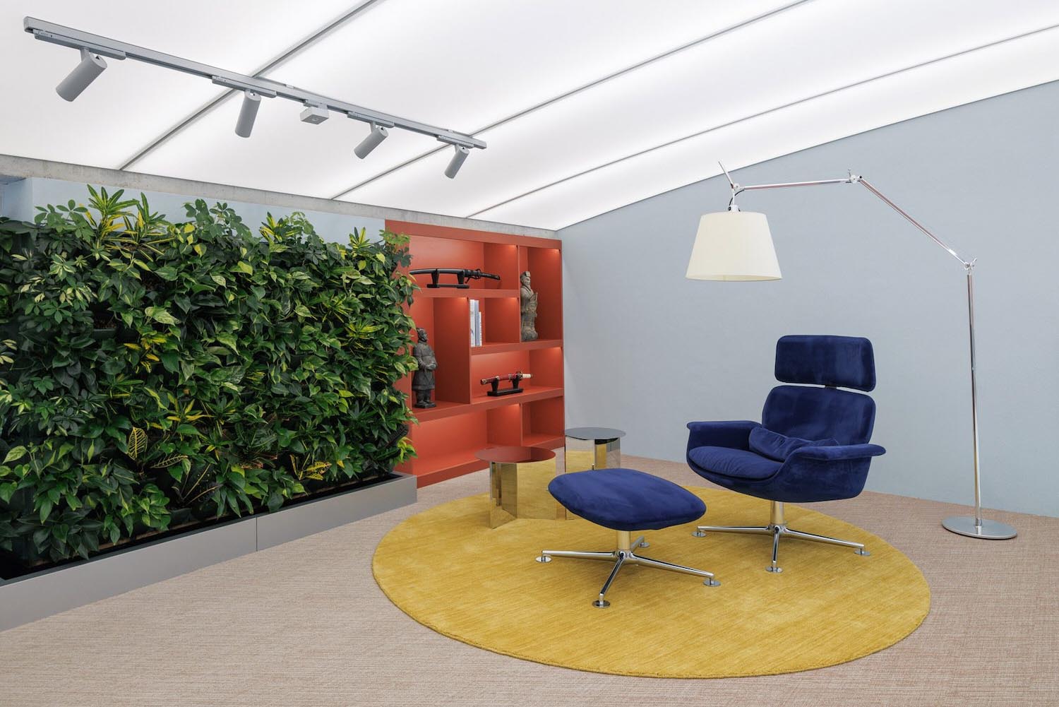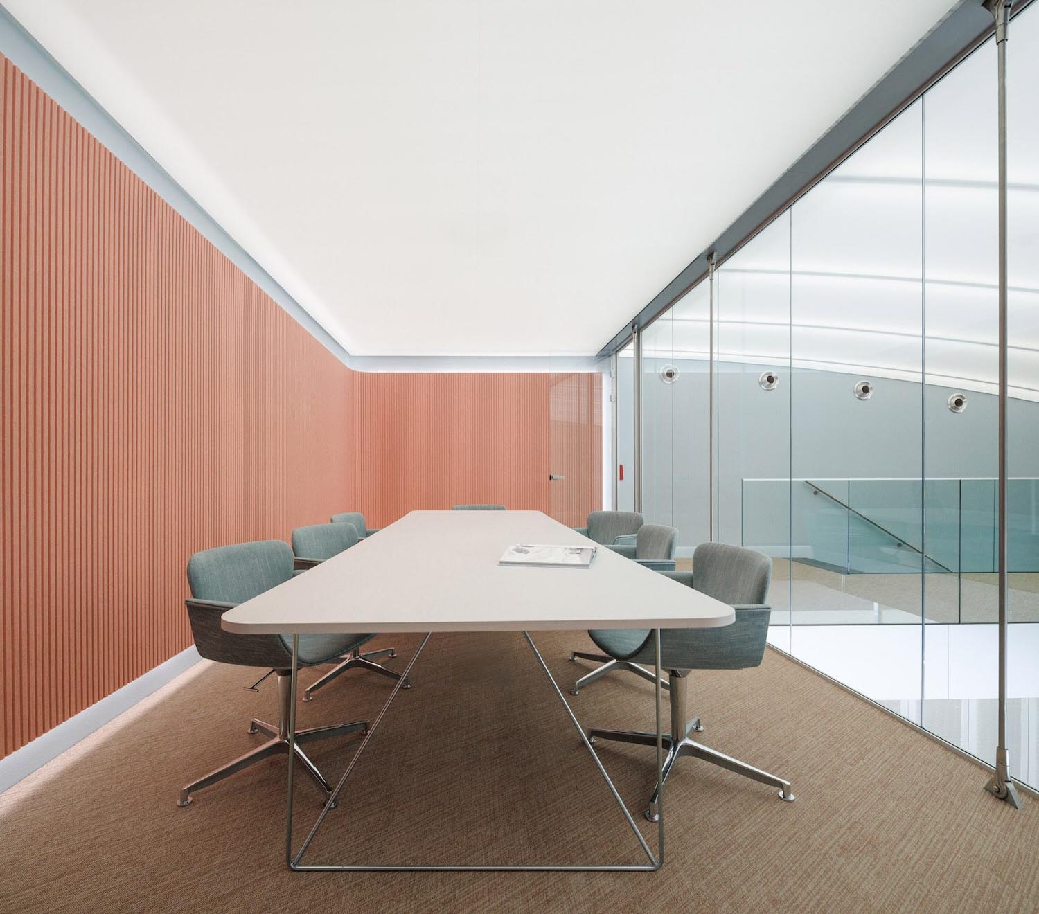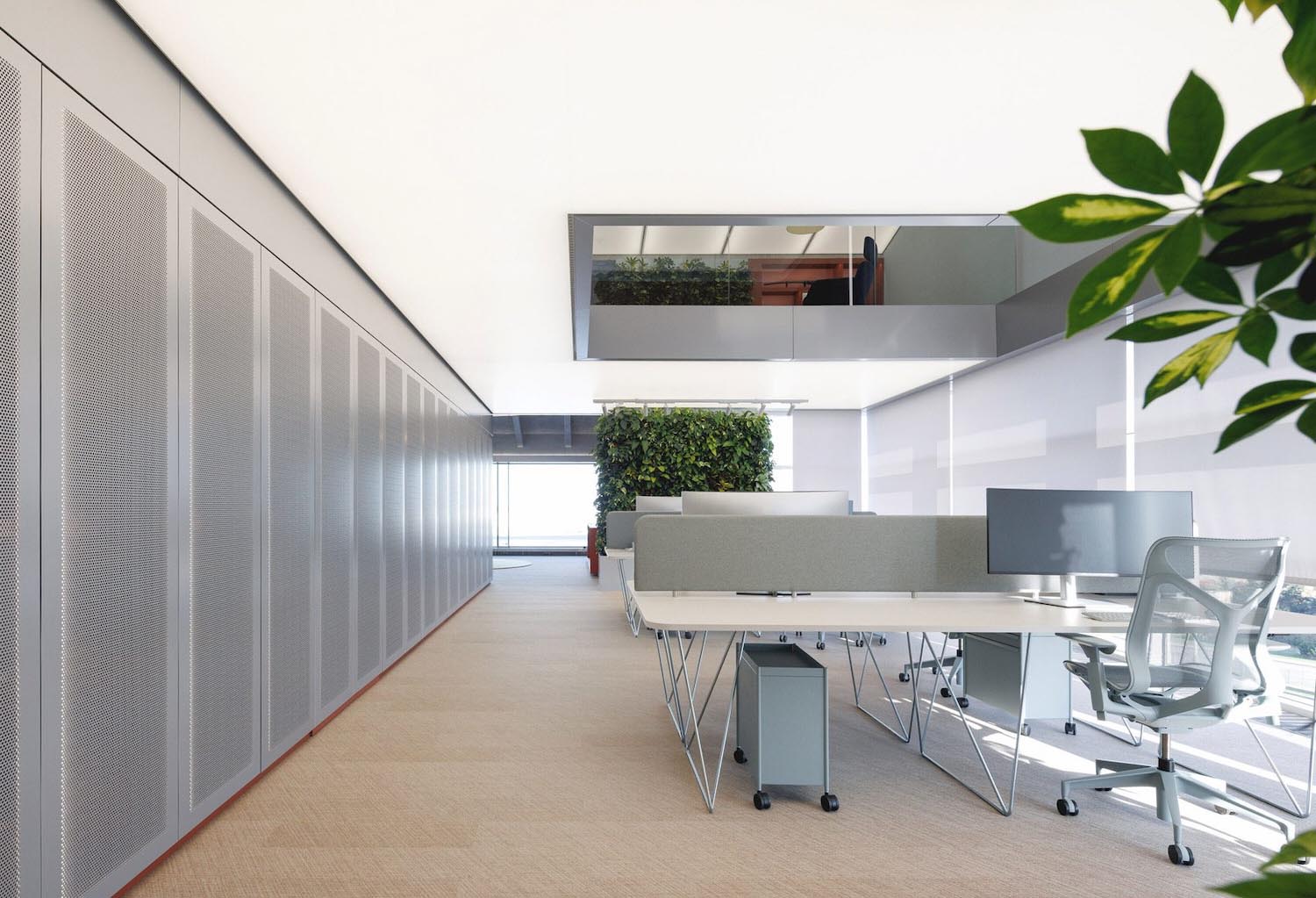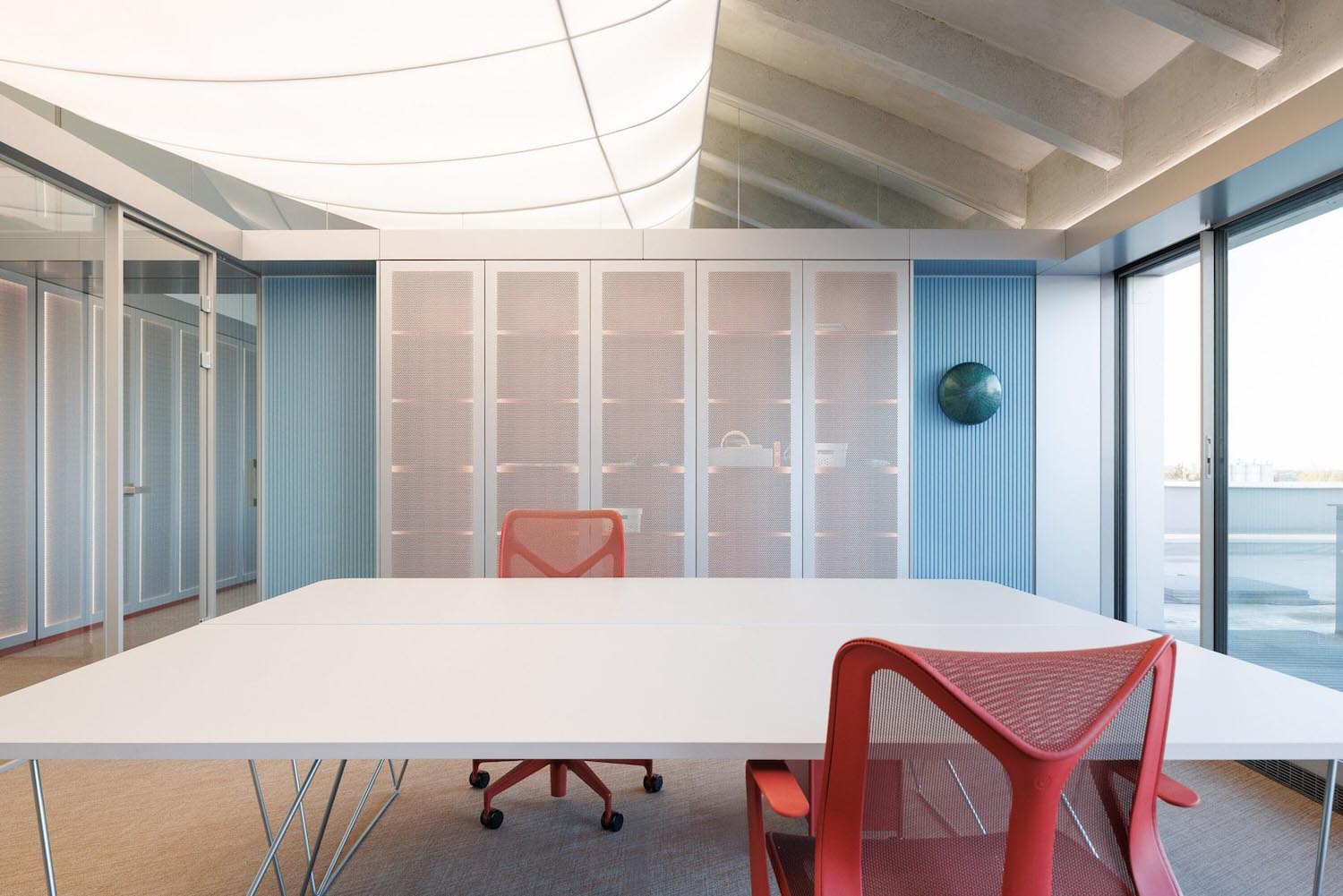 Una serie de matices que alcanzan la cocina, el baño y las salas de reuniones, donde se combinan superficies estriadas azules con asientos rojos. Aquí, las microperforaciones en la parte inferior de la instalación lumínica confieren una acústica mejorada. También se salpican toques de verde, aportados por plantas trepadoras que cubren las columnas estructurales originarias del edificio. En las estaciones de trabajo formales del piso superior, se alumbra con techos abiertos y tras la materialidad alumínica propia de los aviones modernos —que envuelve a los armarios— vuelven a lucir los acentos rojizos en los estantes. Un conjunto de detalles que coordinan luz y color para conferir a todo este paisaje laboral un carácter tan estimulante como distintivo.