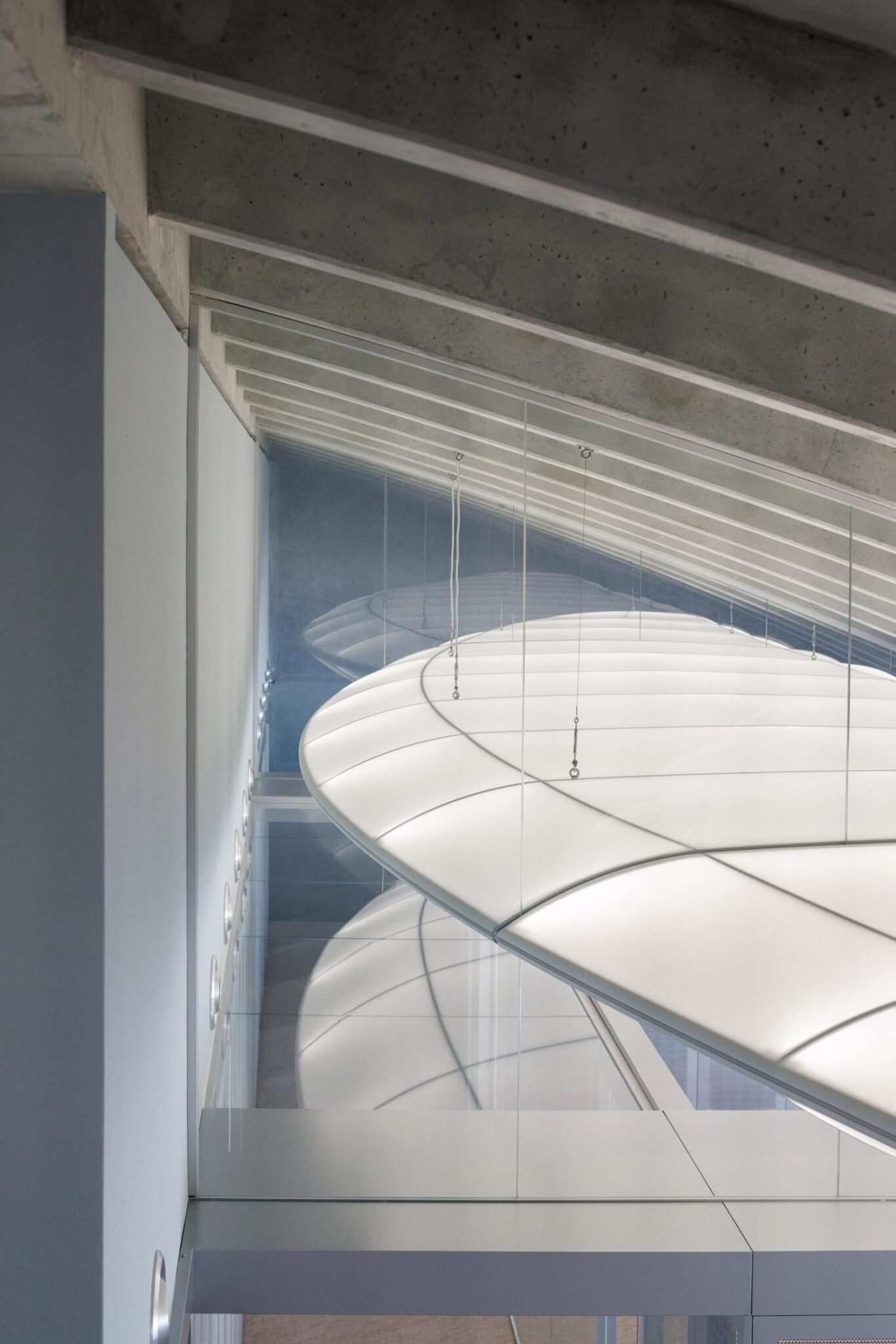 Incorporando referencias estéticas de los dos intereses clave de su cliente —la aviación y el buceo—, el fundador y arquitecto Tomáš Císař emprendió su vuelo imaginativo sumergiéndose en las profundidades hormigonadas del inmueble posmoderno de este workspace. Al desmantelar esa oquedad congestionada con particiones de yeso y techos falsos de la década de los 90, ¿qué habría más críptico que la claridad? Aún así, la solicitud lumínica se resolvía al esparcirla naturalmente a través de grandes ventanales. Una solución homogénea que pasaría desapercibida si no se hubiera articulado también una enorme instalación de 16 metros de ancho.