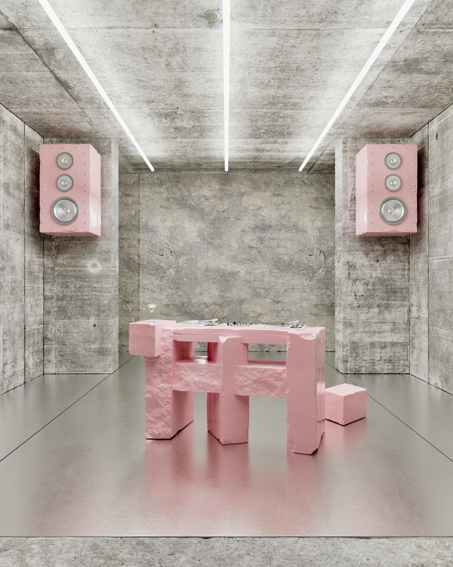 En una estancia de muros lo suficientemente gruesos para que la inmersión sonora sea profunda, volúmenes rosados desafían la frontera entre mueble, instalación y arte. Una escenografía marcada por su composición en forma de altar, presidida por una cabina de DJ, dos altavoces incrustados en la pared y, recientemente, un reproductor de vinilos. Estructuras bendecidas con una apariencia de hormigón motivada por la idea del trampantojo, ya que en realidad están fabricadas con espuma densa. Bajo el nombre de Brutalist Pink, las creaciones de YONT combinan la dureza visual del brutalismo con materiales blandos de color pastel. Desde el estudio dicen que “el rosa brutalista es tanto un lenguaje visual como un estado de ánimo”, y con esa máxima han reinterpretado el mito sólido a través de la inconsistencia.