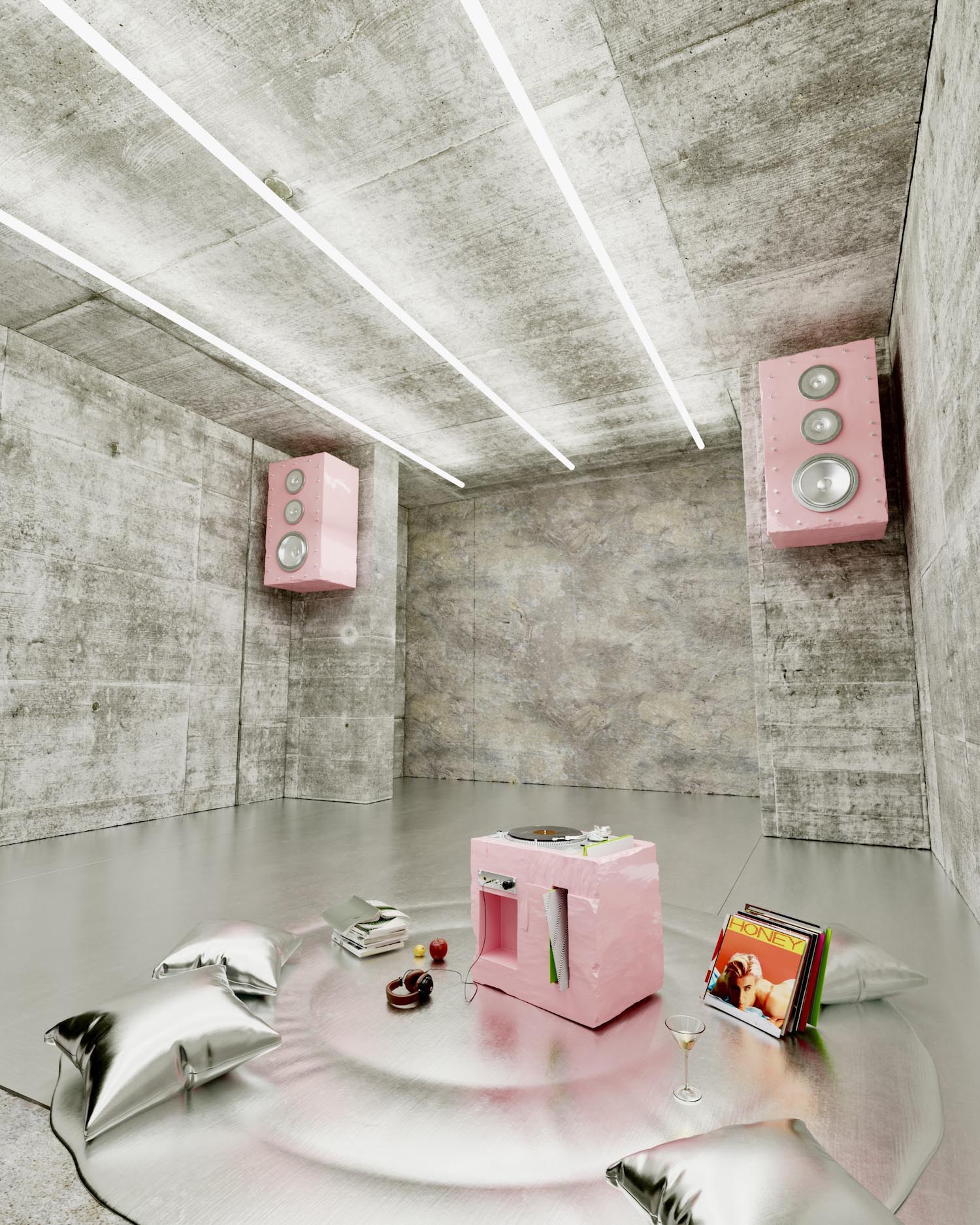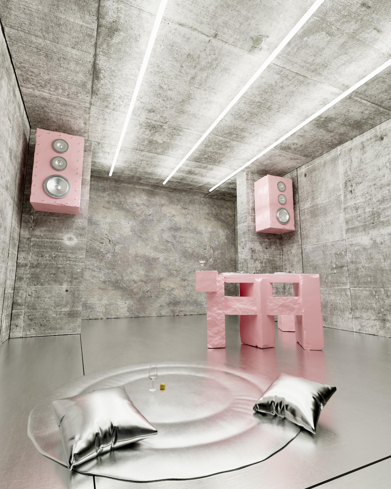 Este juego visual toma su inspiración de la estética digital contemporánea, caracterizada por la corriente del diseño posinternet donde prevalece el rosa como el cromatismo principal de la pieza imaginaria. Reisinger Studio o Six N Five parecen capitanear esta tendencia; además, Ayvaz y Karadeniz también han hecho otras incursiones de esta categoría con la mesa Etherea o la estancia virtual Black Room with a Pink Bed. Sin embargo, lo que parecía surgir como una ironía en el ámbito virtual, en Brutalist Pink se desliga para cruzar la pantalla y hacerse cierto en una colección que tiene previsto ver la luz este 2025. Un atrevimiento físico que desafía la tipología tradicional de mobiliario sonoro.