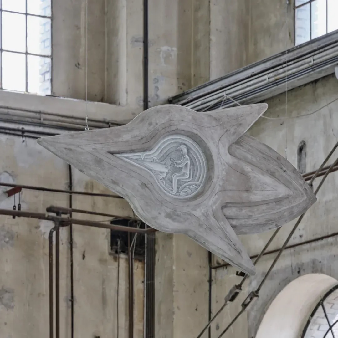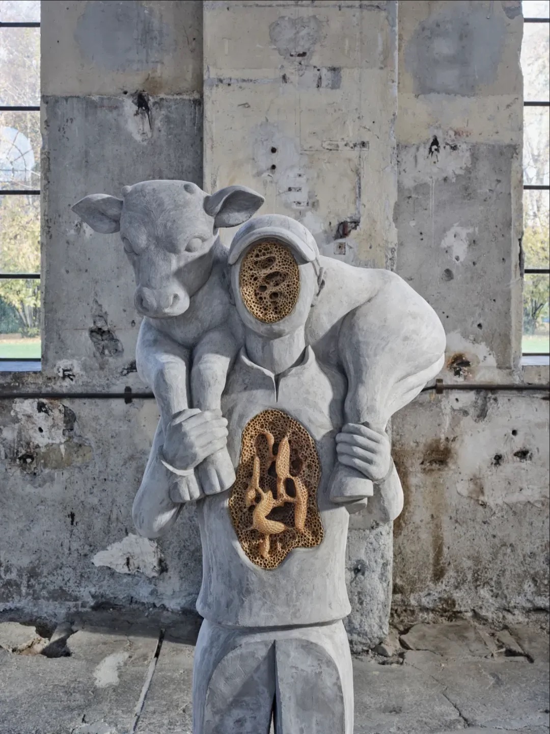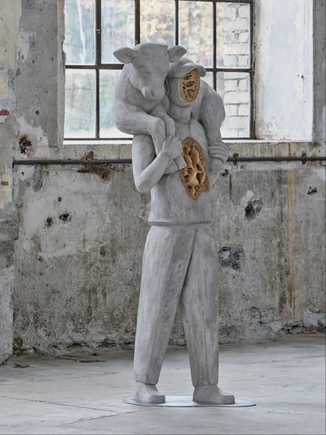 En Bucolica, las doce figuras y recursos arquitectónicos nos hablan de tecnificación y de naturaleza que se revela junto a silos y torres de chapa. Los campesinos que la componen son presentados mayoritariamente sin rostros ni manos, detenidos en una pausa laboral y colectiva extraña (Man with a hoe, 2025). Dentro de la sala Kunstraum Dornbirn —una antigua nave de montaje industrial— se muestra una escena de trabajo con personajes que siembran, cosechan, descansan o comen. Pero cuando irrumpe el panal (Sowers, 2025) el conjunto deja de “representar” este entorno. La urdimbre del panal se incrusta en el hormigón y desplaza la lectura hacia una lógica no humana, más cercana a la colonia que a la productividad. Una acción que recuerda a Untilled Liegender Frauenakt, 2012, de Pierre Huyghe, donde una colmena viva coloniza la cabeza de una escultura de hormigón.