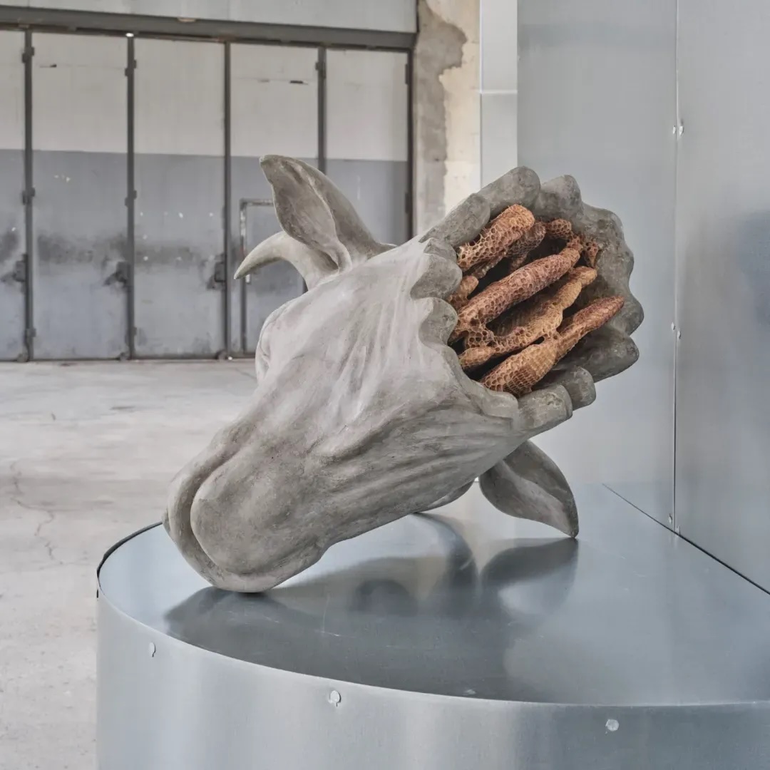 Hulačová plasma esta fricción cavando panales en sus obras, como en Calf Bearer (2025), donde colmenas ocupan cavidades y sustituyen órganos, haciendo que el cuerpo reescriba su propia anatomía. La “bugonia” —mito de renovación cíclica entre vida y muerte— convierte el hormigón en un elemento vivo. Asimismo, en sus propuestas también puede verse otras opciones, incorporando granos o ramas —como “restos” de un ecosistema— o también cerámica, madera y chapa metálica, con los que realiza estructuras que acompañan a muchas de sus estatuas.