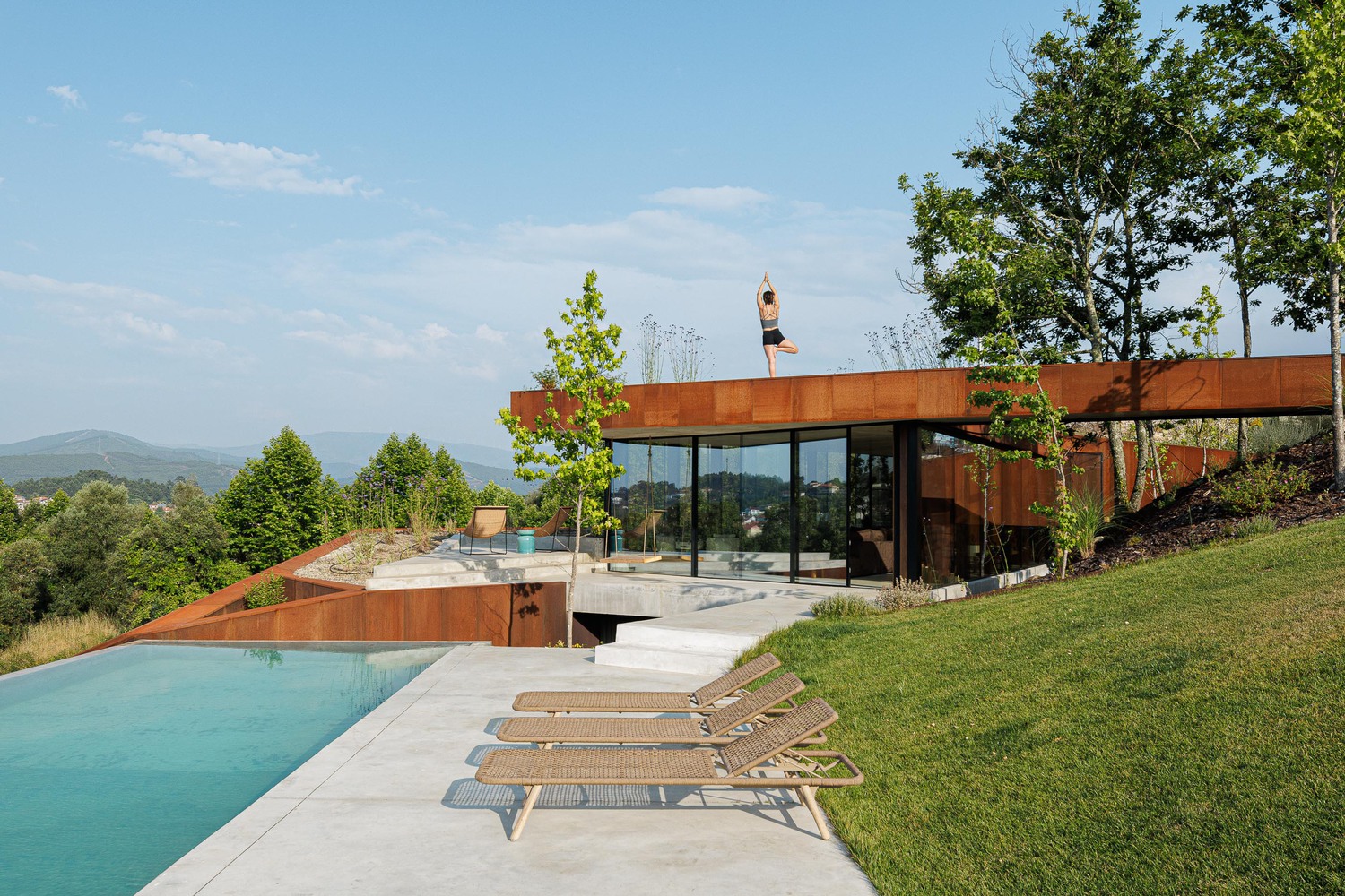 Pereira articula esa conversión desde la afirmación de la sensibilidad contemporánea, lección del maestro Álvaro Siza arraigada en la arquitectura portuguesa actual, que se esfuerza por integrar orgánicamente al edificio en el entorno. La volumetría de Casa Corten —enteramente revestida en su perímetro exterior con componente— se relaciona cuidadosamente con el terreno, asumiendo la dificultad que su fuerte inclinación y orientación desfavorable imponía. Cubiertas ajardinadas en los dos niveles de la residencia se han concebido como prolongaciones —casi elevadas— del suelo para integrar la volumetría y fragmentarla, permitiendo así una fusión con el paisaje y el carácter del entorno suburbano.