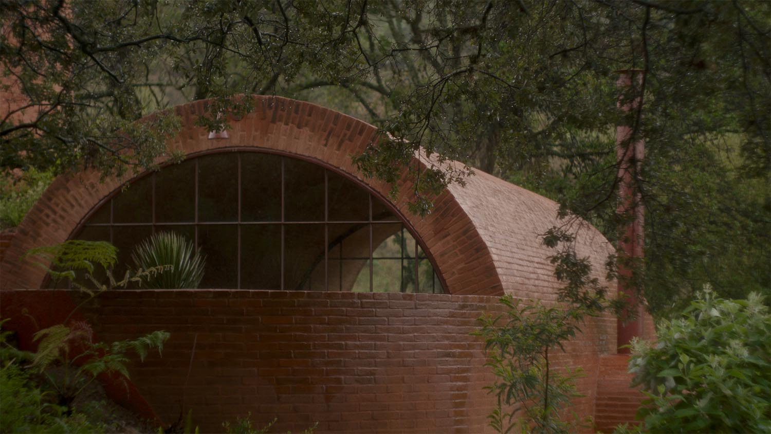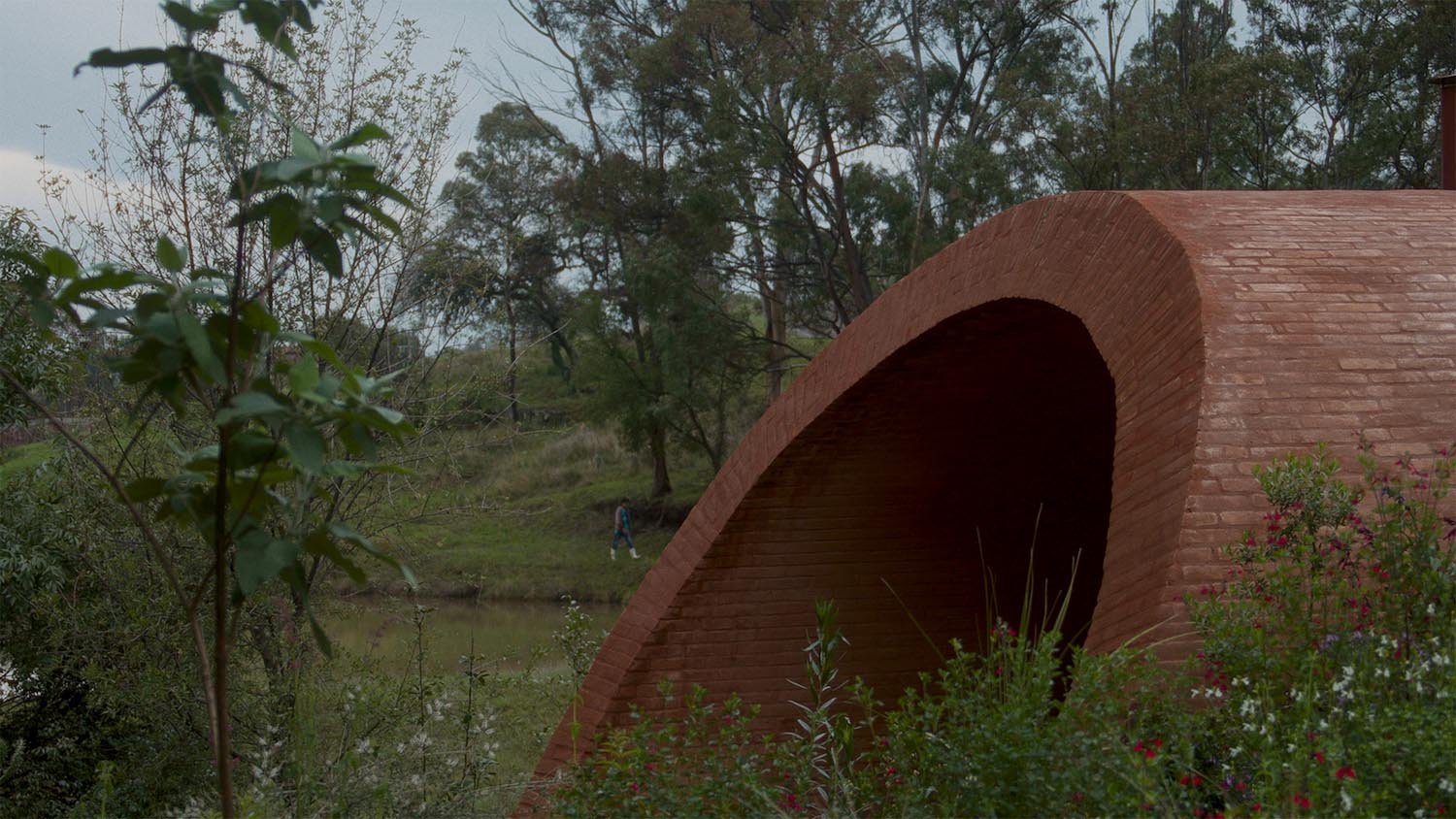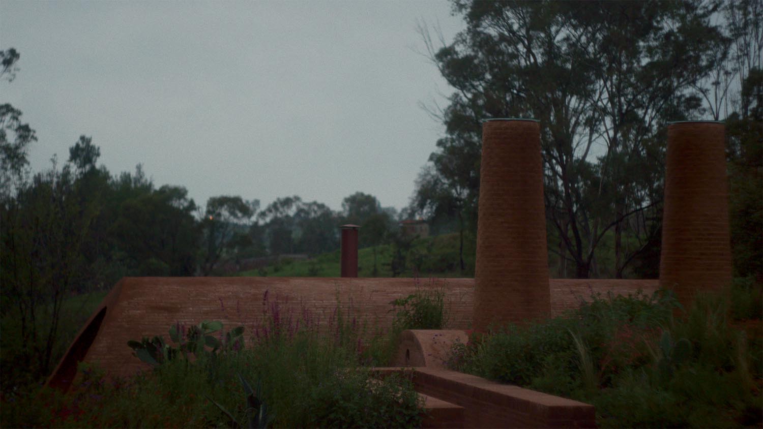 De la suave curva de la parte superior brotan dos chimeneas de ladrillo —como antiguas usinas industriales—, que sirven de ventanas para trasladar la cálida luz solar al interior y señalar con discreción la presencia de la arquitectura. Una cuya pureza en el paisaje solo tiene el propósito esencial de respetarlo.