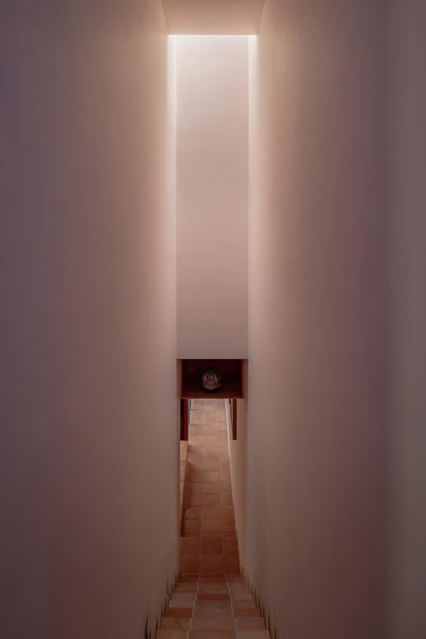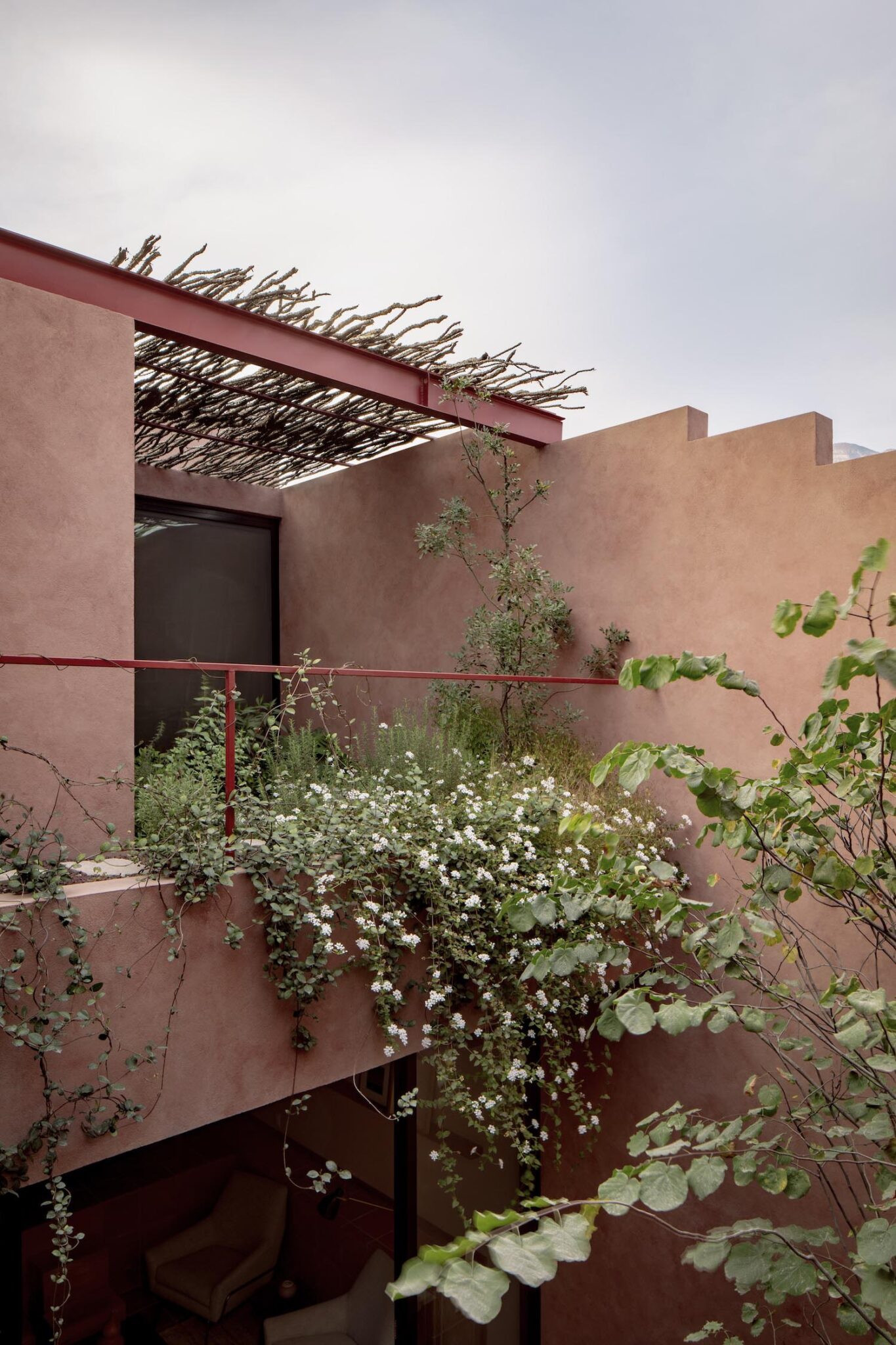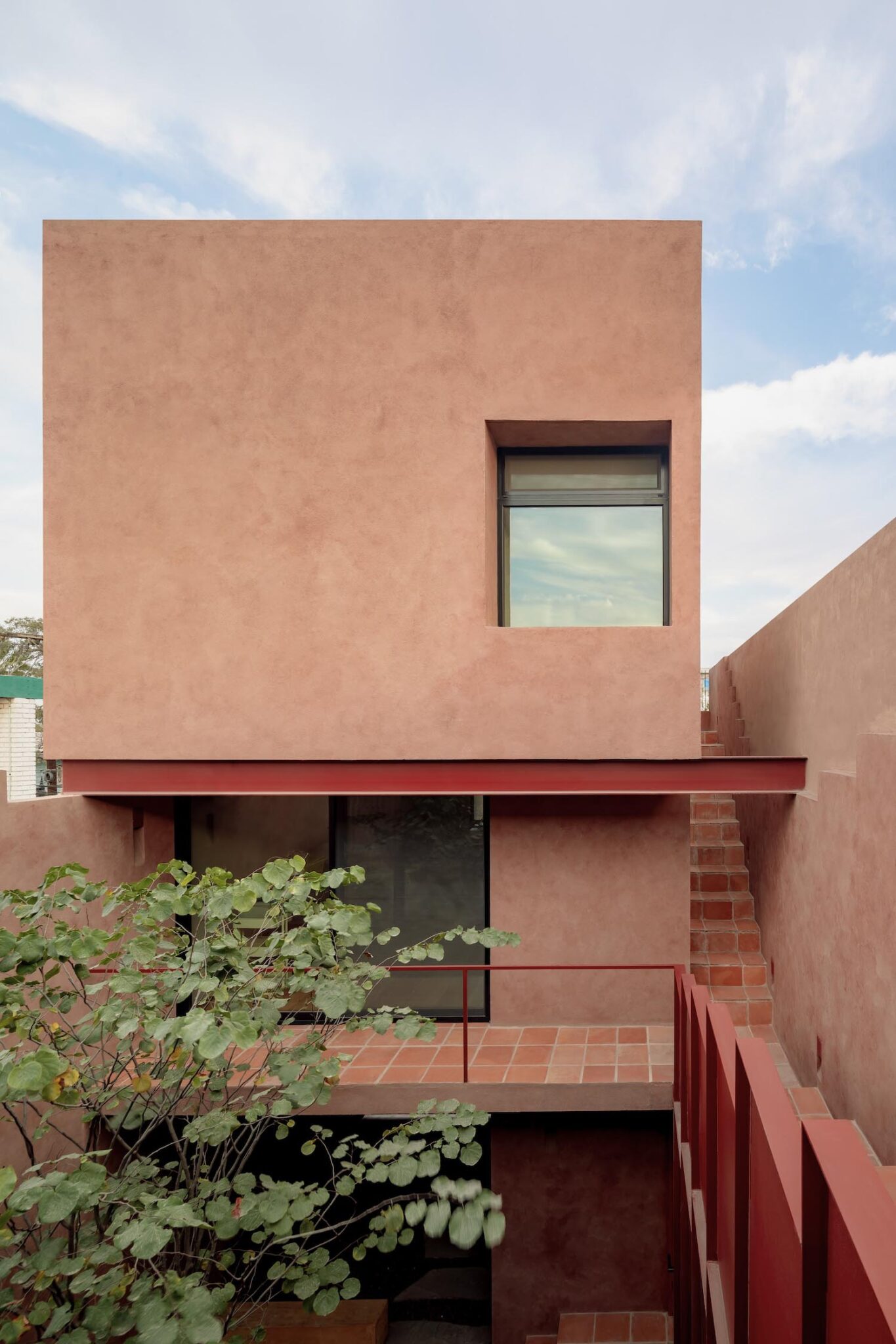 Aun así, hay detalles en el diseño que no solo resuelven el conflicto espacial, sino que hacen ver cómo Práctica Arquitectura —como probablemente muchos estudios mexicanos— aún tiene la Casa Gilardi en la cabeza. El color rosado de los enfoscados, la relación de las habitaciones con las terrazas, la ausencia de vistas de la calle o del barrio, el recorrido hasta la parte de atrás por una galería o la icónica habitación azul al fondo.