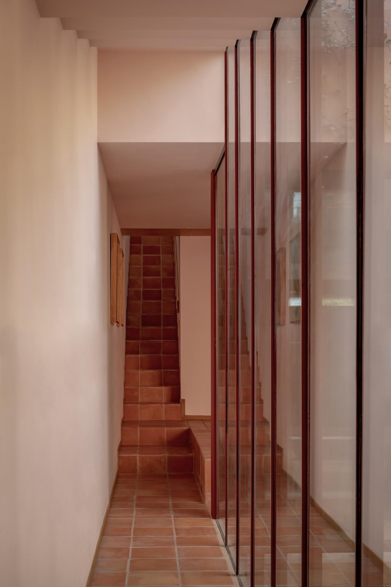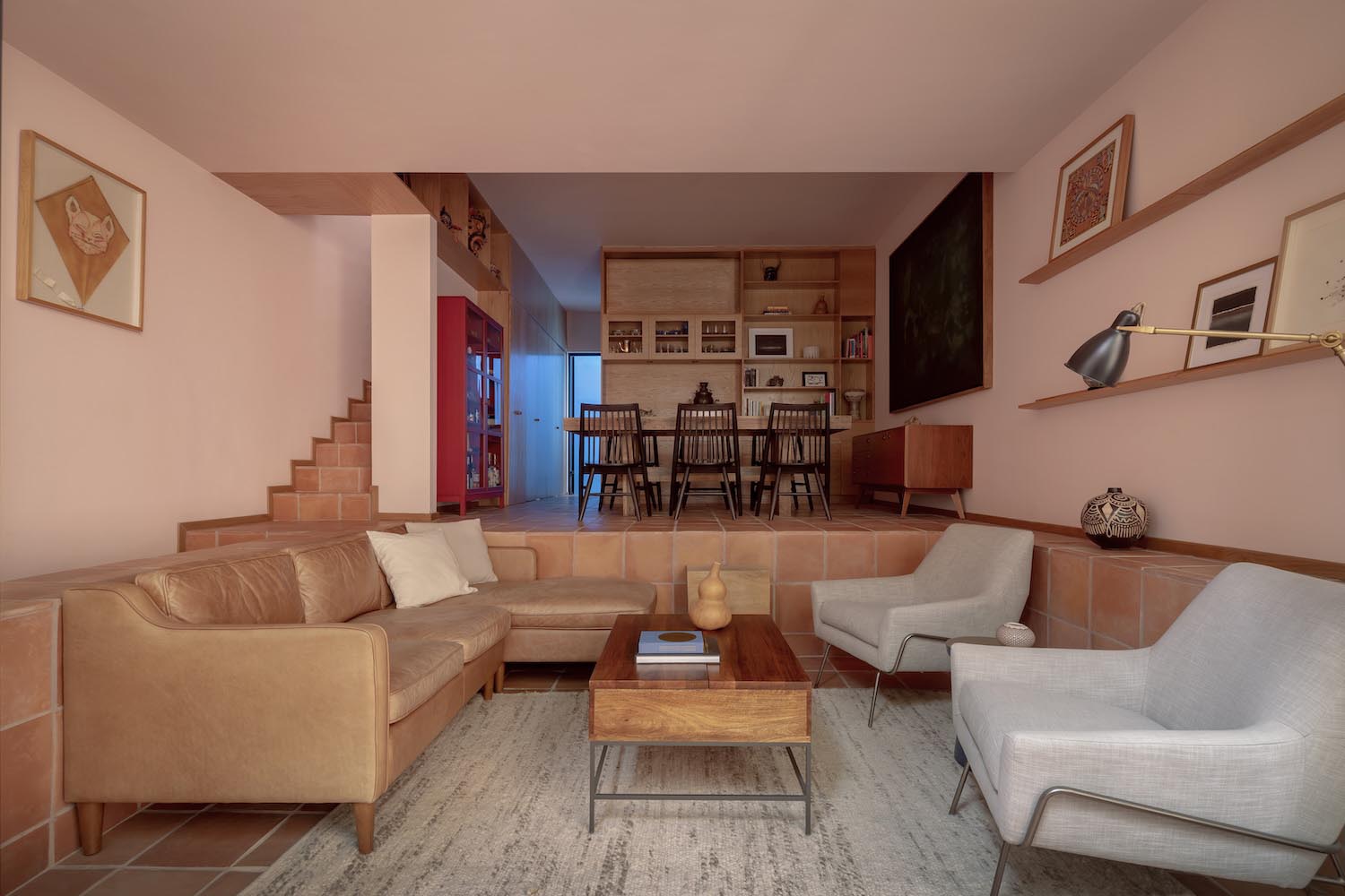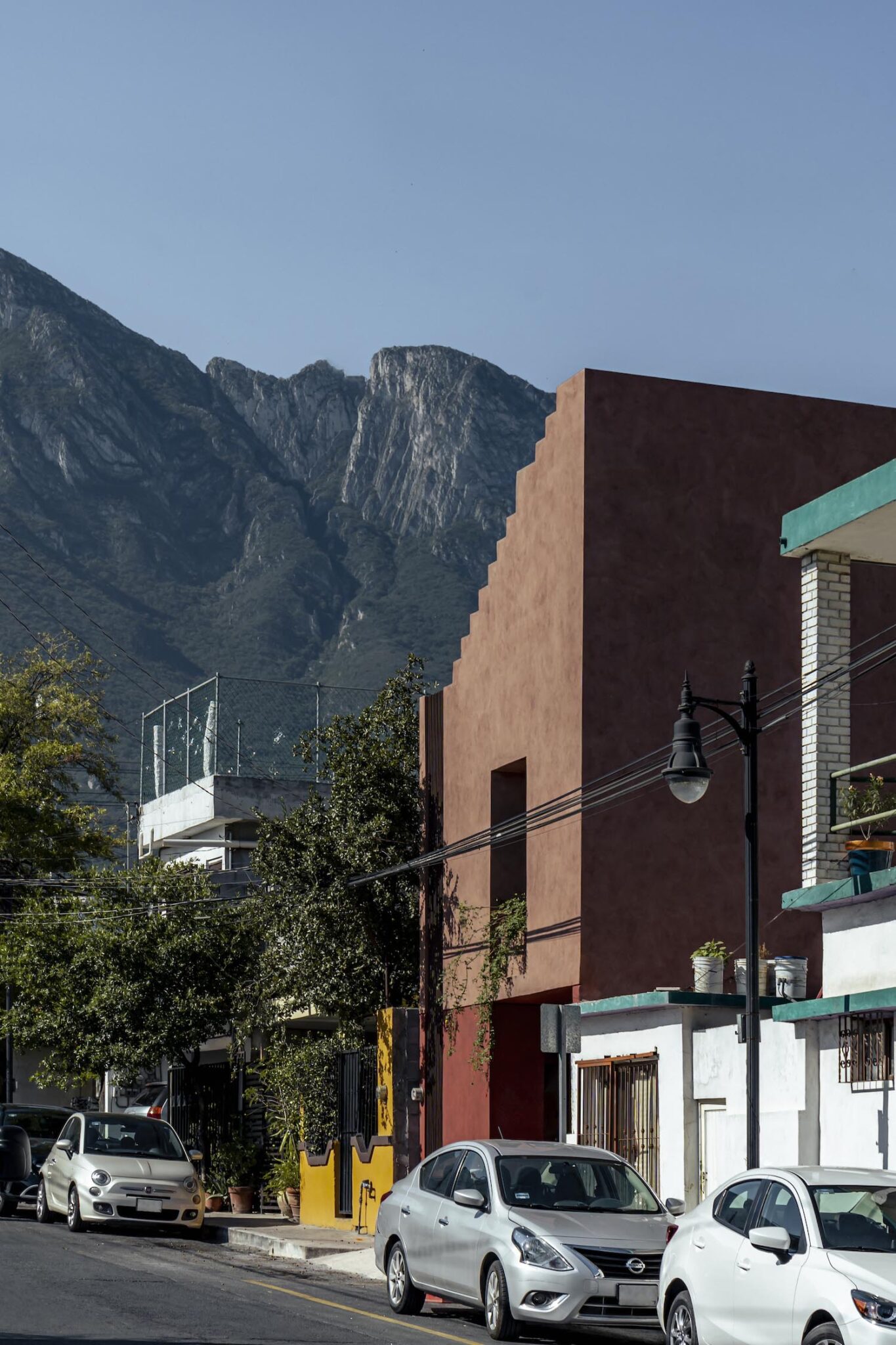 Aun así, hay detalles en el diseño que no solo resuelven el conflicto espacial, sino que hacen ver cómo Práctica Arquitectura —como probablemente muchos estudios mexicanos— aún tiene la Casa Gilardi en la cabeza. El color rosado de los enfoscados, la relación de las habitaciones con las terrazas, la ausencia de vistas de la calle o del barrio, el recorrido hasta la parte de atrás por una galería o la icónica habitación azul al fondo.