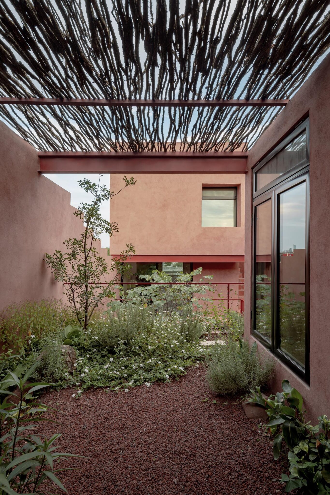 La disposición en torno a un patio de este edificio de Práctica Arquitectura parece estar influenciado por la Casa Gilardi de Luis Barragán.