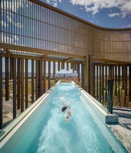 En Odiseo, el equipo de Clavel Arquitectos ha realizado la piscina en voladizo más larga de Europa, suspendida a casi 30 metros del suelo que vuela 22 de los 44 metros a cada lado. Este alarde estructural que a priori se presupone difícil de ejecutar, en realidad se basa en un principio bastante sencillo de rigidizar el plano por medio de su pliegue. Este gesto no es un capricho vacuo, la piscina culmina en un mirador de cristal que ofrece una visión única y emocionante, solo apta para corazones valientes.