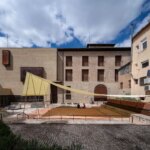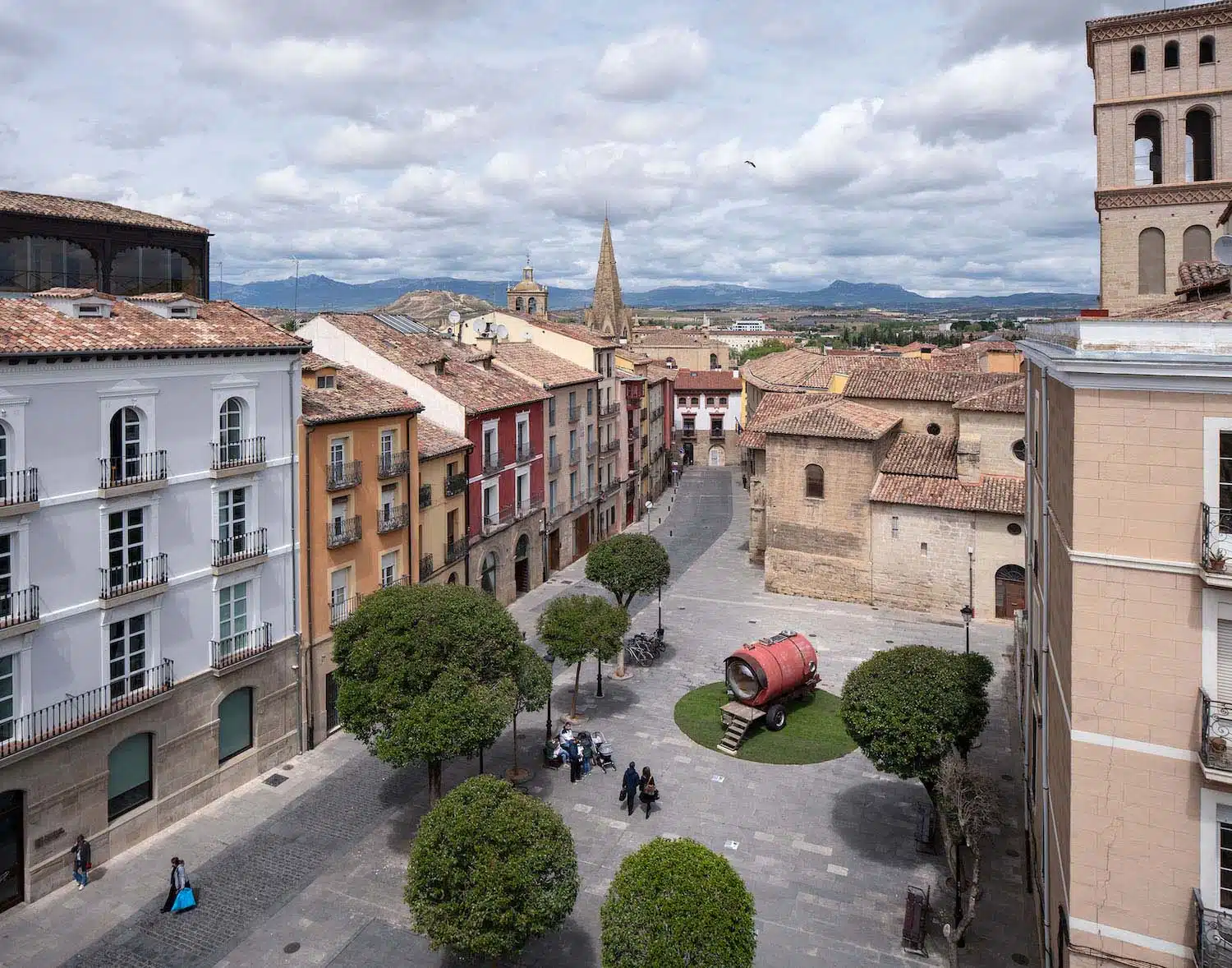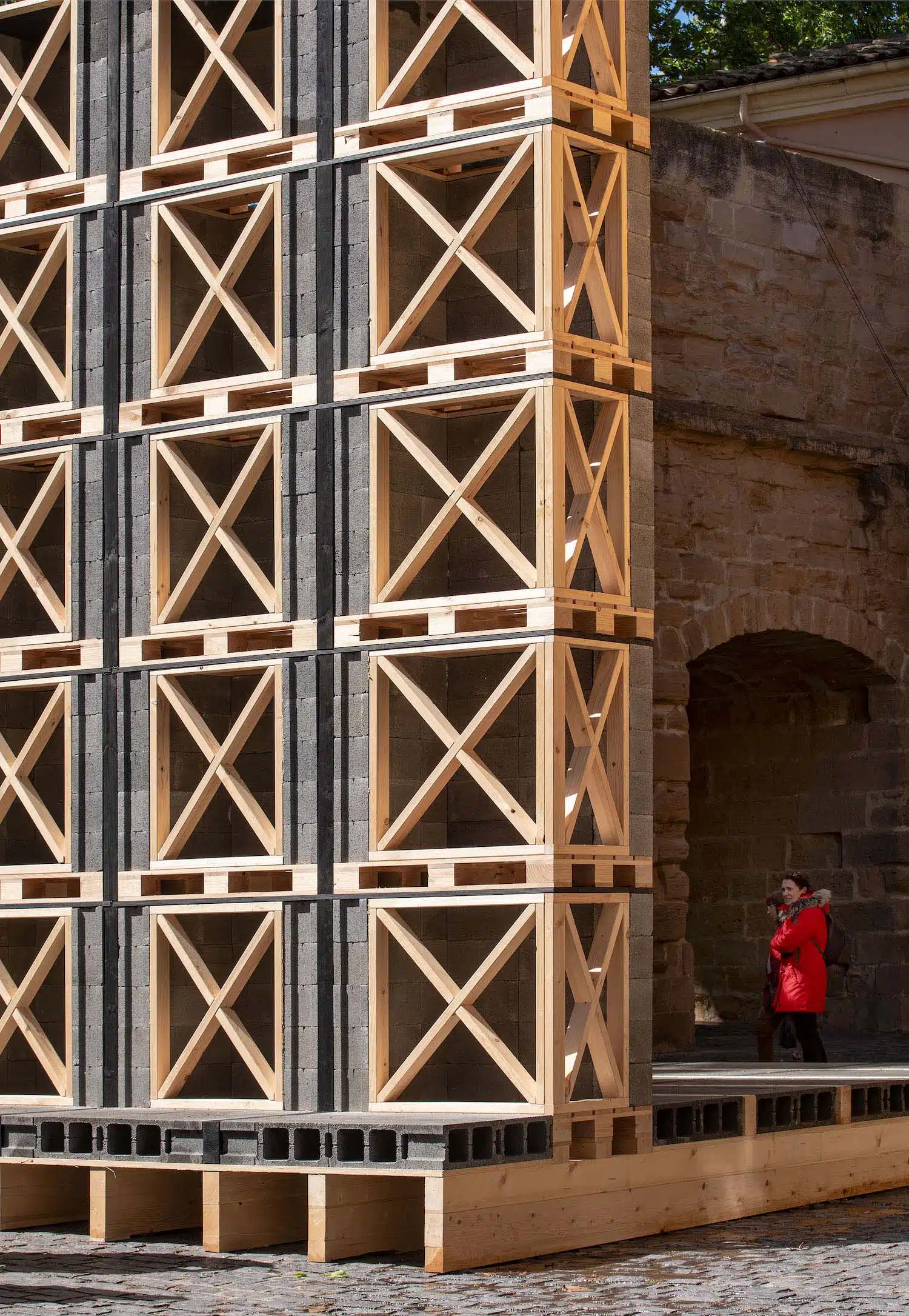 En última instancia, los franceses MUOTO + Atelier Georgi Stanishev transformaron la zona junto a La Muralla y la Plaza del Revellín. Un lugar histórico atravesado por el Camino de Santiago que intersecciona con una pequeña plaza rectangular incompleta por uno de sus lados, ahora rematada por la habitación abierta al cielo de los arquitectos. Un espacio en forma de “T” invertida de dimensiones teatrales que, conformada por bloques de hormigón y palés de madera, absorbe el pavimento de la plaza y ofrece un área de abrigo y sombra para los visitantes.
