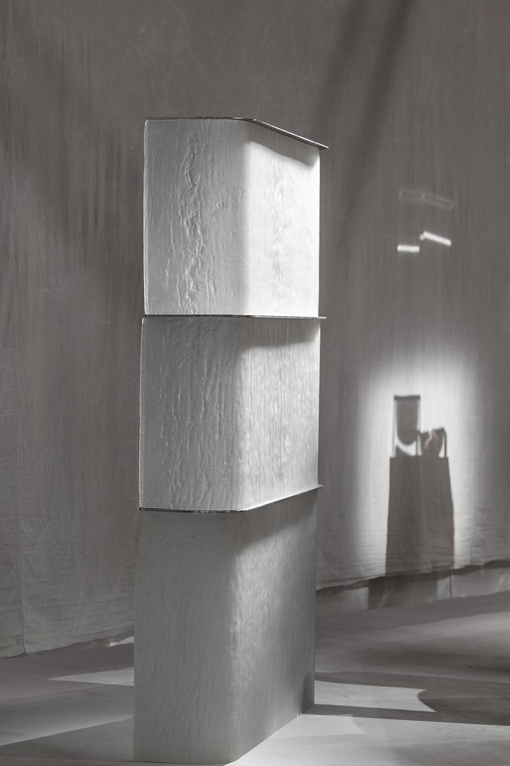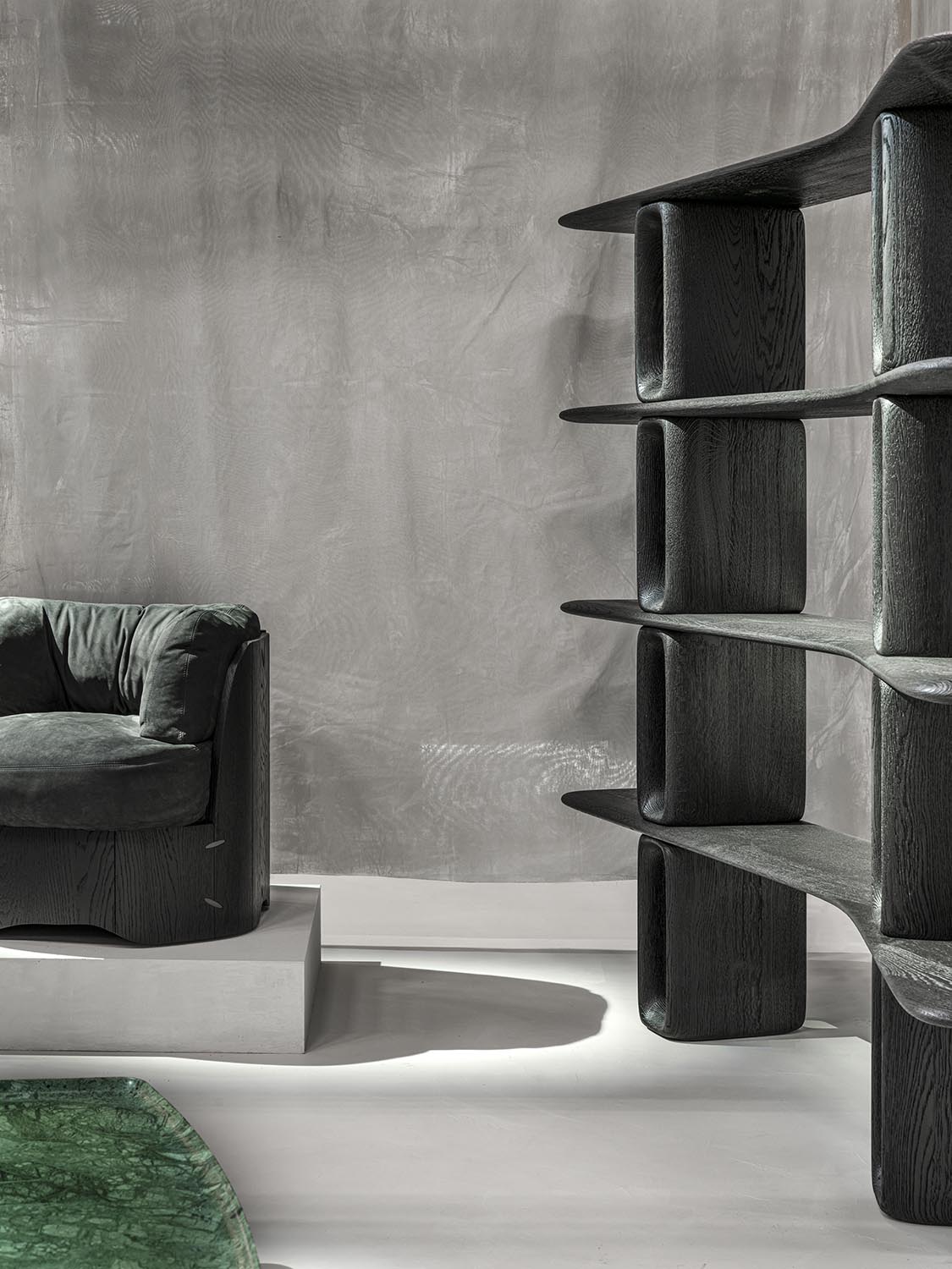 El recorrido que el diseñador y arquitecto alemán nos mostraba nos conducía por una fricción de superficies: lo espejado junto a lo áspero, lo pulido junto a lo crudo y lo que cabe en una casa frente a lo colosal. El destello empezaba por ZIETA, que trabaja el metal como si lo hinchara desde dentro, con obras reflectantes que atrapaban el entorno en su forma de bucle. La opacidad se condensaba en Nok, el bosque totémico de Imperfetto Lab, con una monumentalidad que también se recogía en la geología sintética de James Haywood Atelier en su escultura de cuarcita Erreur 404.