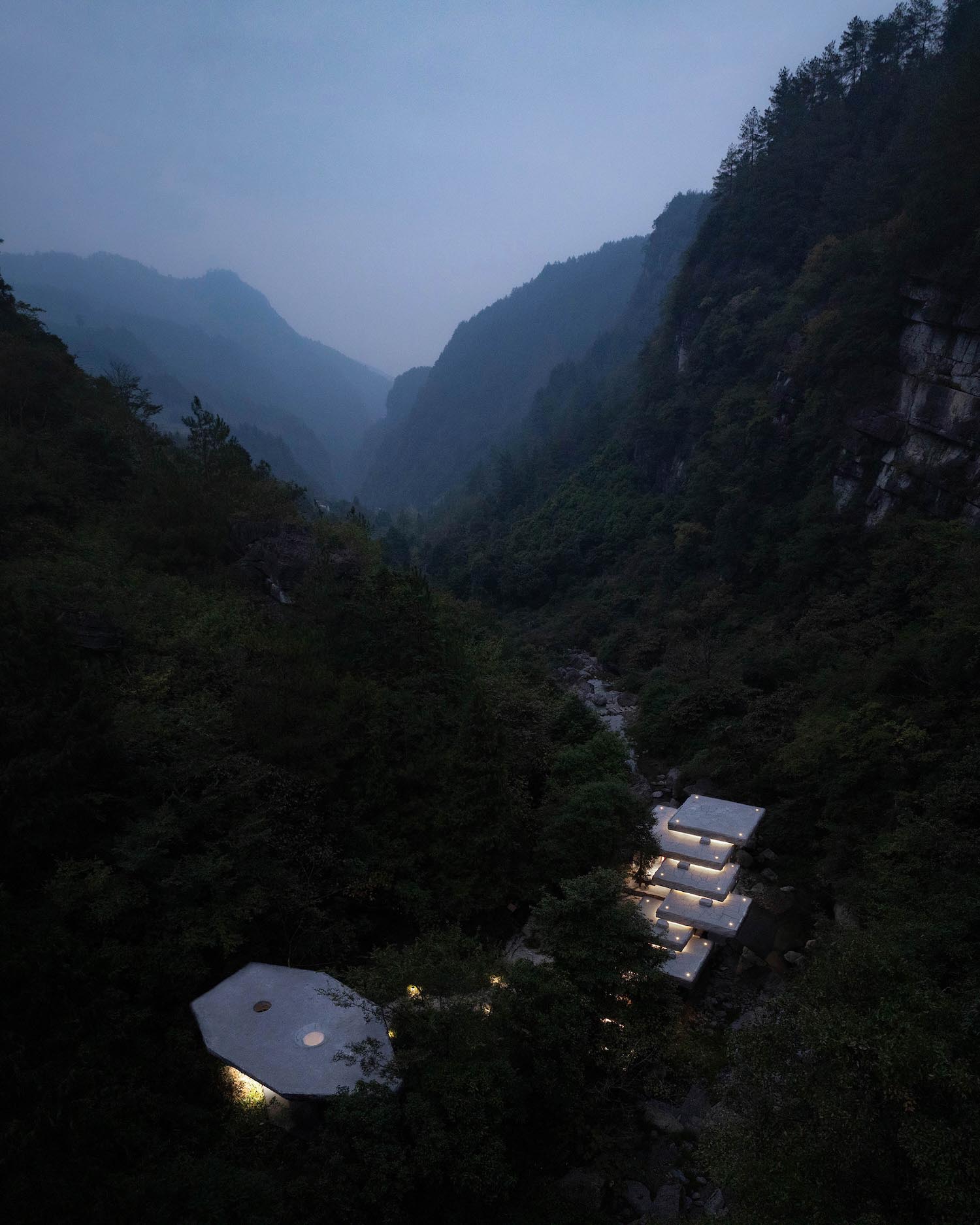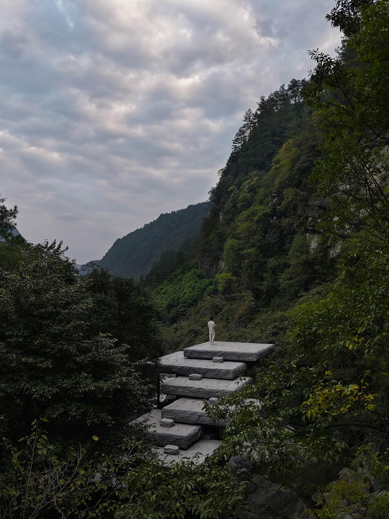 Dos elementos componen Drifting Stones: una escalera y un pabellón. La escalinata lleva a los visitantes desde el arroyo a un punto elevado, desde donde pueden contemplar la espesura del bosque. El pabellón es un refugio —albergado en el armazón de apariencia pétrea— donde, igualmente, se experimenta una comunión sensorial con el valle. En él, la piedra apilada se convierte en la estructura que articula el interior sin corromper el paraje de frondosos árboles, acantilados, riachuelos, peñascos… El objetivo: generar una experiencia de profunda vinculación con el entorno.