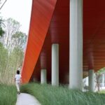 La propuesta diseñada tenía inicialmente una finalidad temporal, pero, reconociendo su valor, el cliente decidió convertirla en una estructura permanente. Como reflejo de su voluntad por aunar de manera profunda en forma y función, Powerhouse Company modifica la cubierta practicable y la transforma en un sendero peatonal. Un anillo continuo revestido de baldosas de aluminio que aparece visualmente como un fascinante loop de color rojo, y que establece un intenso contraste con los tonos verdes de la vegetación circundante.