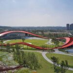 La fluida trayectoria del sendero rojo— con longitud de 698 metros— está definida por la topografía del terreno, adecuándose a las necesidades de disposición de la zona que el programa de usos del edificio solicita, elevándose 25 metros en algunos de sus tramos. La superficie de Loop of Wisdom tránsito está recubierta con el mismo material utilizado en los circuitos de atletismo, lo que la convierte en un perfecto espacio público destinado a actividades lúdicas, como paseos o la práctica deportiva. Una tipología que, observada a la luz de las circunstancias actuales de prevención y cuidado, se muestra como una posibilidad de crear entornos compartidos con garantías de seguridad y reducir el sentido de distancia y alienación.