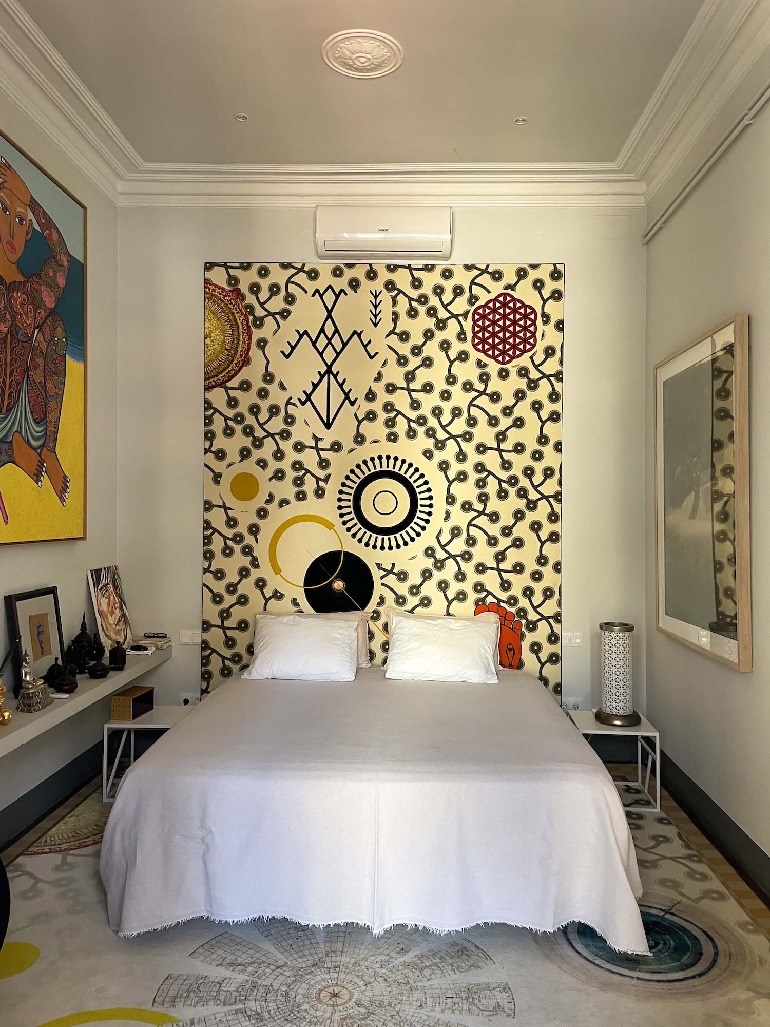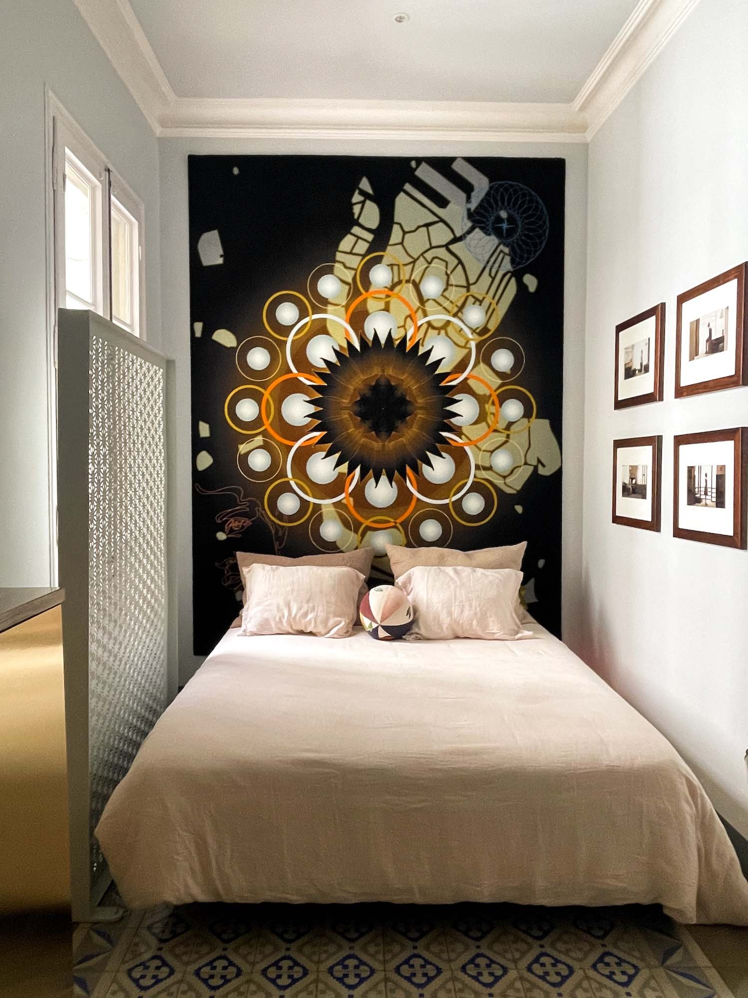Es aquí cuando Van Vliet recurre a piezas de arte de reciente creación, que en algunos casos actúan como auténticos murales que cubren la totalidad de algunos paramentos de las estancias. Se observa en los dormitorios, donde se cambia la capacidad sensorial de un típico piso burgués barcelonés mediante nuevas texturas y cromatismos. Optando por unas pinturas con reminiscencias asiáticas y con un mobiliario mínimo sin excesivas estridencias, es capaz de conseguir cierto misticismo en sus espacios. Por eso sus trabajos suelen versar más en ese concepto tan denostado de decorar en vez de hacer un interiorismo elaborado.
