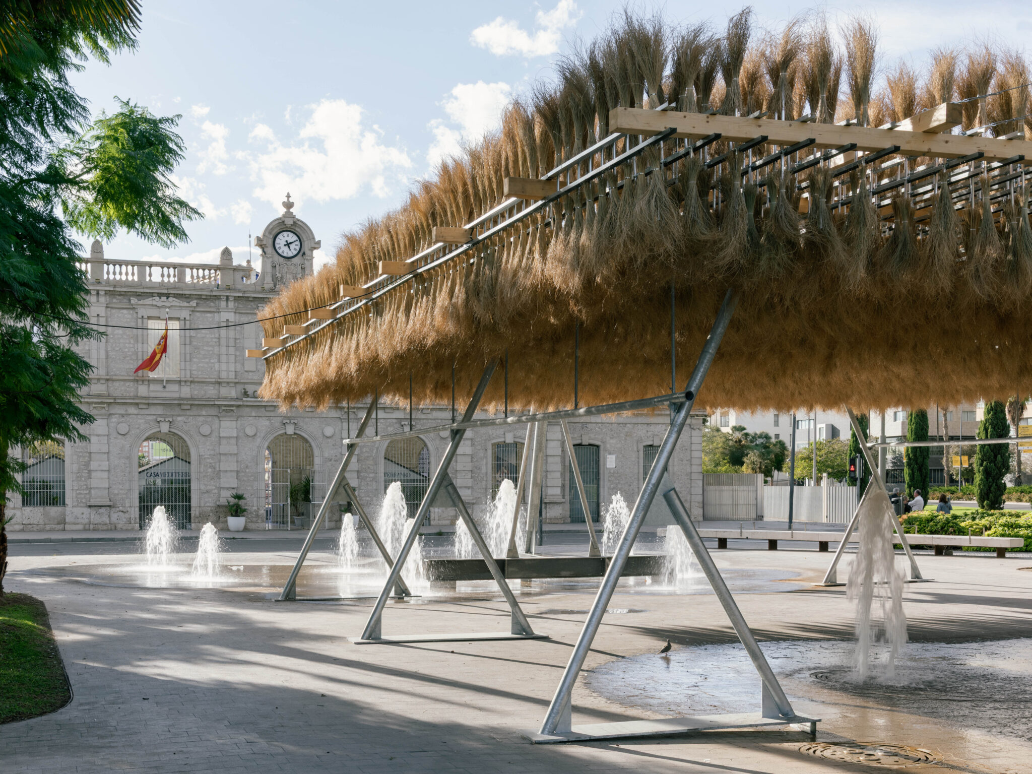 Nacido de la necesidad de revisar los materiales empleados en la construcción actual y honrar los oficios locales, el pabellón se expresa como un gesto de recuperación patrimonial con perspectiva ecológica y funcional. Cada parte que lo compone desarrolla una narrativa que desecha soluciones industriales o poco beneficiosas para el entorno, apostando por resignificar estrategias arquitectónicas tradicionales en clave contemporánea. De ese modo, el cielo se ve cubierto por un manto de fibras vegetales que sirven como sombra directa y como filtro de la radiación solar; además, la presencia del agua en la plaza donde se ubica, crea microclimas que incitan a permanecer bajo su estructura.