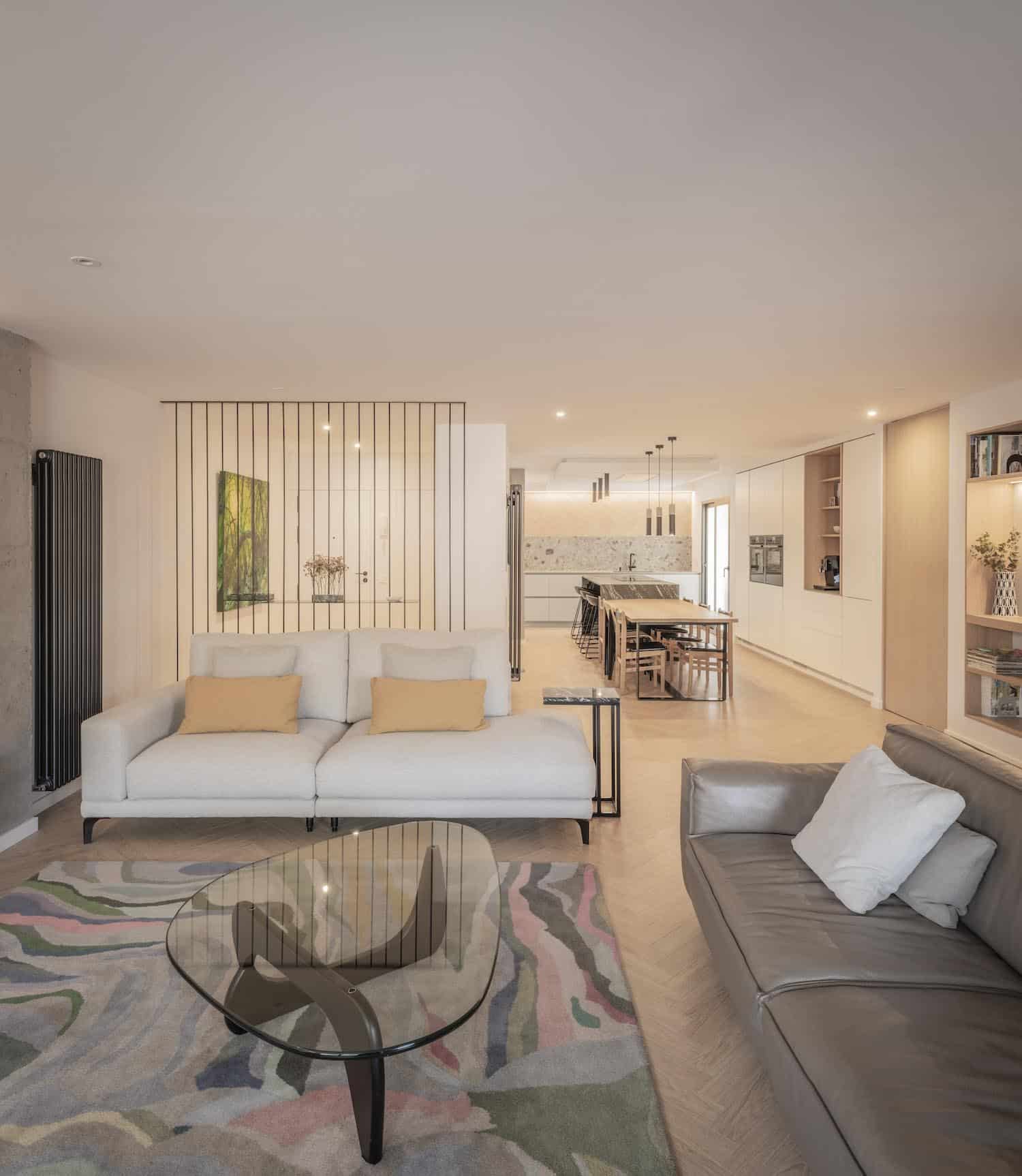 Paseando por su producción, nos topamos con la armonía estética de Boreal. Esta vivienda, alejada del bullicio urbano de Madrid, responde a los requerimientos de una joven familia que buscaba tranquilidad sin renunciar a la sofisticación. Aquí, Estudio Ibarra redefinió la concepción de las estancias, fusionando la tradición del enfoque nórdico con una propuesta contemporánea que sorprende desde el primer vistazo. Inspirada en Noruega —país donde residieron sus habitantes— se encuentra rociada por una aurora de color que renueva el estilo escandinavo.