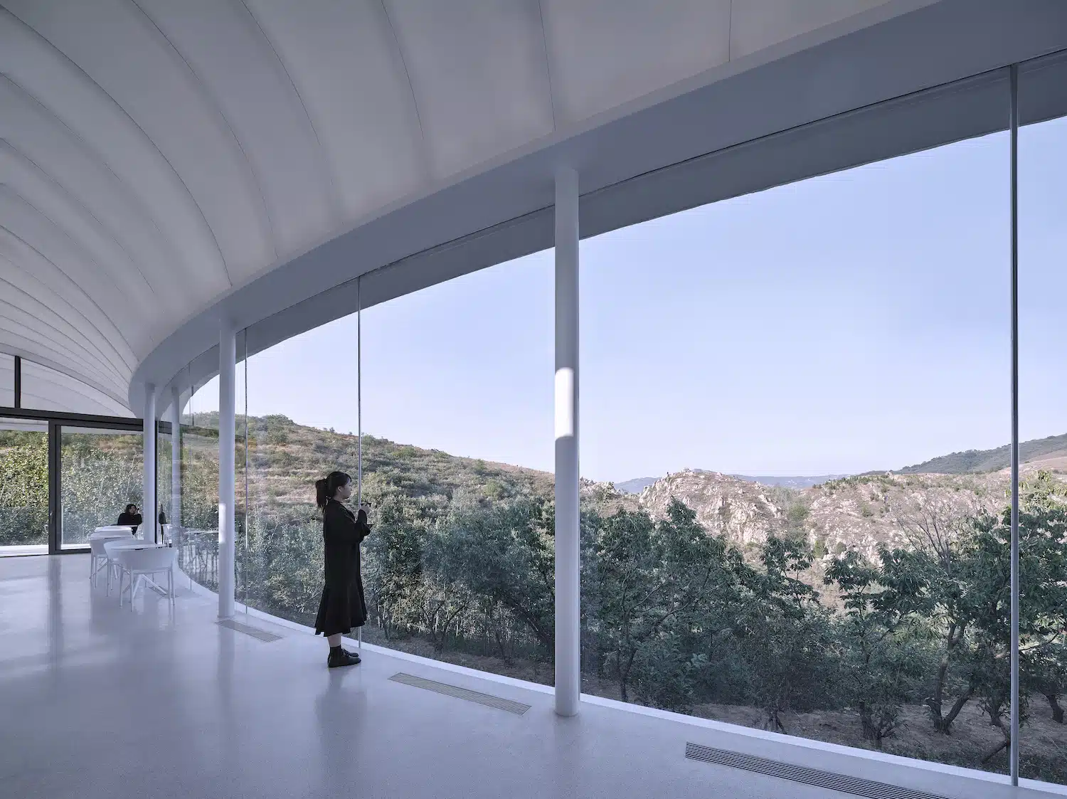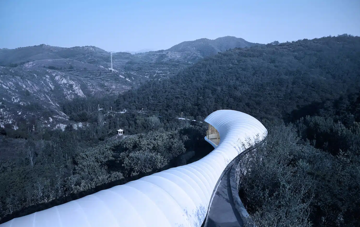 Diseñado por gad·line + studio, el Estudio Jiunvfeng — biblioteca, bar y mirador— es un gran volumen curvo y amébido que reposa níveo sobre la orografía del paisaje del monte Tai.
