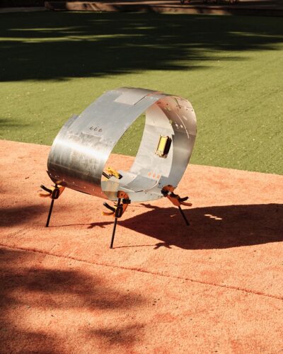Un porvenir imaginado desde un enfoque upcycling ingenioso y, al mismo tiempo, revolucionario. Con el atractivo dispositivo de altavoz SSVII Miami —avivado por su sistema de sonido prediseñado— reactivó la plaza central del hotel como el alma de la fiesta. Esta figura de madera contrachapada se asegura con unos tornillos de color amarillo y danza sobre sus ruedas rojas. Su silueta de tótem le otorgaba el papel de líder o emblema del grupo. Y, al son del reciclaje, los recortes de la producción se guardaron y se utilizaron para generar una curiosa silla envuelta en planos y formas angulosas.