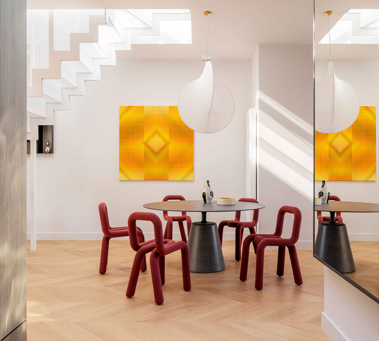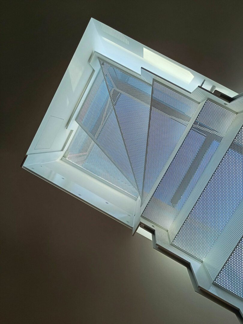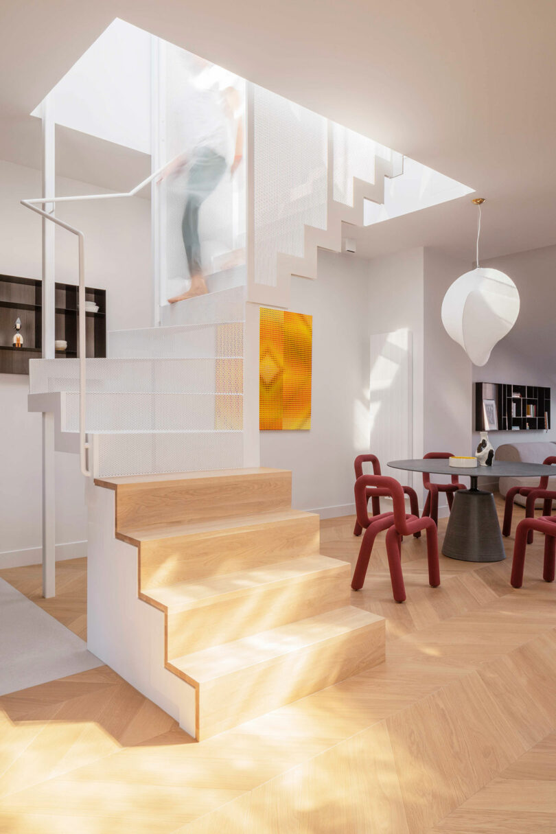 Foksal se organiza alrededor de un punto concreto: una escalera delicada y ligera que evita obstruir la entrada de luz entre las plantas. Fabricada en chapa de acero perforada y posteriormente lacada en blanco, actúa como tamiz y proyecta un juego de sombras móviles sobre el interior. Su ligereza es tanto constructiva como perceptiva, un puente entre niveles que nunca roba protagonismo a la iluminación natural.