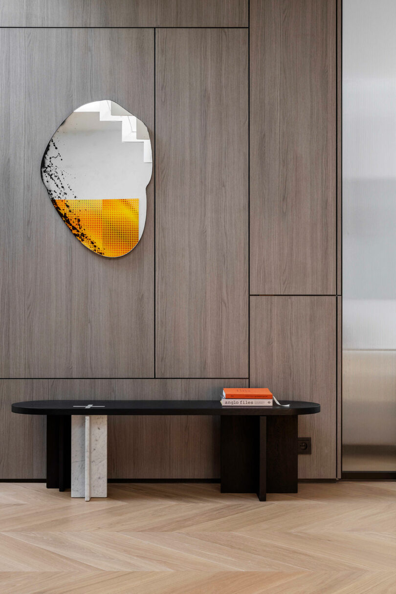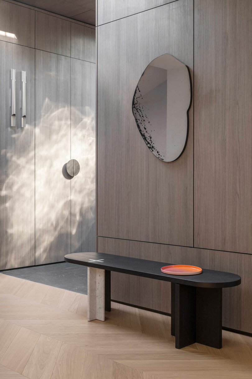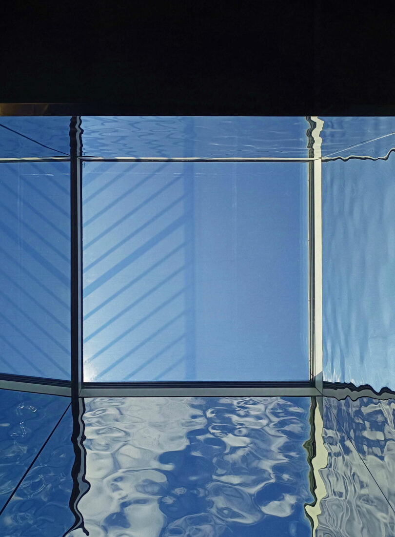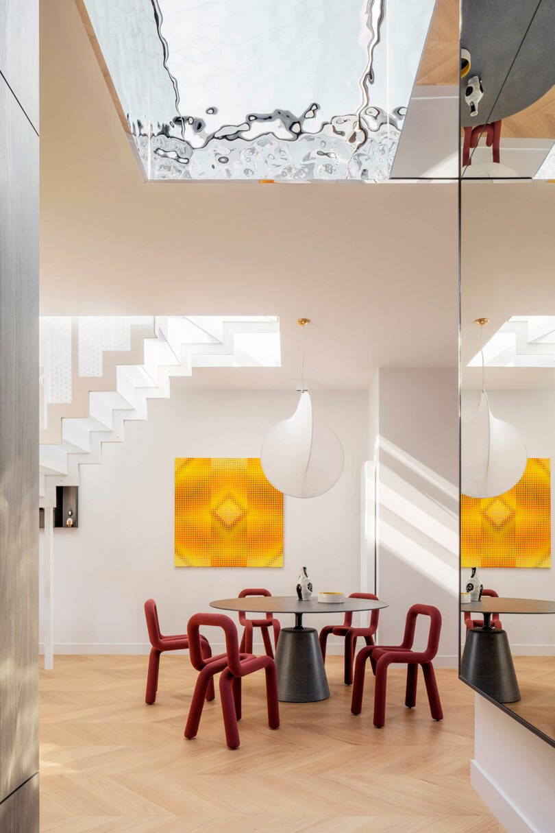 Ante la compleja orografía heredada, Indoor Projekt ha empleado superficies reflectantes que amplifican y redistribuyen la claridad. Los espejos aparecen como zonas fragmentadas que acompañan la geometría de la casa potenciándola, incluso en el falso techo del salón. La importancia de este recurso se percibe también en la disposición de ventanas y claraboyas para expandir la luminosidad. Por eso la vivienda cambia a lo largo del día: abierta por la mañana e íntima al caer la tarde.