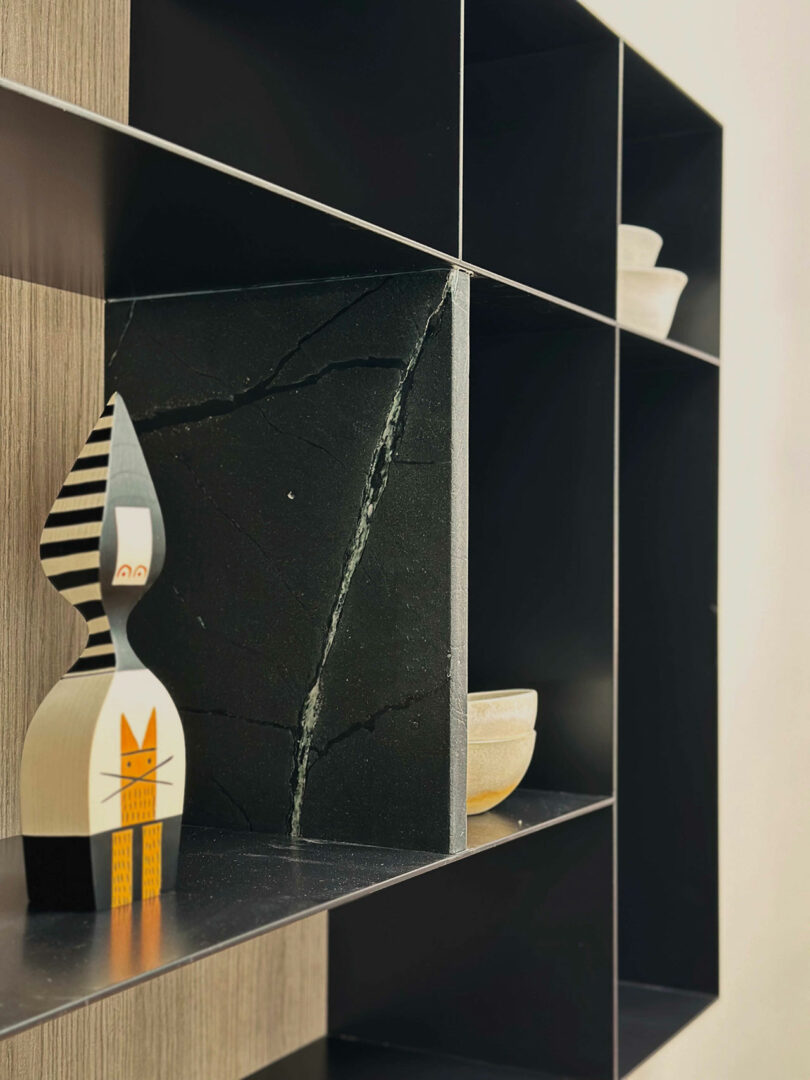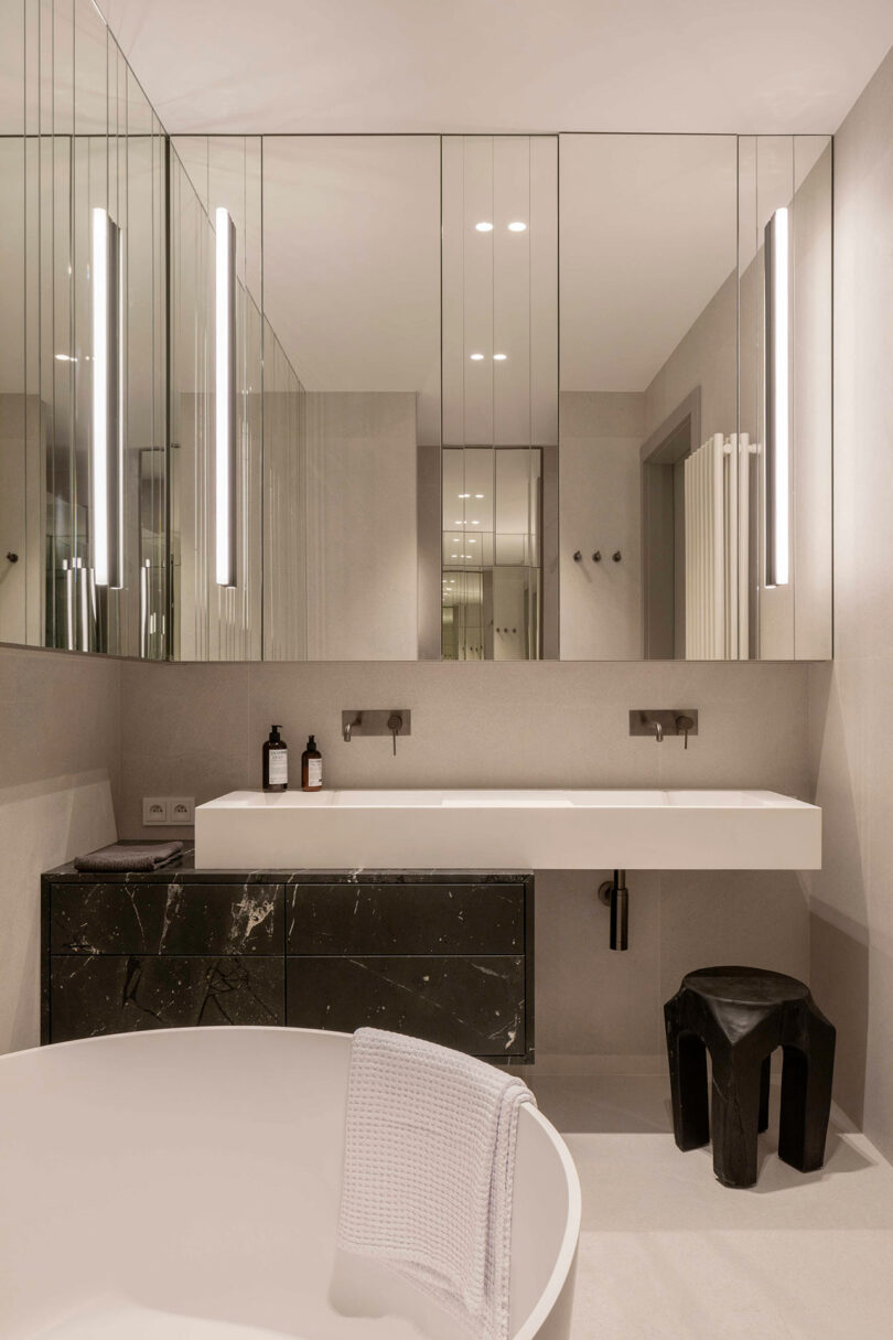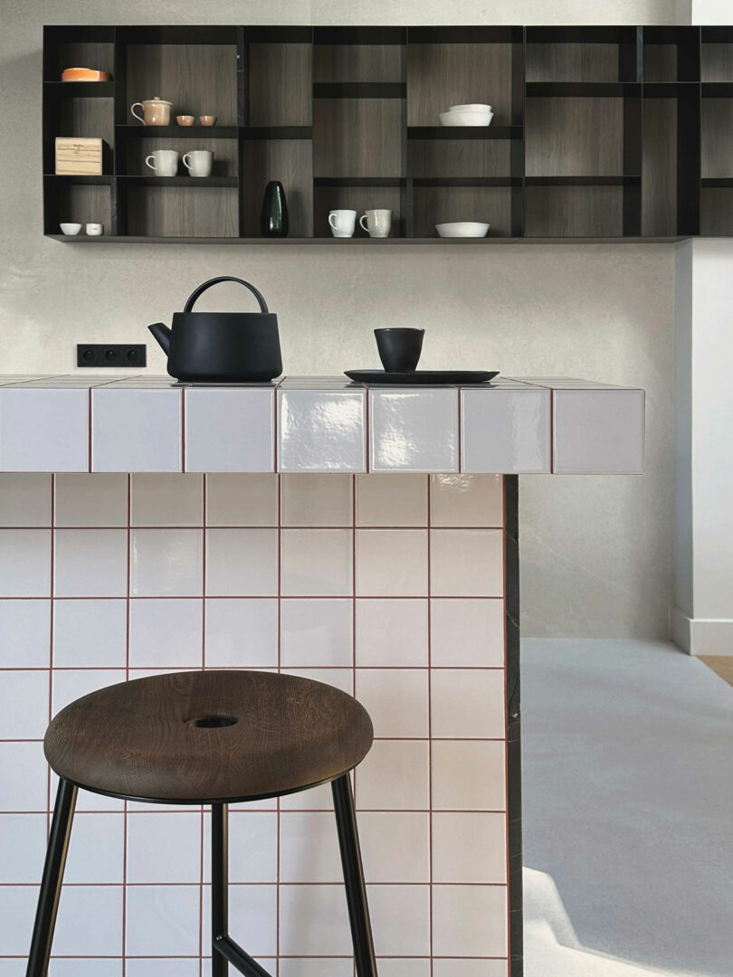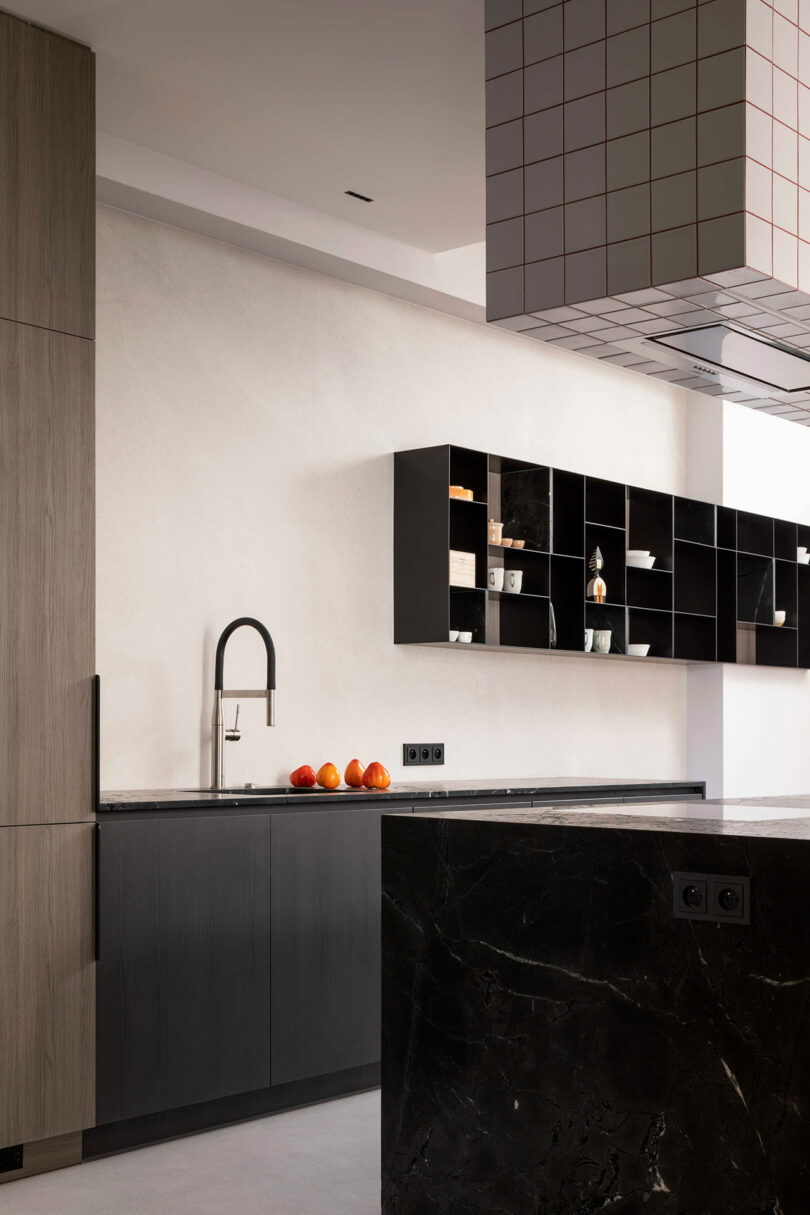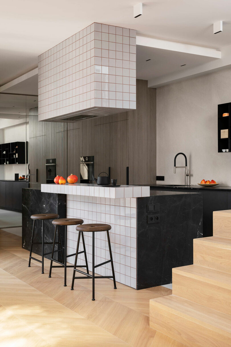 La estrategia del estudio polaco se articula en torno a un juego cromático de claros y de oscuros, con su máxima expresión en la cocina. En ella, la isla negra azabache contrasta con un alicatado blanco inmaculado, estableciendo una contraposición entre gravedad, ligereza, fondo y figura. El metal, la madera en dos tonos y la piedra se combinan en una paleta reconocible y coherente. Y pese a la contundencia de los componentes, la atmósfera que generan es cálida y hogareña.