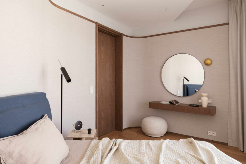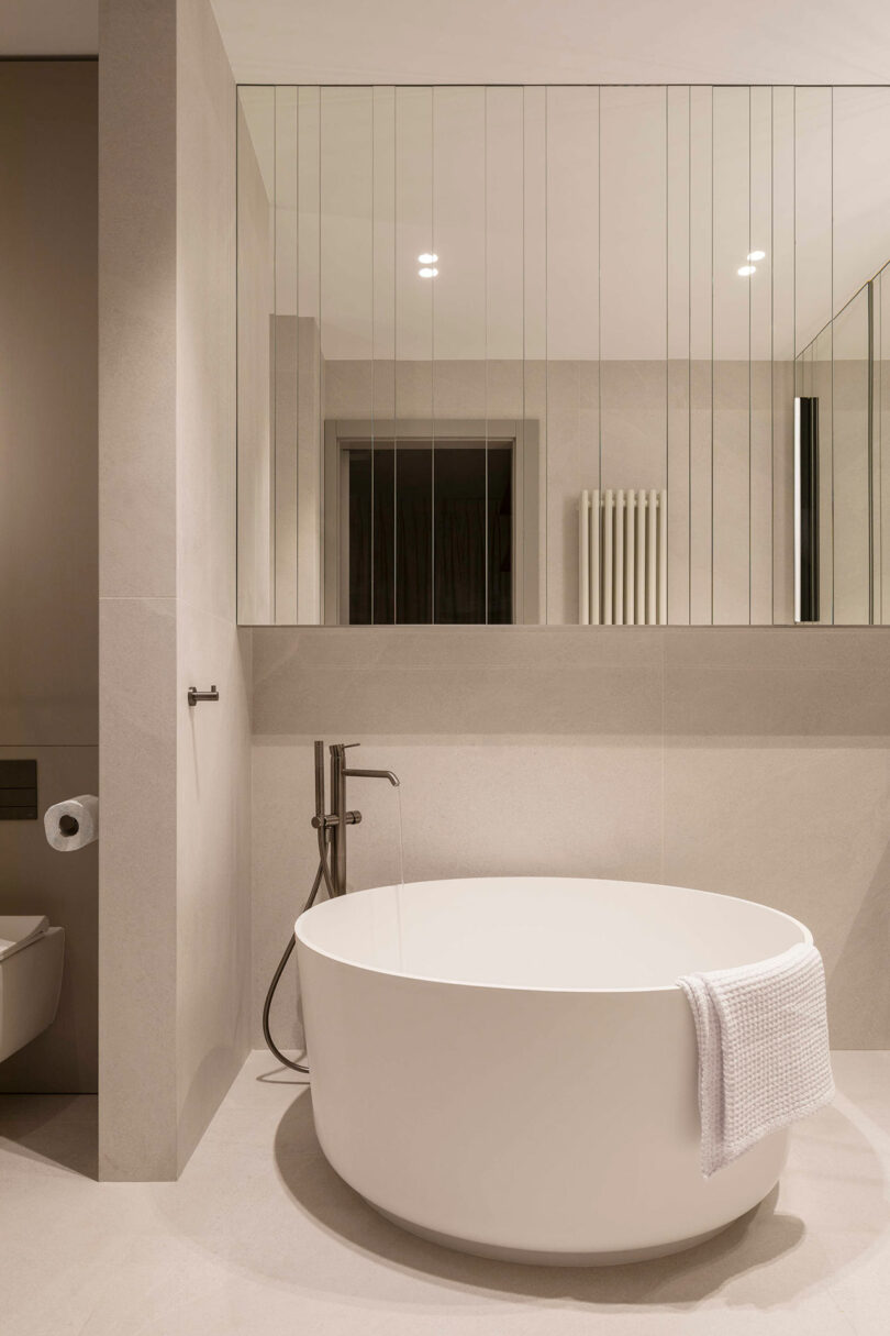 El mobiliario escogido introduce un despunte cromático: sillas escultóricas, mesas redondeadas y piezas con carácter aportan energía dentro de la serenidad general. Como en un buen escenario, cada objeto cumple un papel dentro de la coreografía espacial; mientras que la distribución interna responde a la necesidad de integrar lo social con lo privado sin perder continuidad. Por un lado, la cocina se conecta directamente con el salón, donde los acabados refuerzan la amplitud. Por otro, dormitorios y baños se inundan de materiales como madera de nogal y textiles suaves, que envuelven en un ambiente más recogido. Se percibe en el baño principal, organizado en dos áreas, donde una ducha de cristal transparente y una bañera escultórica podrían exhibirse en cualquier galería artística.