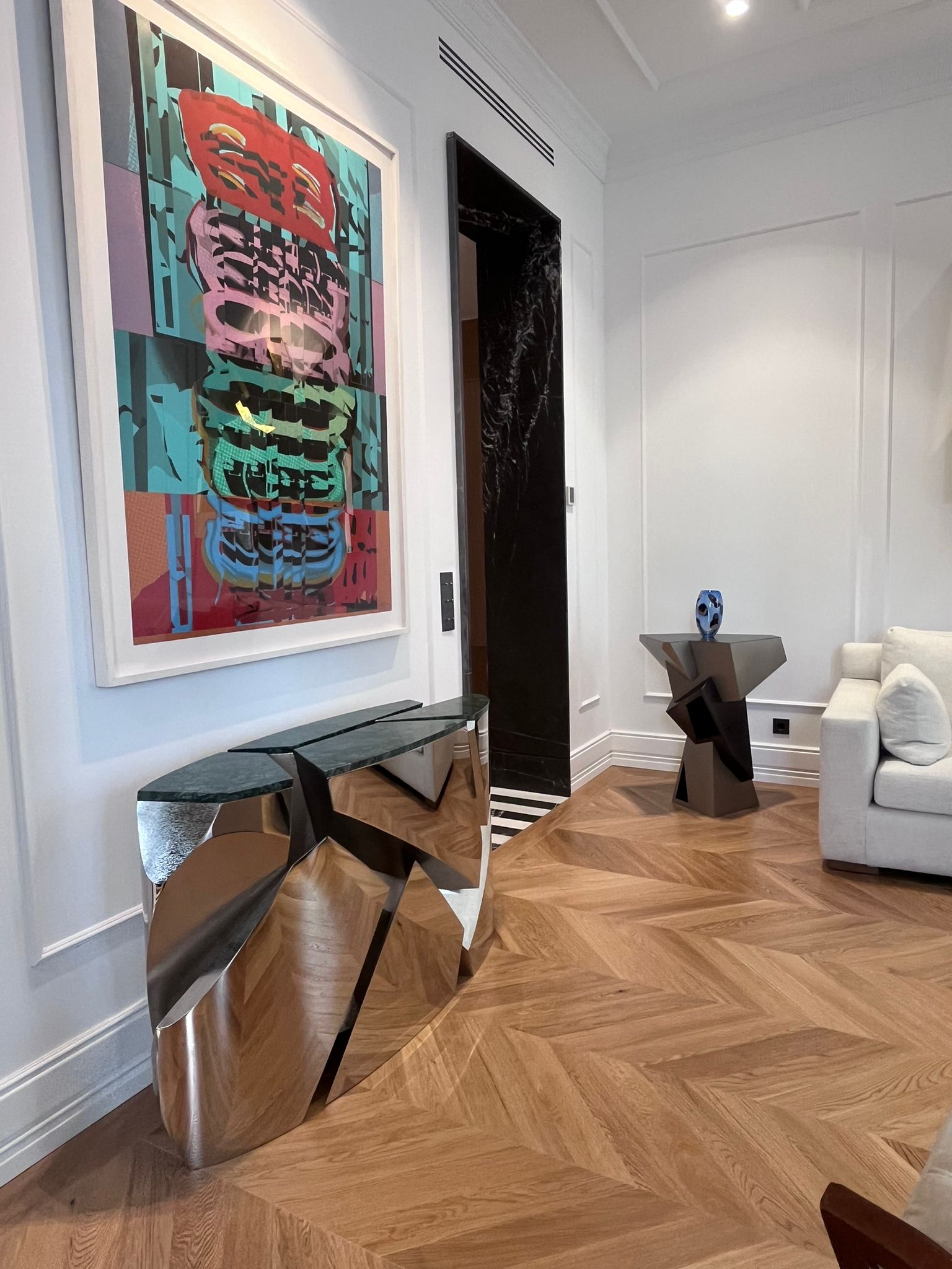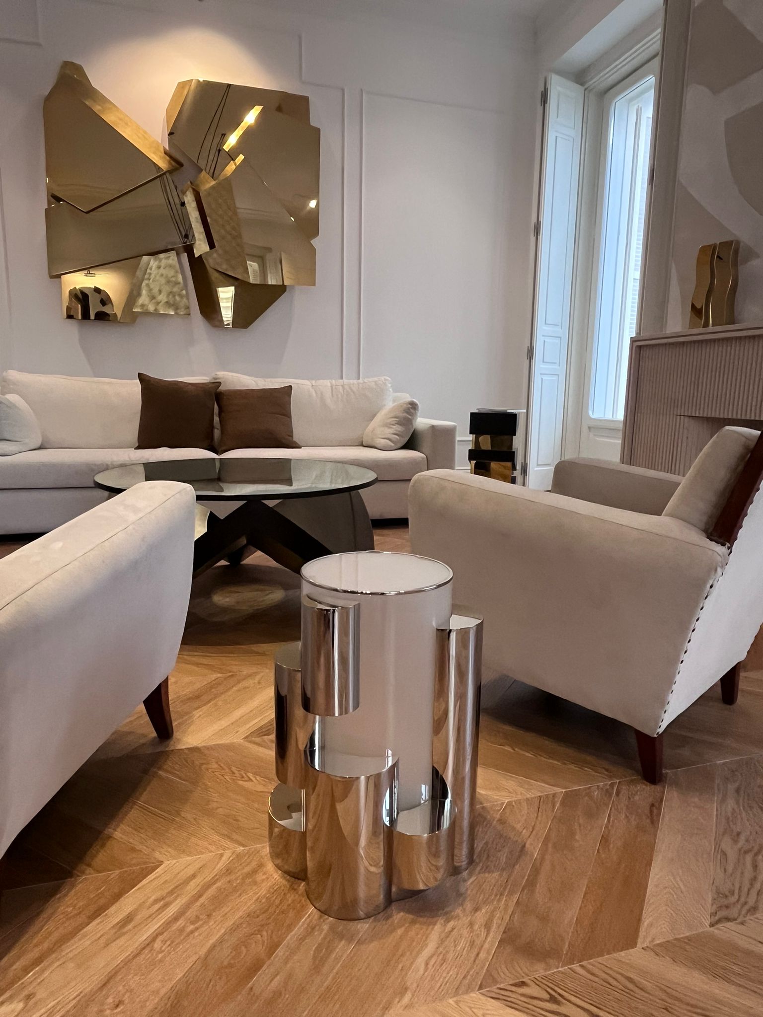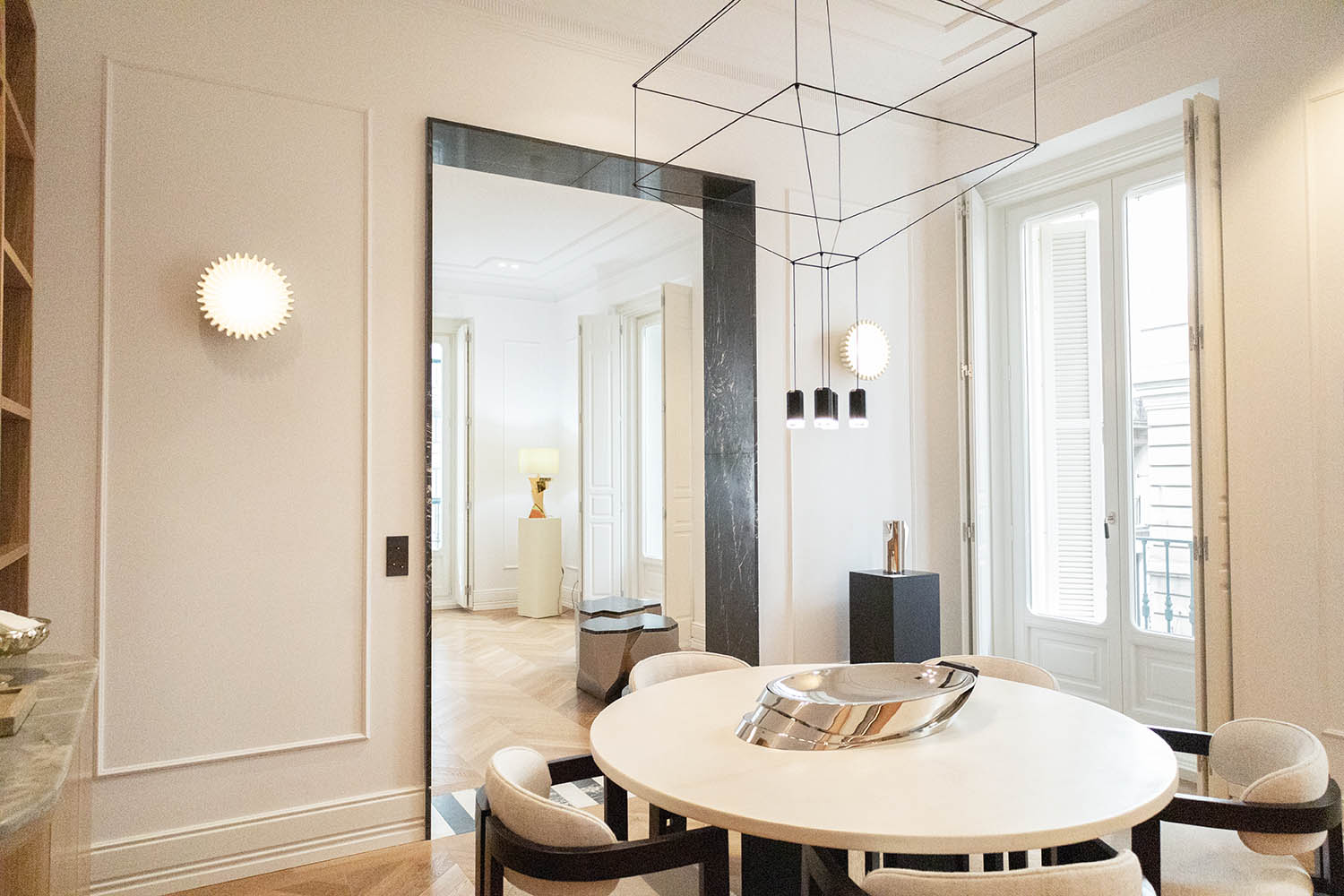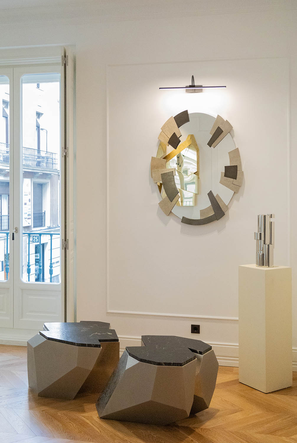 Por un lado, el oficio heredado de la casa madrileña Garrido —dirigida hoy por Juan y Paloma Garrido—, que lleva la orfebrería y la platería al campo del diseño contemporáneo, preservando una actividad artística en riesgo de desaparición. Por otro, la maestría de Mónica Diago, fundadora de Lumier Casas Boutique, para vincular arquitectura e interiorismo de alta gama a través de un proceso de curaduría espacial. El resultado es un ambiente doméstico perfecto, situado en la calle Barquillo, 26, que Garrido Gallery ha amplificado con su mirada art design.