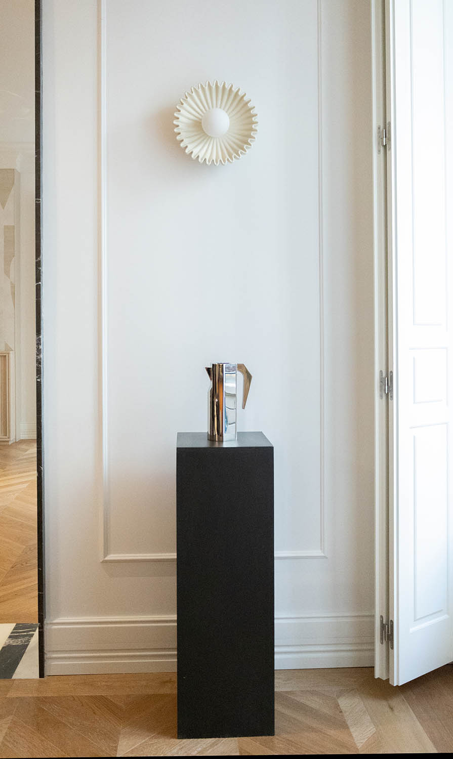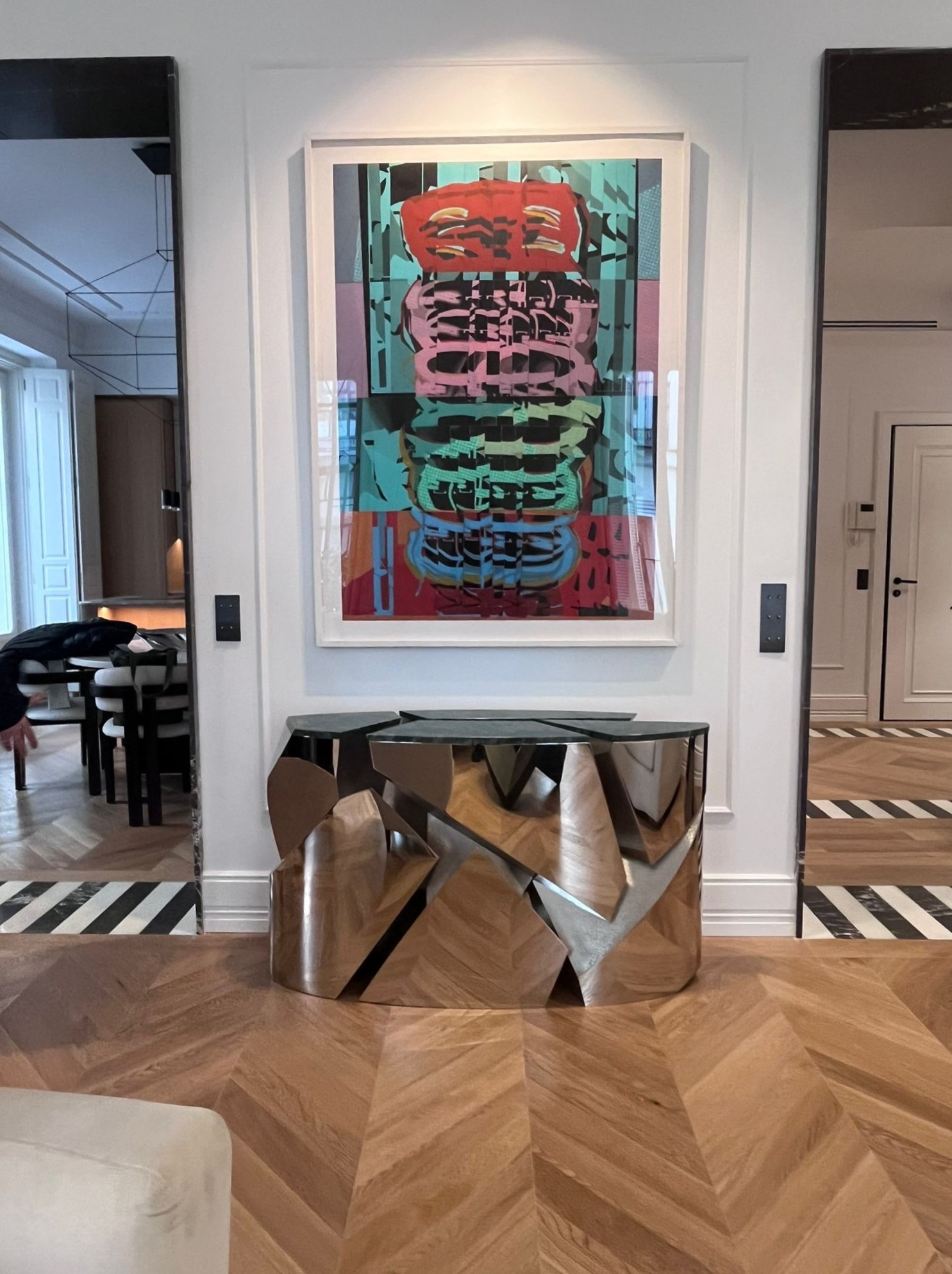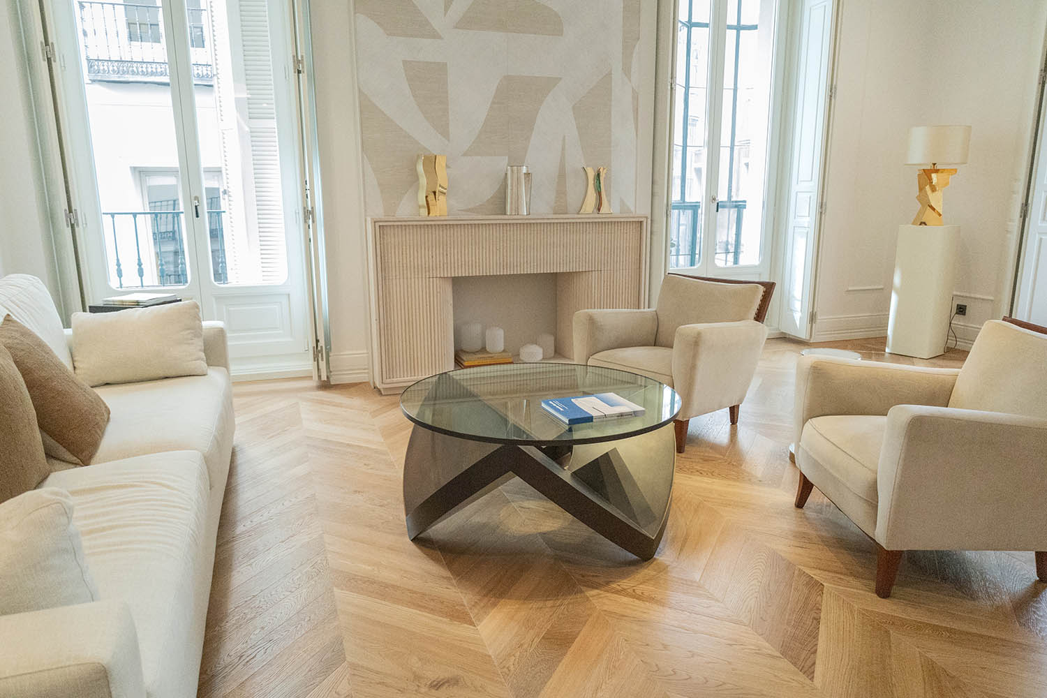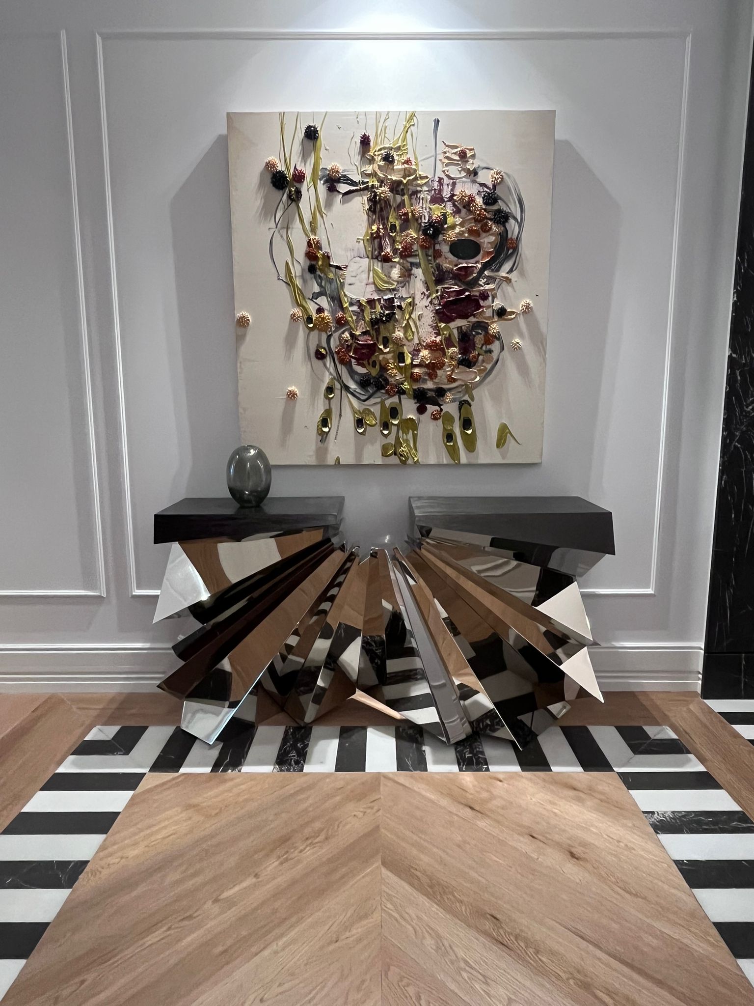 Por un lado, el oficio heredado de la casa madrileña Garrido —dirigida hoy por Juan y Paloma Garrido—, que lleva la orfebrería y la platería al campo del diseño contemporáneo, preservando una actividad artística en riesgo de desaparición. Por otro, la maestría de Mónica Diago, fundadora de Lumier Casas Boutique, para vincular arquitectura e interiorismo de alta gama a través de un proceso de curaduría espacial. El resultado es un ambiente doméstico perfecto, situado en la calle Barquillo, 26, que Garrido Gallery ha amplificado con su mirada art design.