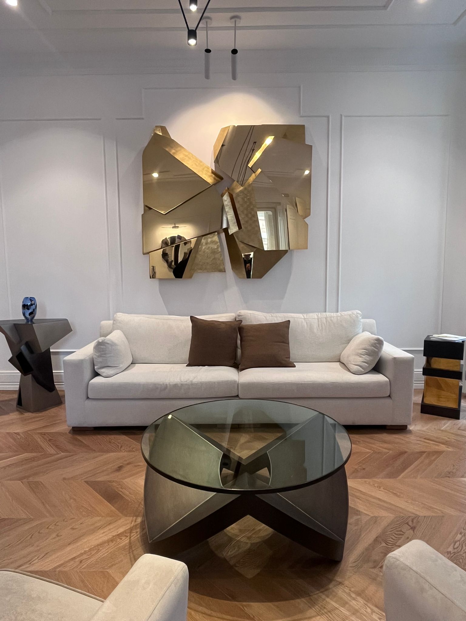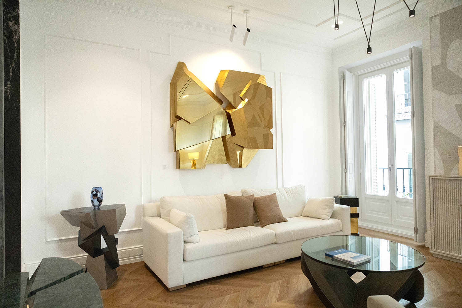 Piezas icónicas de su colección, como Crystal Mirror, Aristas Console Table o las de su serie colaborativa Asprey, abandonan su condición de objetos aislados y contemplativos para insertarse en una escena habitable. Después de su paso por algunas de las ferias más importantes del sector, sus muebles volumétricos avanzan un paso más para mostrarnos de qué manera el collectible design puede infiltrarse en la vida cotidiana. Estructuras cristalinas y formaciones geológicas entablan una sinergia con la arquitectura moderna de la vivienda, sin importar la estancia, para hablarnos de tradición y artesanía, pero, sobre todo, de compromiso. Una experiencia que nos acerca al universo del coleccionismo en primera persona en un contexto de ensueño. Un escenario de autor para un diseño de autor.