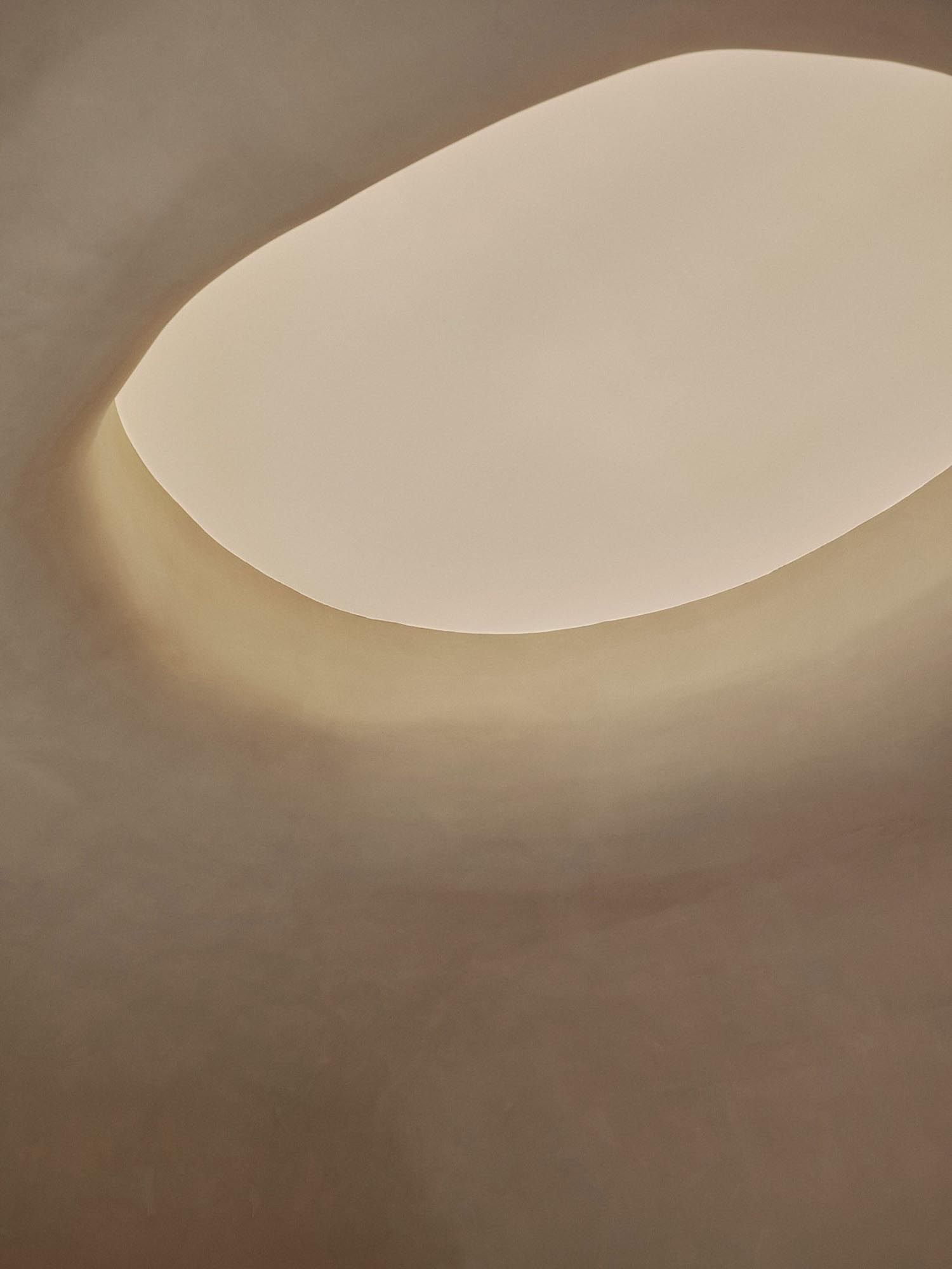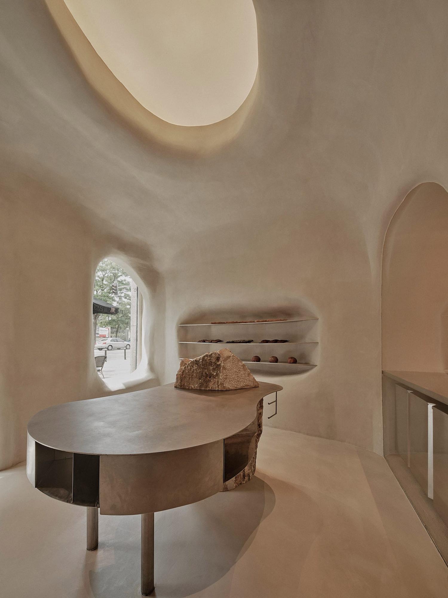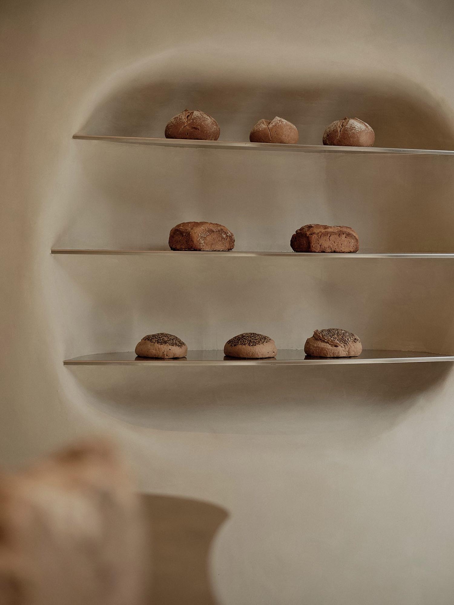 El discurso de Serra se hace reconocible en la minuciosidad con la que proyecta ambientes de introspección. Sin embargo, en FUBA condensa lo doméstico y lo experimental en una tienda comercial con un mobiliario diseñado a medida y pensado como una extensión del propio ecosistema. La mesa de degustación parece brotar del suelo como un afloramiento rocoso, los bancos se integran en las paredes y los estantes surgen como pliegues en el hormigón. En todo esto se percibe una clara intención de plasmar el resultado de un proceso lento, igual que un pan que necesita reposar antes de entrar en el horno. Esa es la cadencia que marca el ritmo de la panadería.