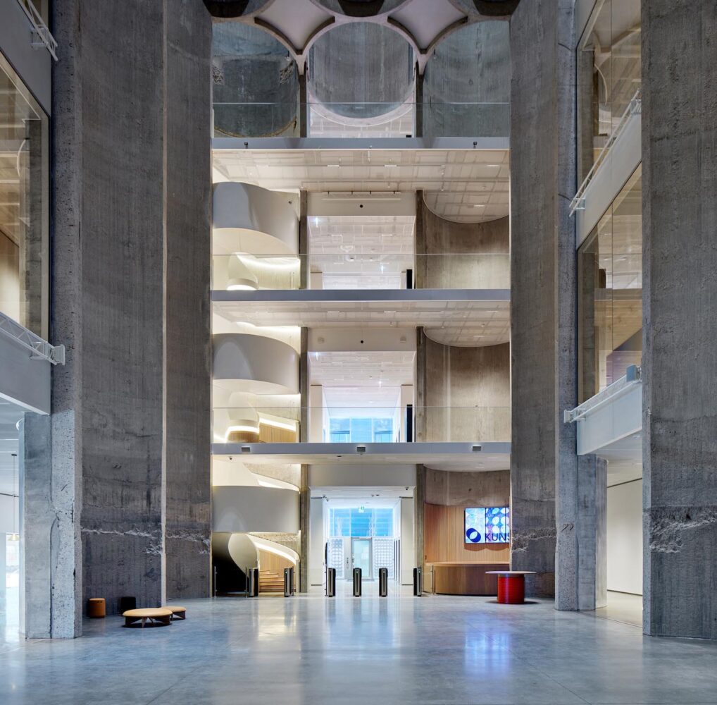 Kunstsilo es simple y llanamente un espacio catedralicio de menos de 40 metros de altura. Un volumen compuesto por los mencionados cilindros y coronado por lucernarios que perfilan —a modo de cornisa áulica— la panorámica de la ciudad. Pero el interior podría recordar a alguna mole brutalista centroeuropea, a la que se le han añadido 25 salas expositivas de más de 300 m2. El gran ambiente diáfano resultante queda organizado en tres alturas y colocado al abrigo de la cara interna de una fachada en hormigón blanco, que hace las veces de alzado y frente marítimo.