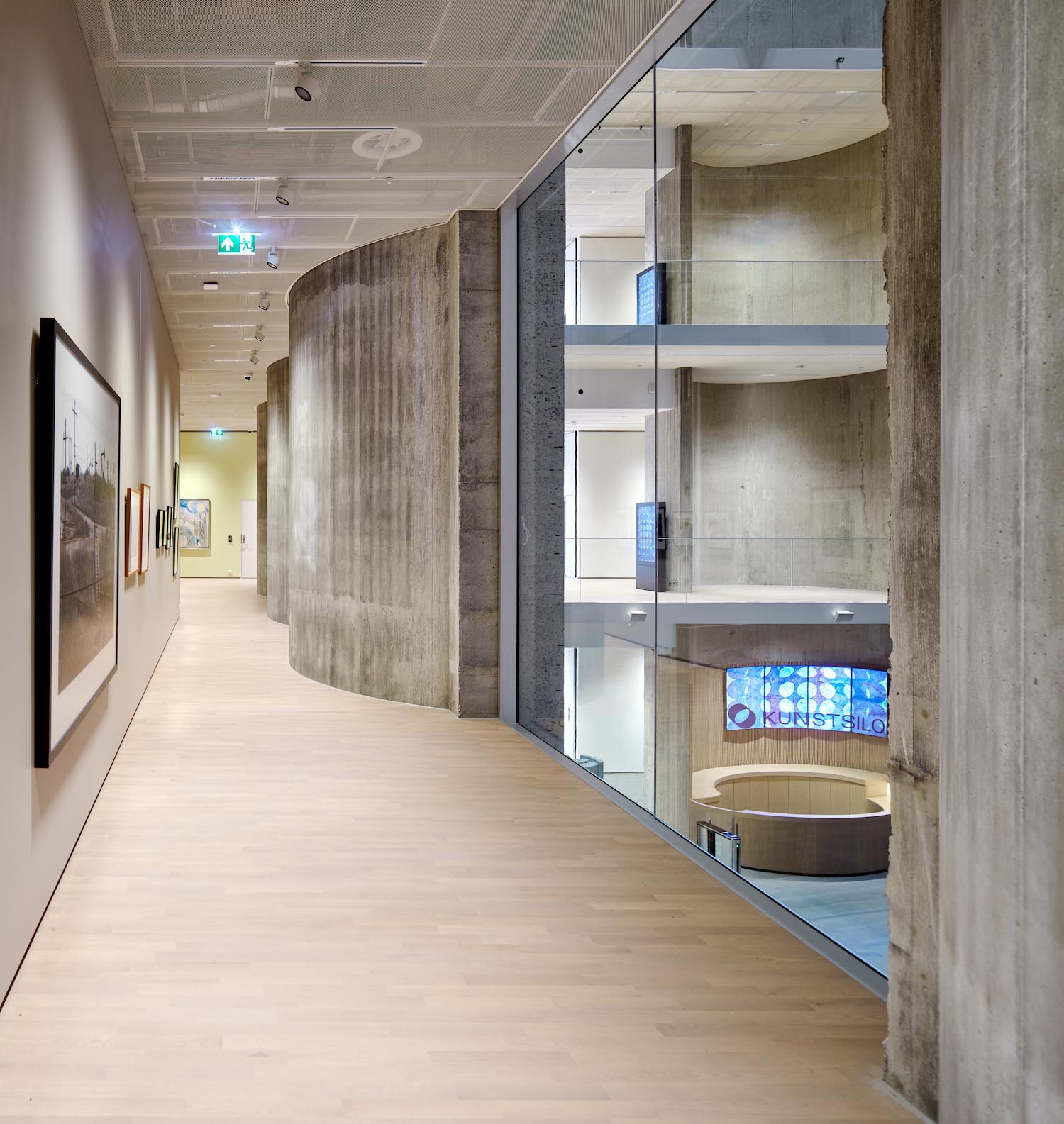 Kunstsilo es simple y llanamente un espacio catedralicio de menos de 40 metros de altura. Un volumen compuesto por los mencionados cilindros y coronado por lucernarios que perfilan —a modo de cornisa áulica— la panorámica de la ciudad. Pero el interior podría recordar a alguna mole brutalista centroeuropea, a la que se le han añadido 25 salas expositivas de más de 300 m2. El gran ambiente diáfano resultante queda organizado en tres alturas y colocado al abrigo de la cara interna de una fachada en hormigón blanco, que hace las veces de alzado y frente marítimo.