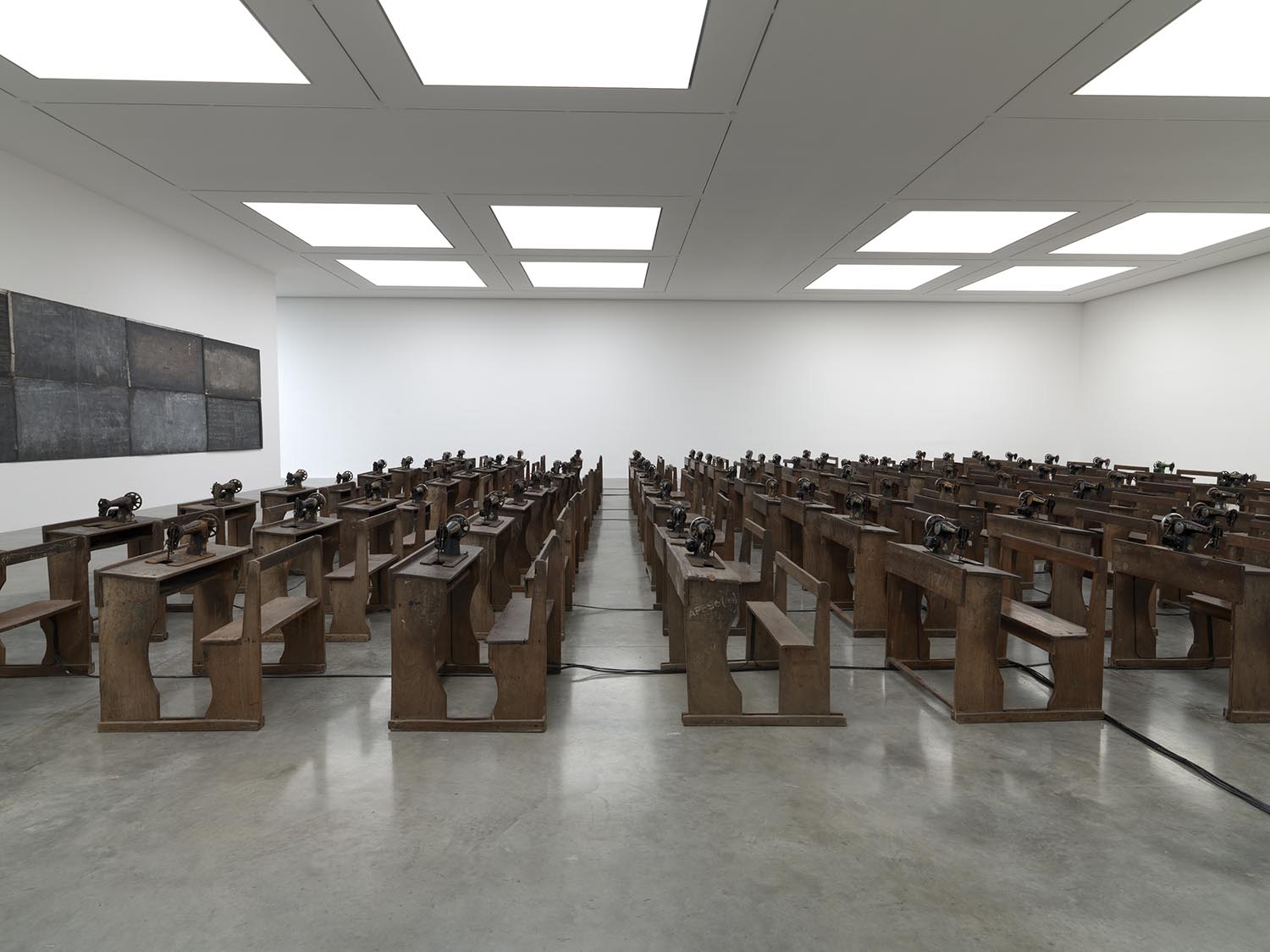 Pero si Parliament of Ghostsera una instalación para ser habitada por los cuerpos futuros, en Capital Corpses(2019), concebida para la White Cube Gallery de Londres, Mahama nos habla de otros cuerpos y otras máquinas. Compuesta como un ensamblaje de pupitres y máquinas de coser, invoca a “aquellas mujeres jóvenes que, privadas de educación formal, las emplean para mantener y proveer a sus familias”.